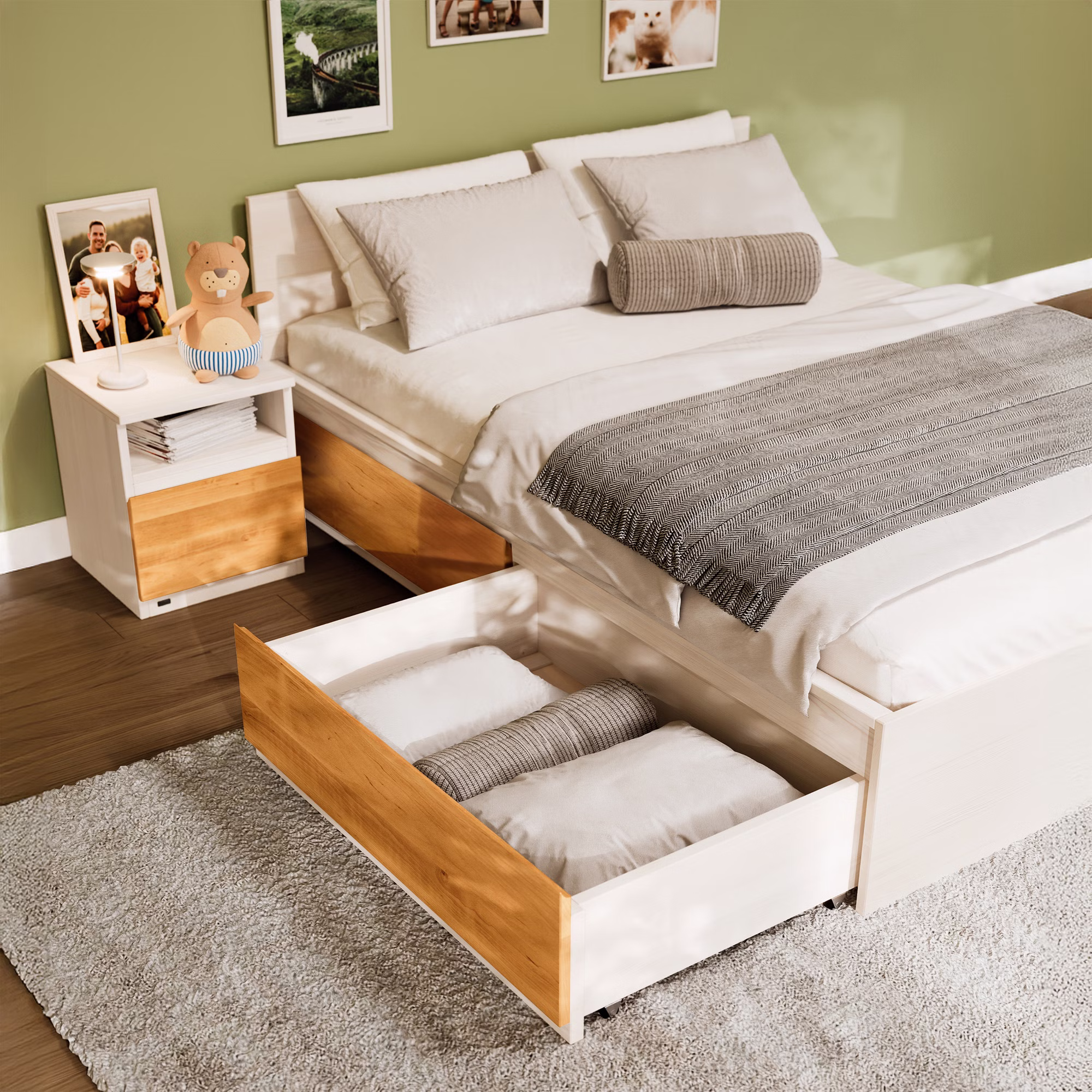 Der Finn Bettkasten kann mit einem Trennbrett (im Zubehör erhältlich) unterteilt werden und sorgt so für noch mehr Ordnung.
