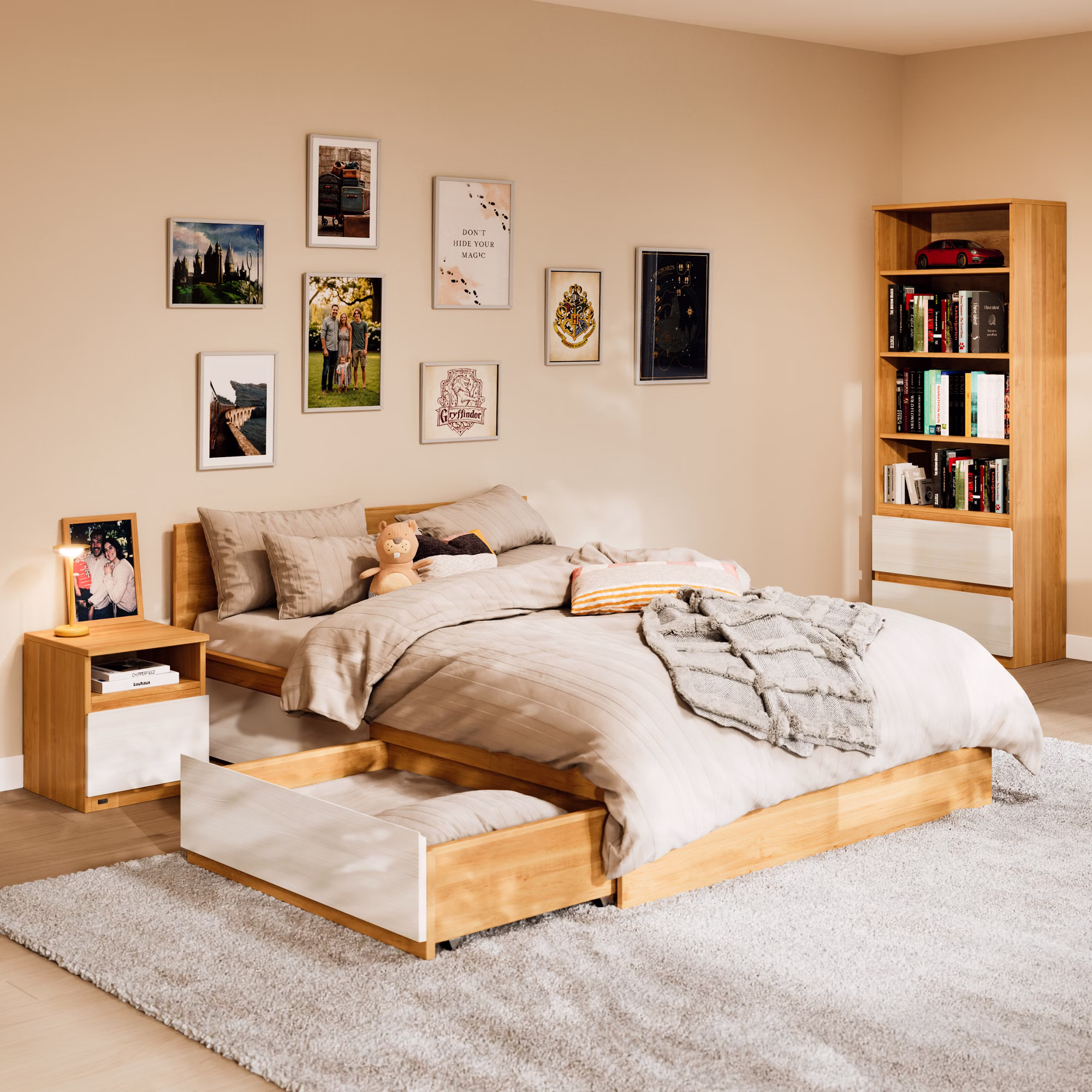 Der Finn Bettkasten für unser Finn Kinder- und Jugendbett 140x200 cm bietet cleveren Stauraum für Bettwäsche, Kleidung oder Spielzeug und lässt sich optional erweitern. Gefertigt aus hochwertigem Bio-Massivholz fügt er sich nahtlos in das zeitlose Design unserer Finn Möbelserie ein. Die Bettkästen lassen sich direkt unter das Bett schieben und sorgen so für Ordnung, ohne Platz zu verschwenden. Auf Wunsch finden bis zu vier Bettkästen unter dem Finn Bett 140 x 200 cm Platz. Die natürliche bioola® Oberflächenveredelung sorgt für eine warme Haptik und unterstreicht den zeitlosen, klaren Stil der Finn Möbelserie.