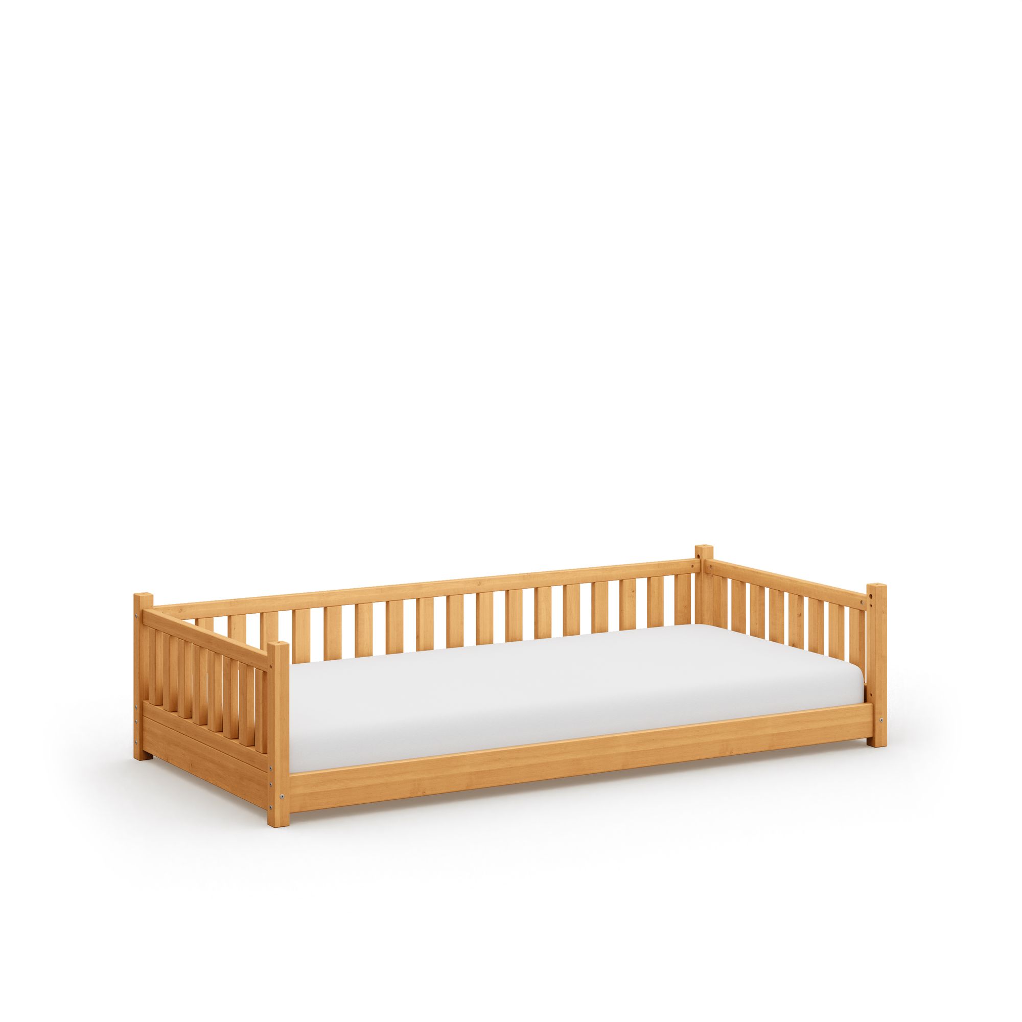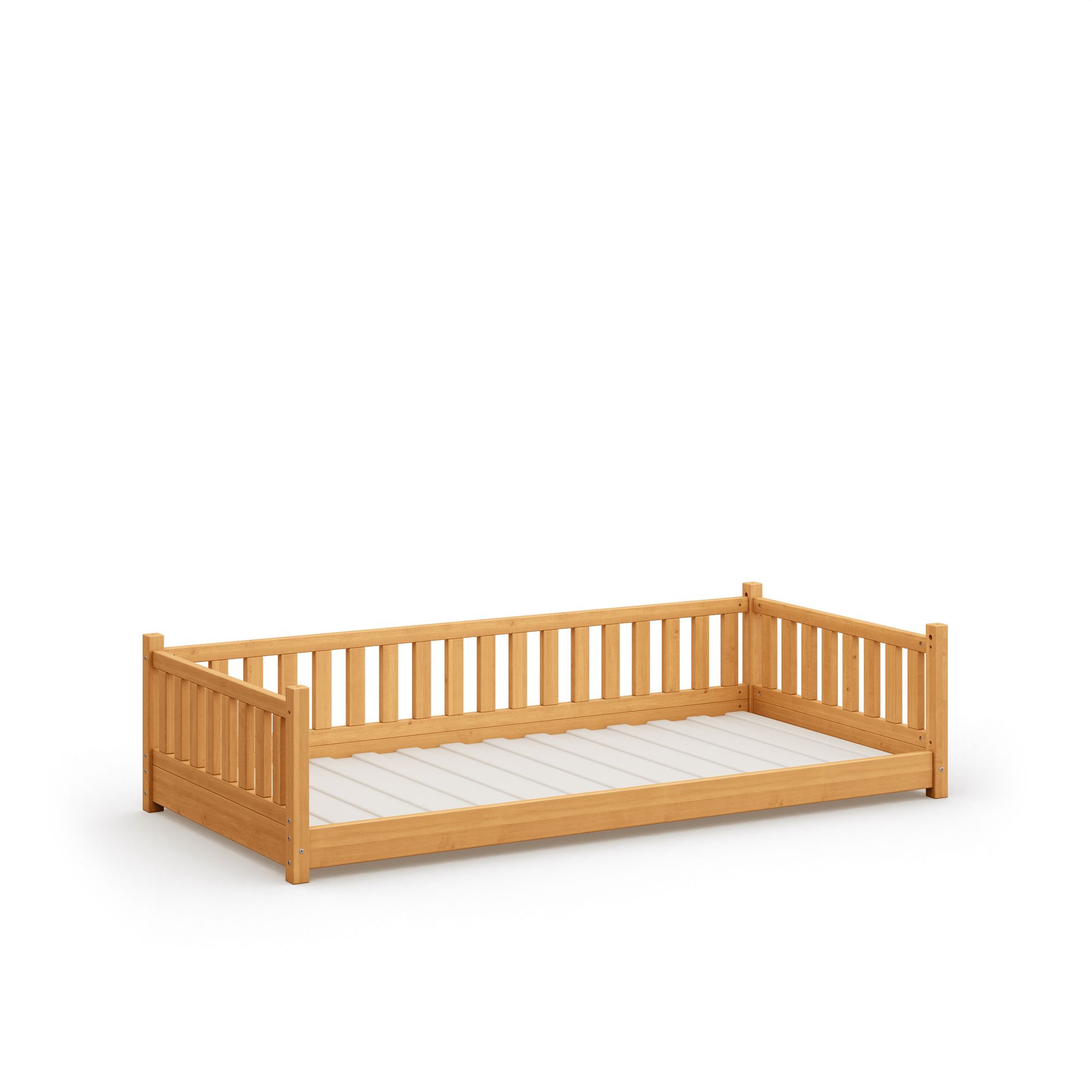 Unser schönes Bodenbett Frieda erinnert, durch sein besonderes Design und die zaunähnliche Umrandung, an eine gemütliche Veranda und strahlt Geborgenheit aus.