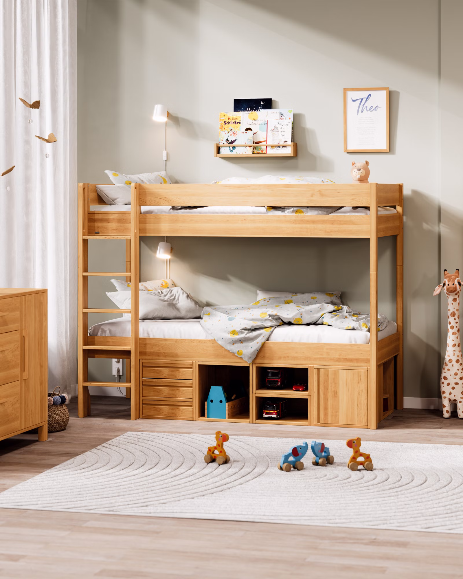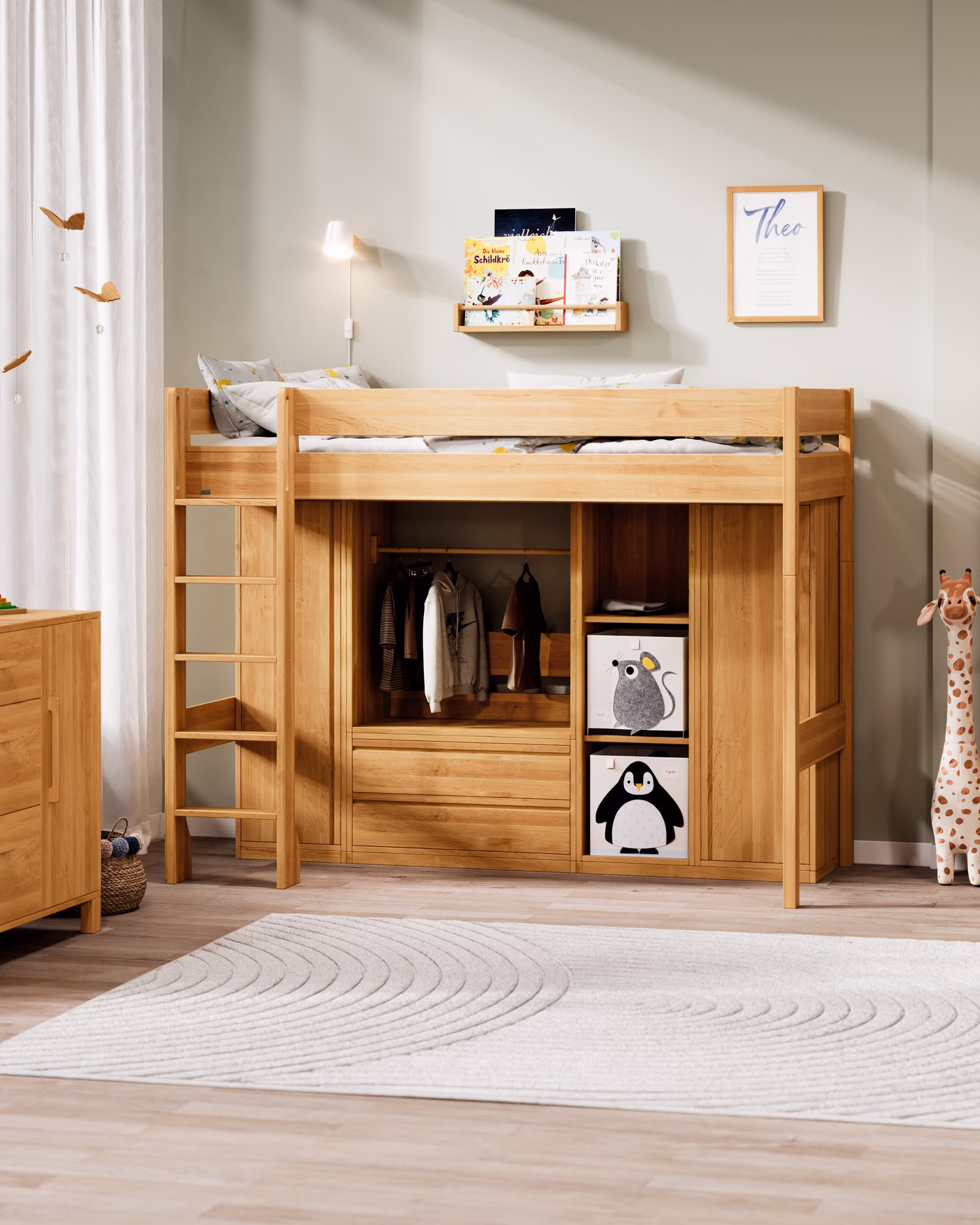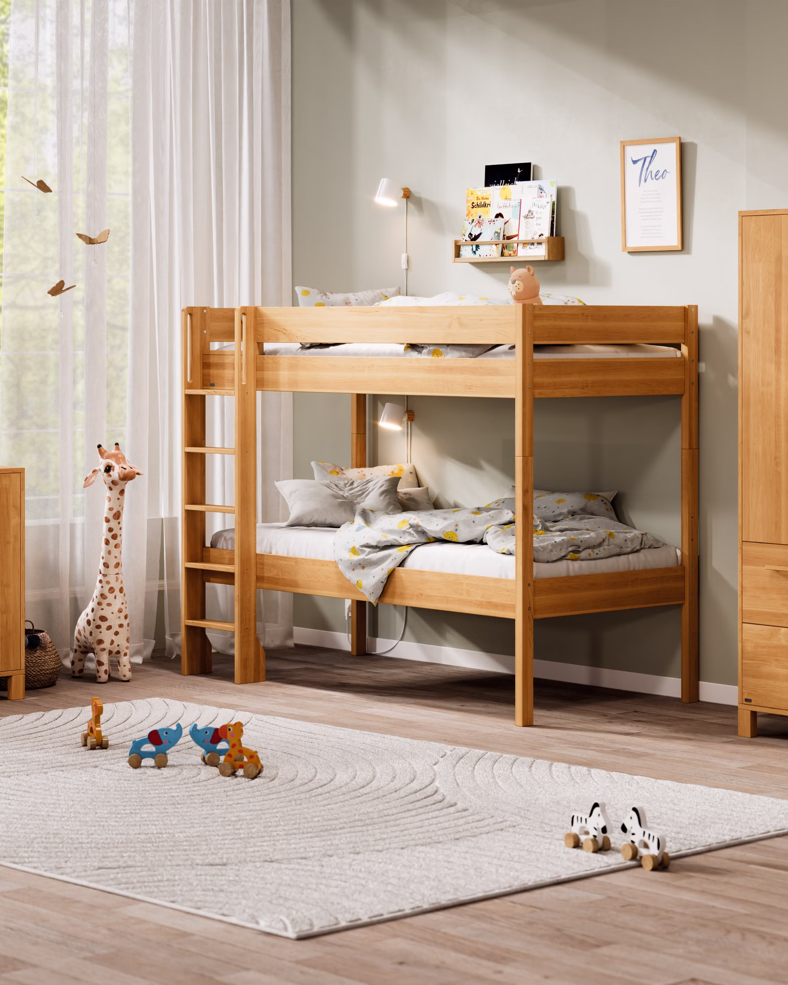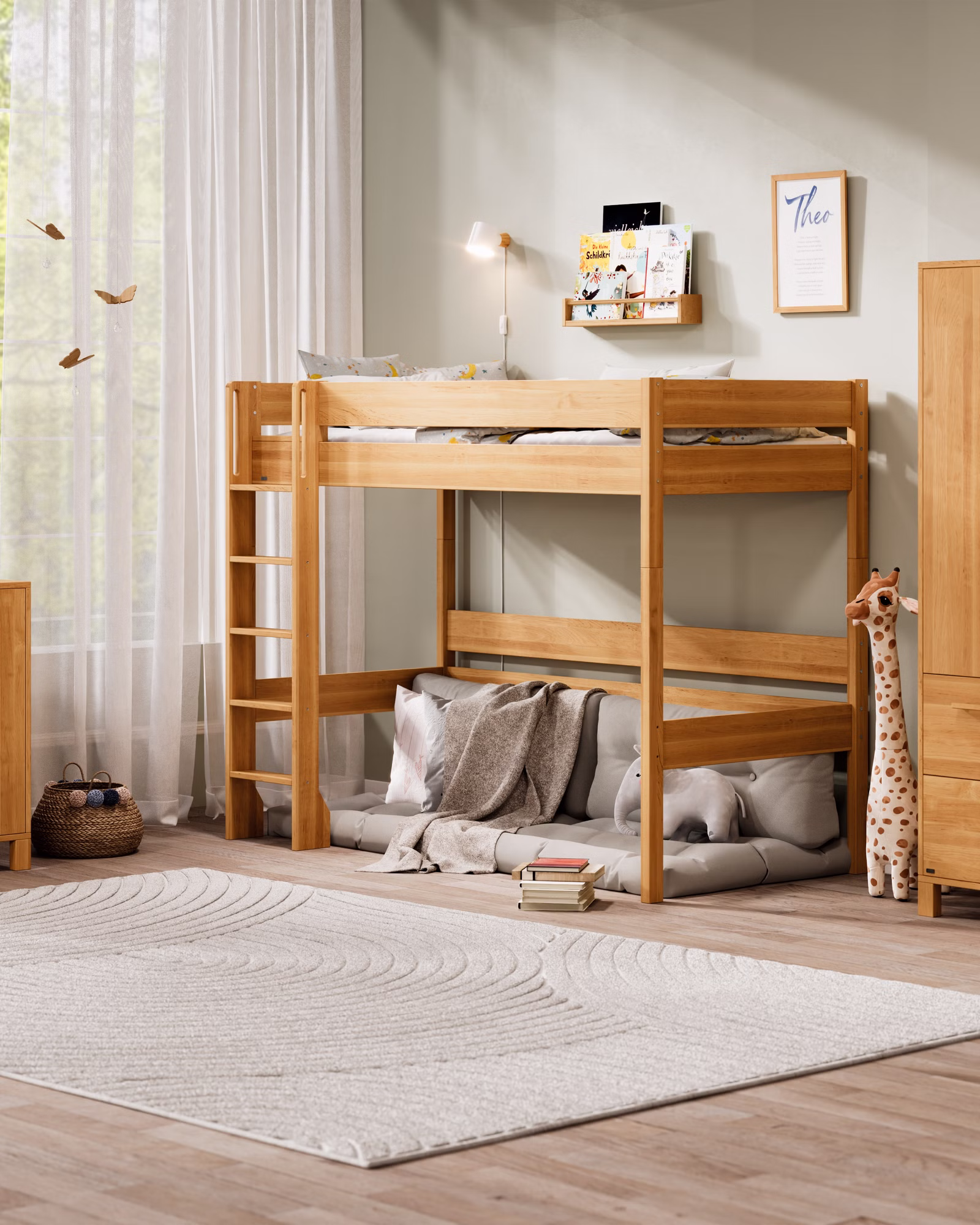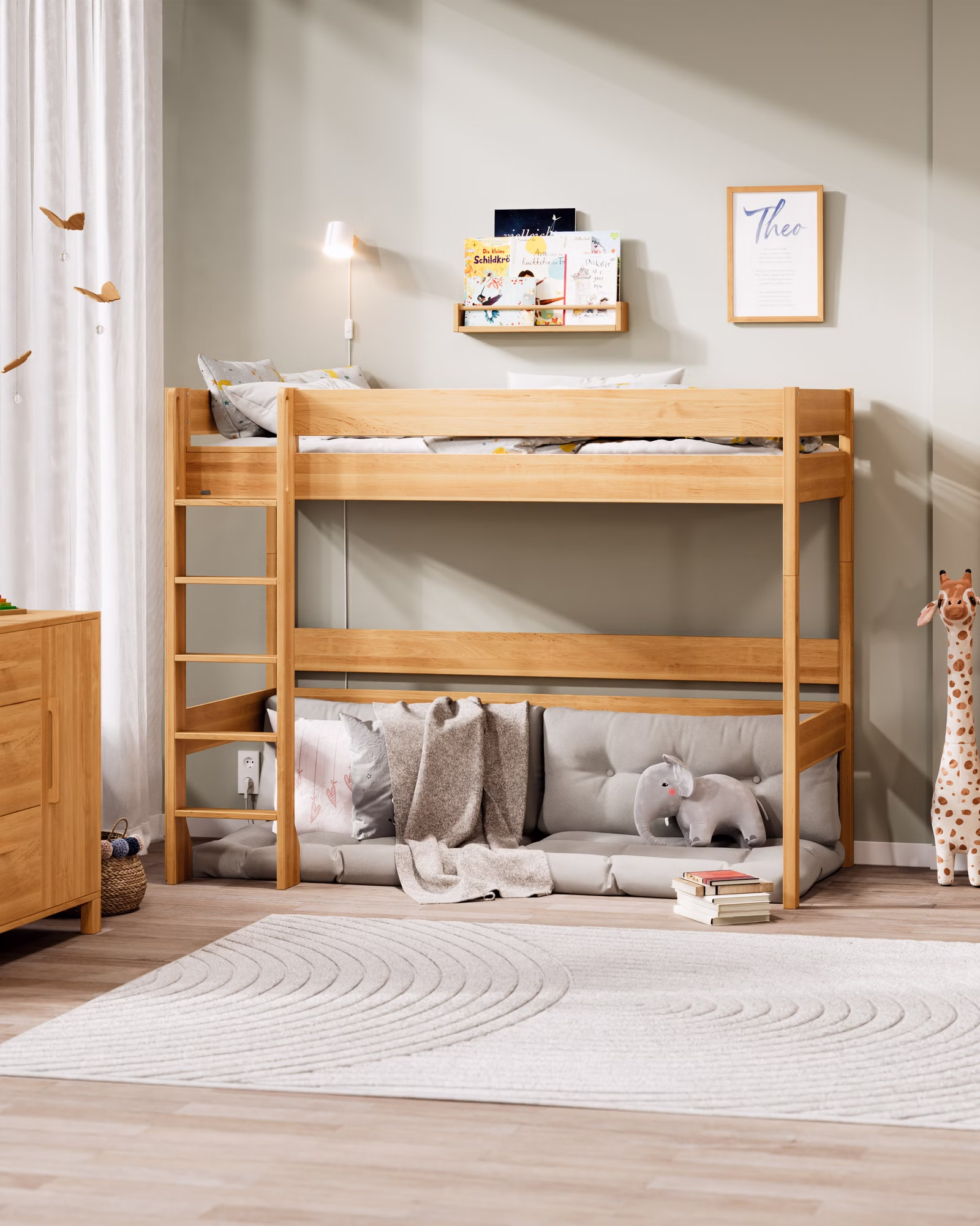 Mit seiner großzügigen Höhe wird Theo zum flexiblen Raumwunder: als Hochbett mit viel Platz darunter oder als Etagenbett für Geschwister und Übernachtungsgäste. Der Umbau ist kinderleicht – so lässt sich Theo jederzeit an neue Lebensphasen anpassen.