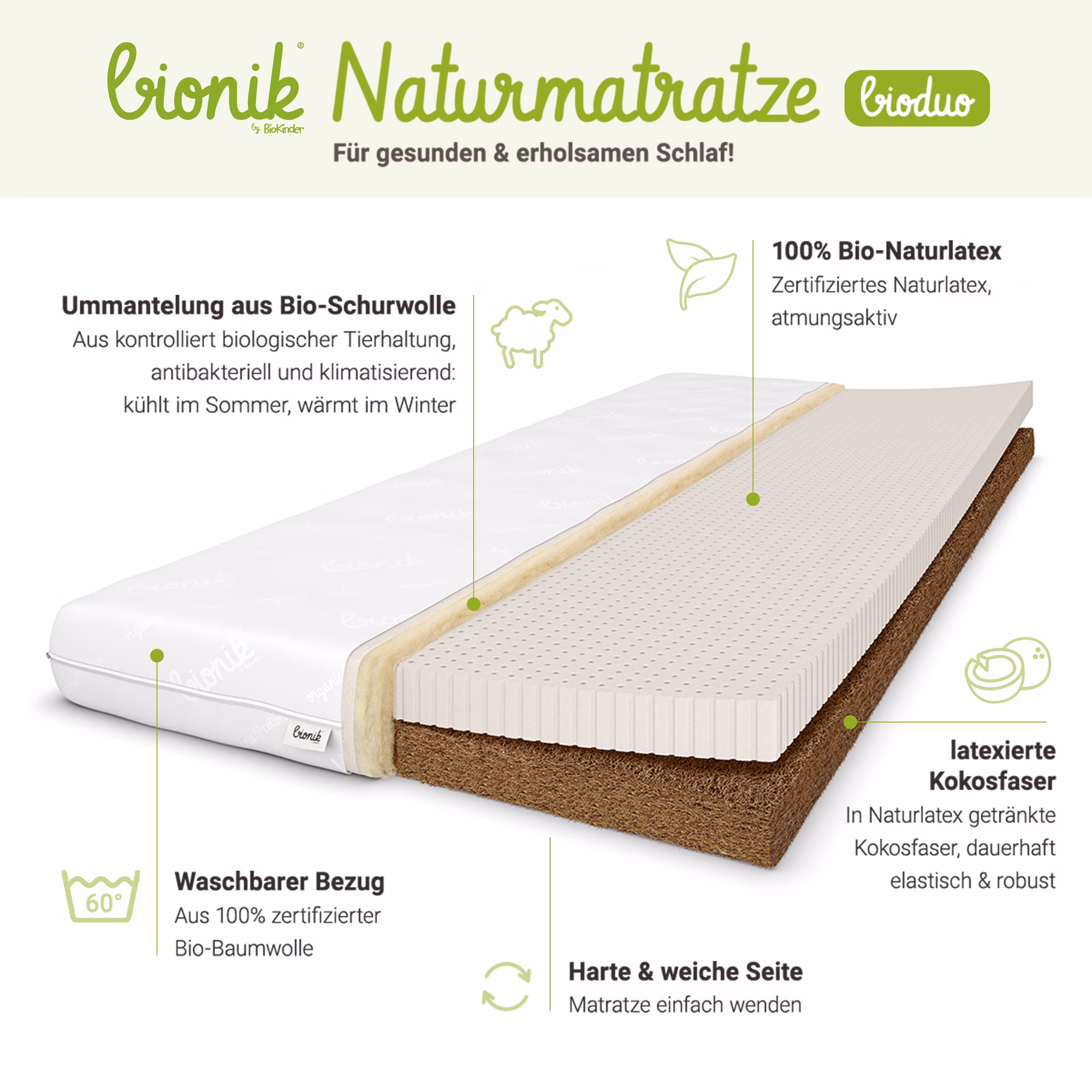 Die bionik Bioduo Kinder- und Jugendmatratze mit einem Kern aus 5 cm latexierter Kokosfaser und 5 cm Naturlatex ist zum Wenden und bietet Kindern und Heranwachsenden die Option einer härteren und einer weicheren Seite, ganz nach Alter und persönlicher Vorliebe.