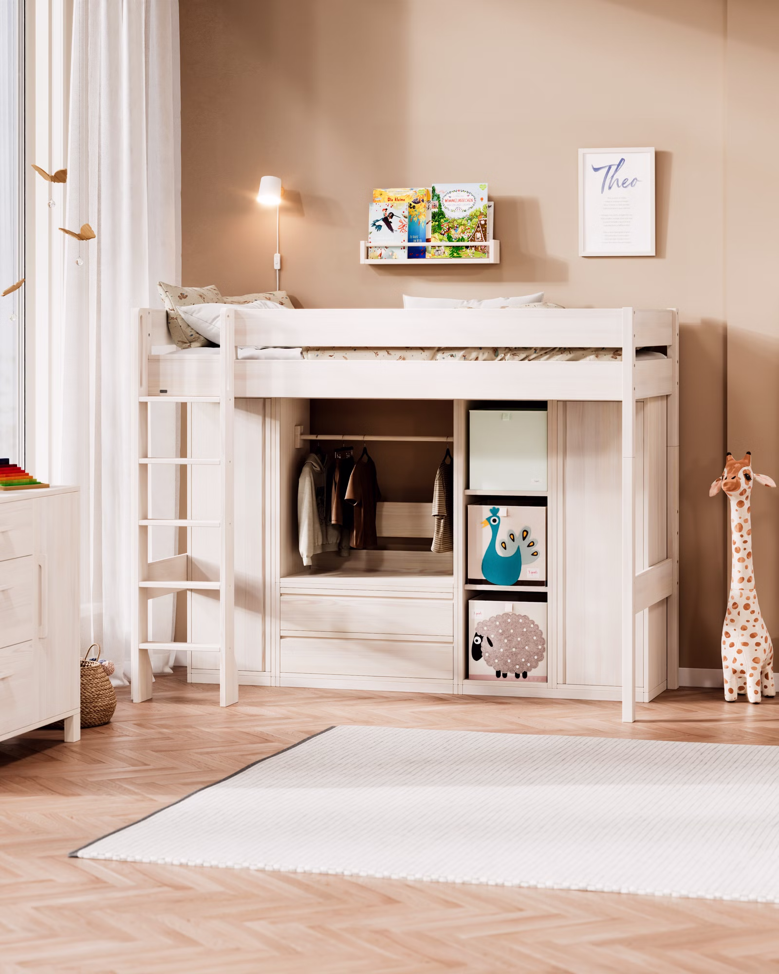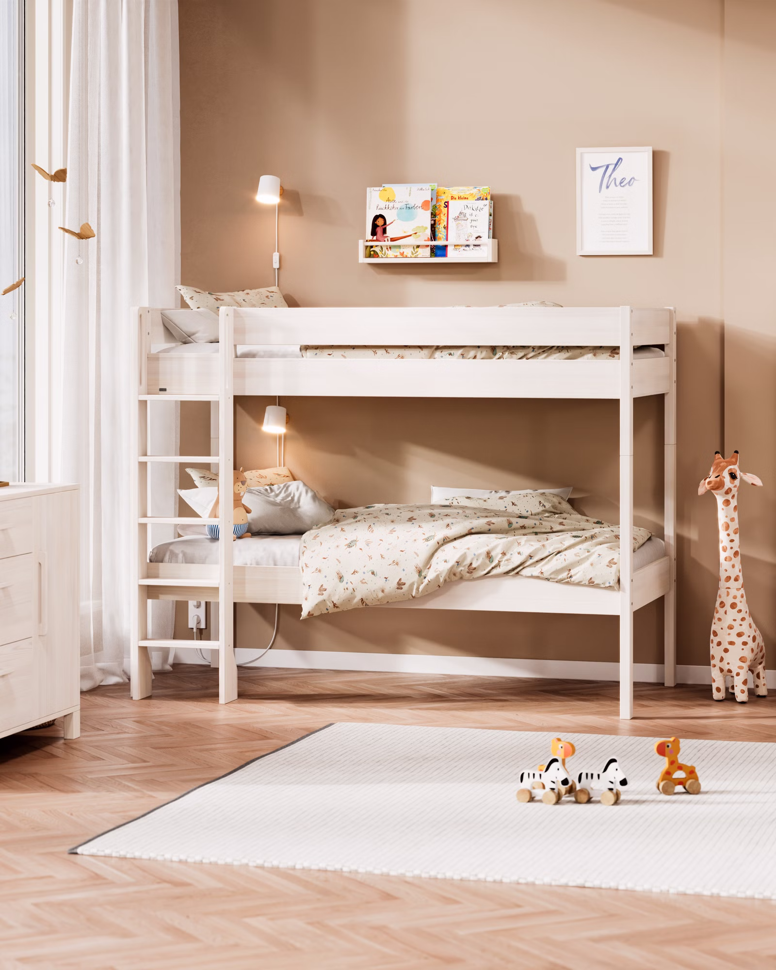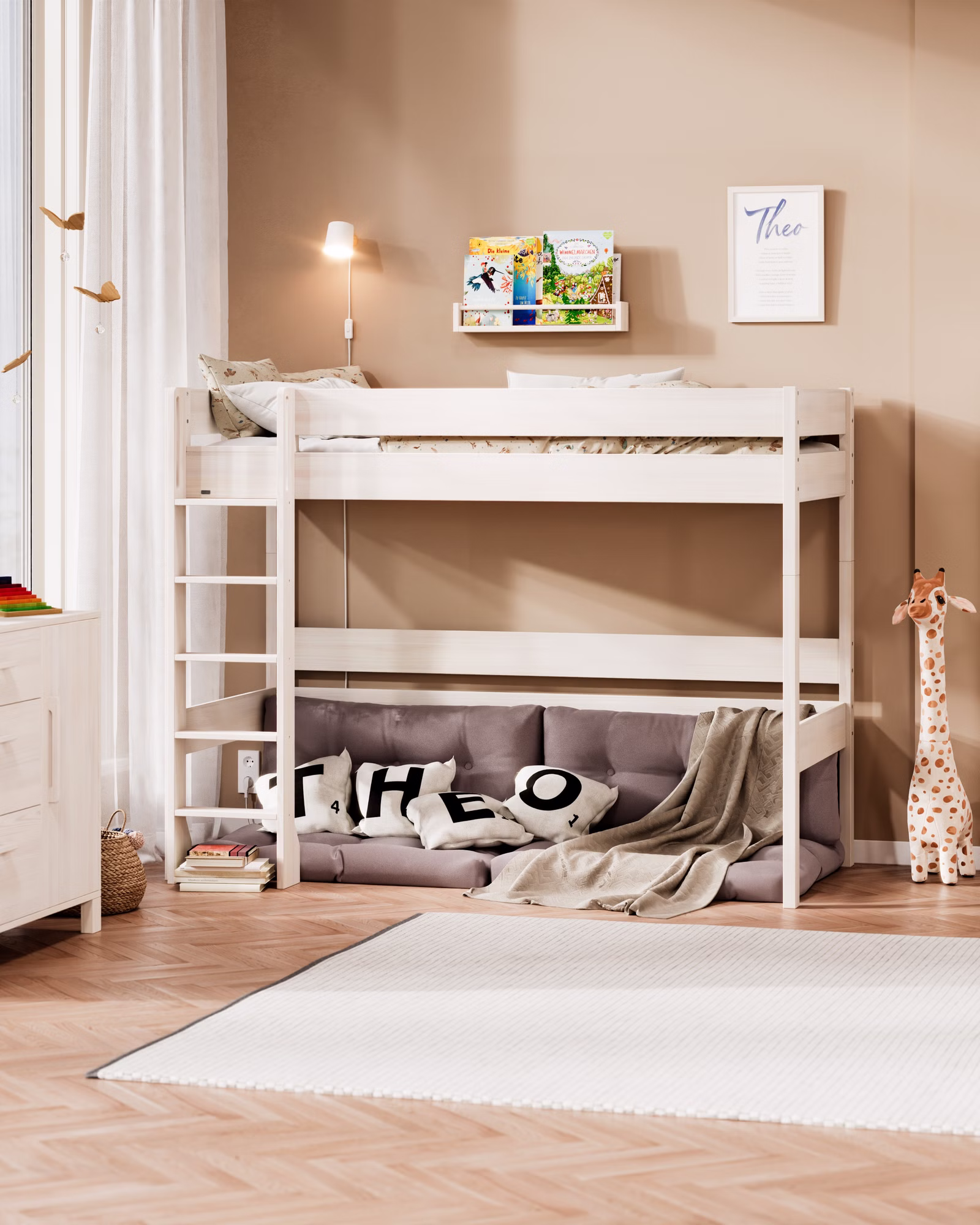 Mit seiner großzügigen Höhe wird Theo zum flexiblen Raumwunder: als Hochbett mit viel Platz darunter oder als Etagenbett für Geschwister und Übernachtungsgäste. Der Umbau ist kinderleicht – so lässt sich Theo jederzeit an neue Lebensphasen anpassen.