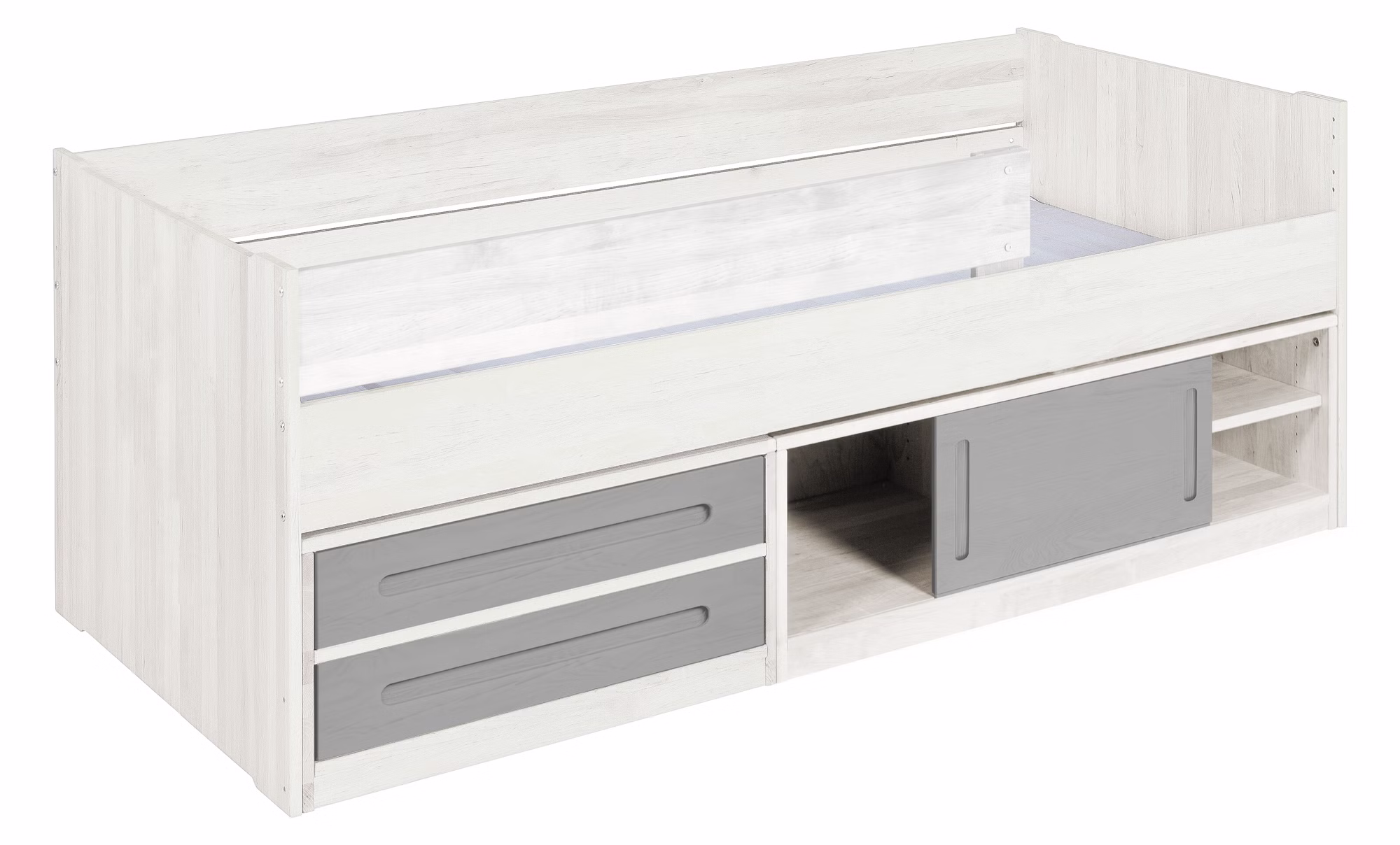• Das Modell 2x Schublade + Schiebetür besteht aus einer Bettkommode mit 2 Schubladen mit Leichtlaufschienen und Soft-Close-Mechanismus und einer Bettkommode mit Schiebetür. Dank der Schiebetür der breiten Kommode wird wahlweise der rechte oder linke Teil des Faches sichtbar. Der Einlegeboden dieser Bettkommode kann flexibel positioniert werden.