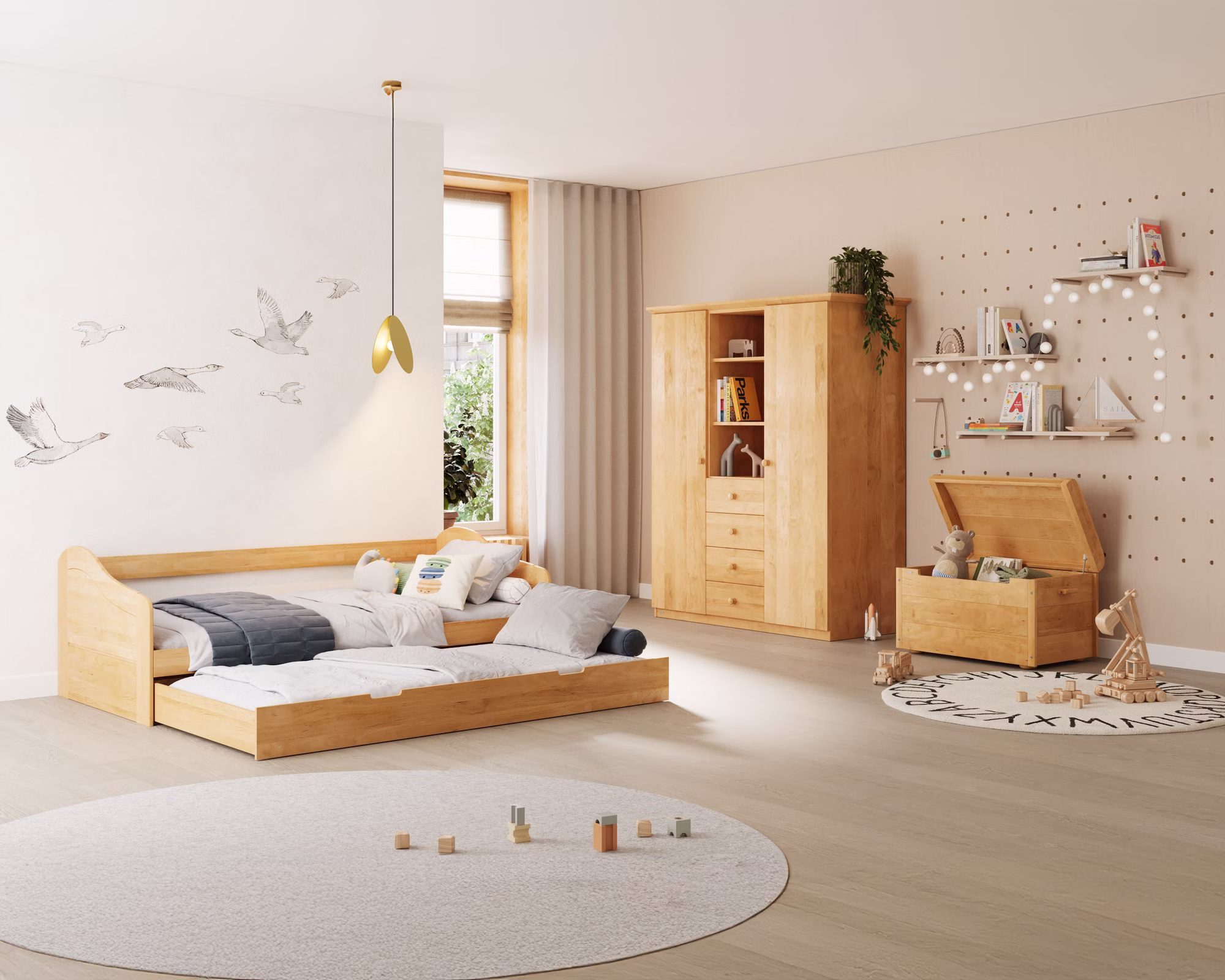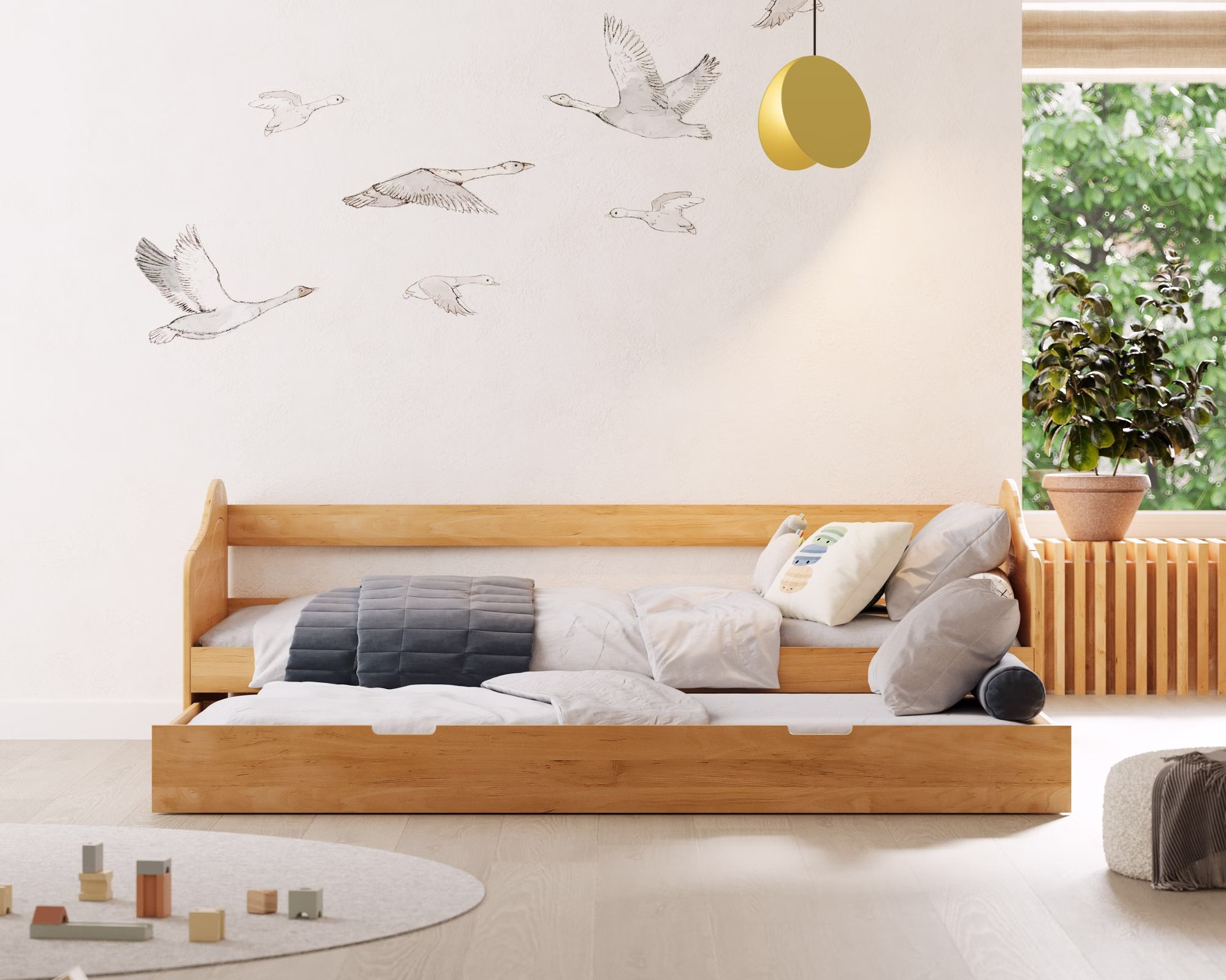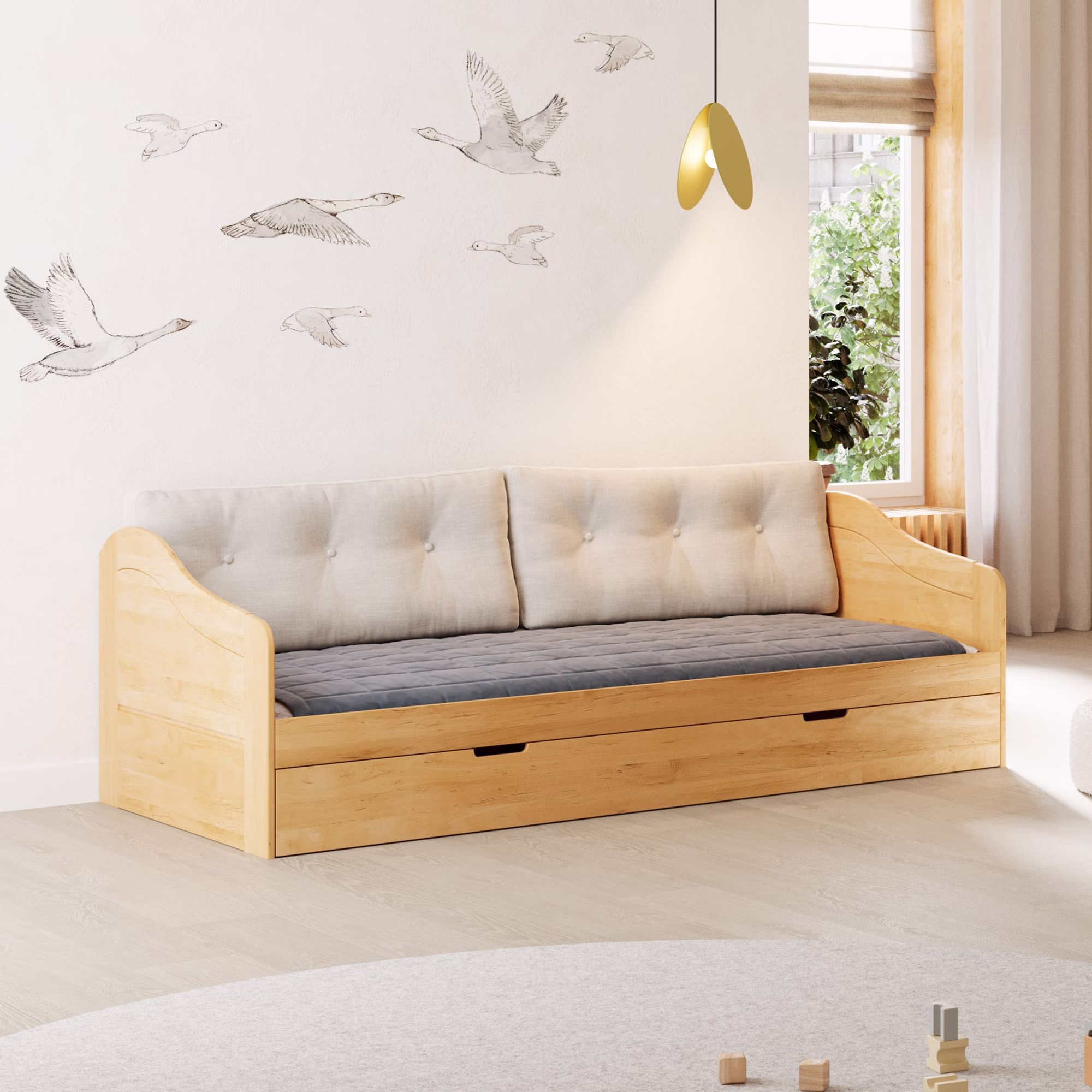 Ob als gemütliches Sofa für den Alltag, als komfortables Bett für die Nacht oder als praktisches Gästebett – Nico bietet alles in einem und überzeugt durch seine hochwertigen Materialien aus Bio-Massivholz. Es ist ideal für alle, die Wert auf gesunden Schlaf, stilvolles Design und umweltfreundliche Produkte legen.