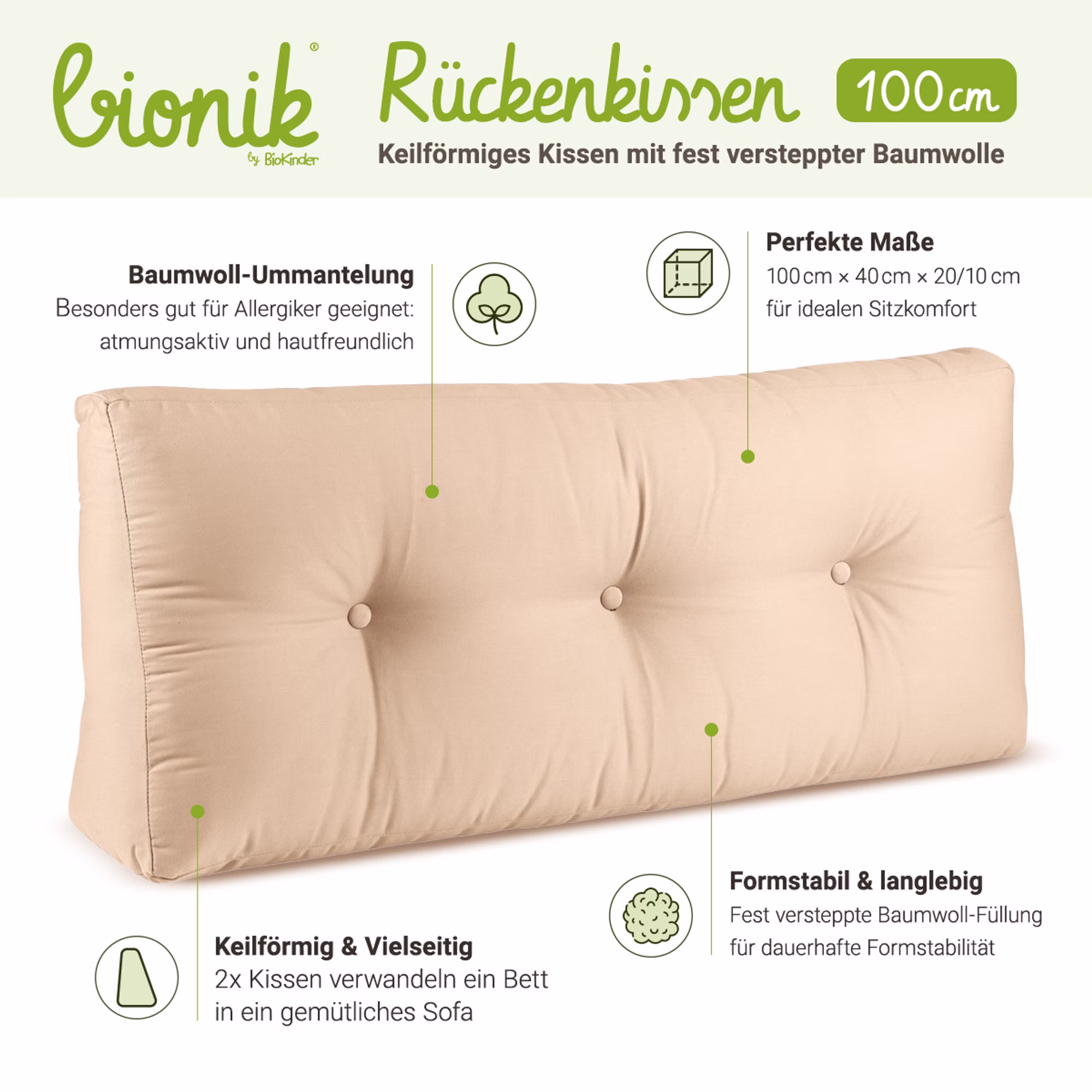 Unsere BioKinder Rückenlehnen mit der Breite von 100 cm sind die passende Ergänzung, um ein Bett zum Sofa zu verwandeln. Mit zwei dieser Rückenkissen schaffen Sie so eine perfekte Sofalehne im Bett.