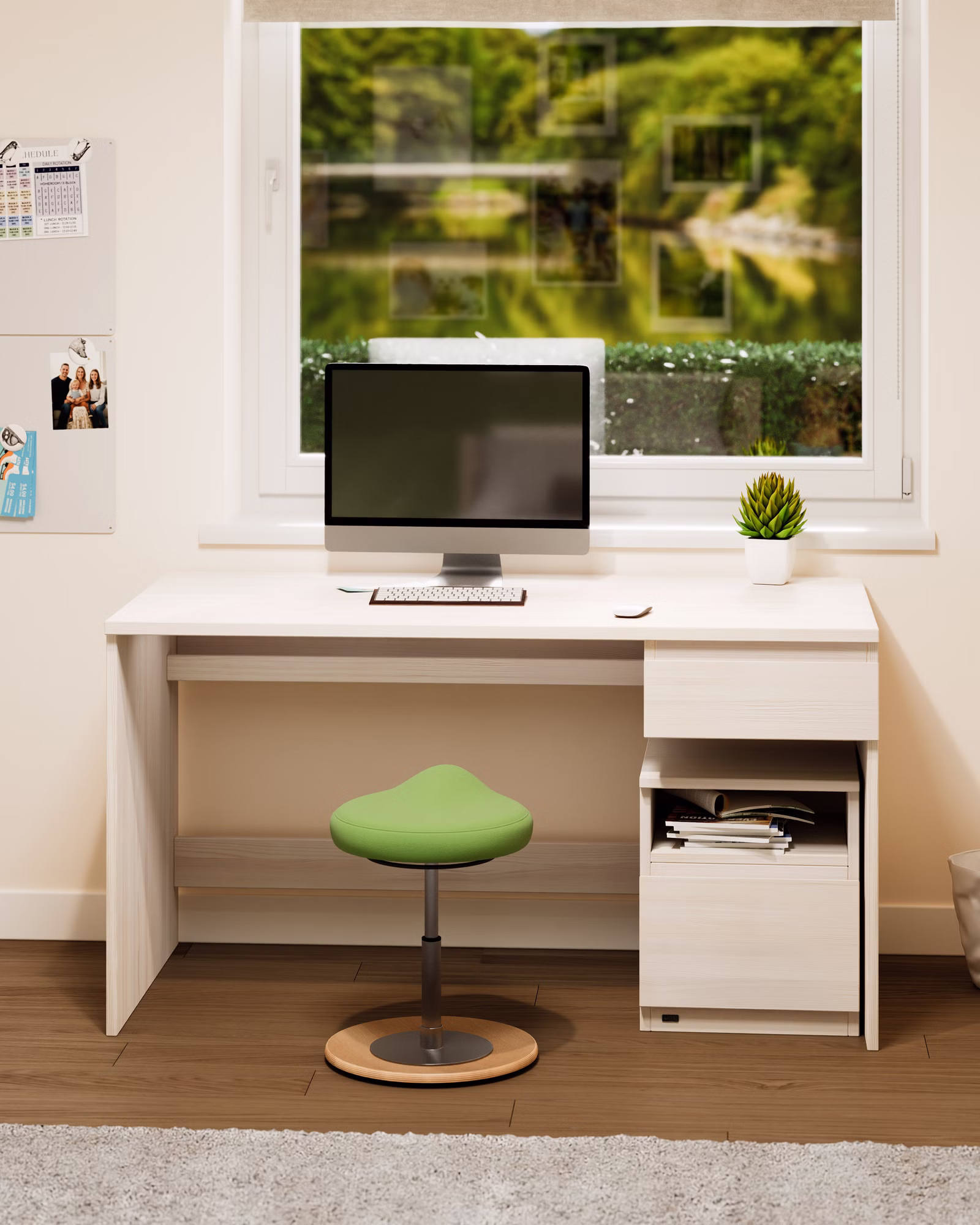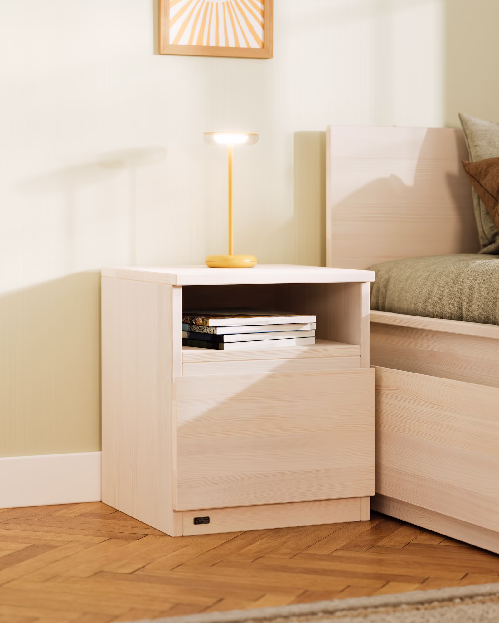 Ein flexibles Möbelstück aus Massivholz mit 1 Schublade und 1 Ablagefach, nutzbar als Nachttisch, kleine Kommode und Schreibtischzubehör zu allen Schreibtischen von BioKinder. Zur praktischen Unterbringung von Schulsachen, Stiften und Büromaterialien.