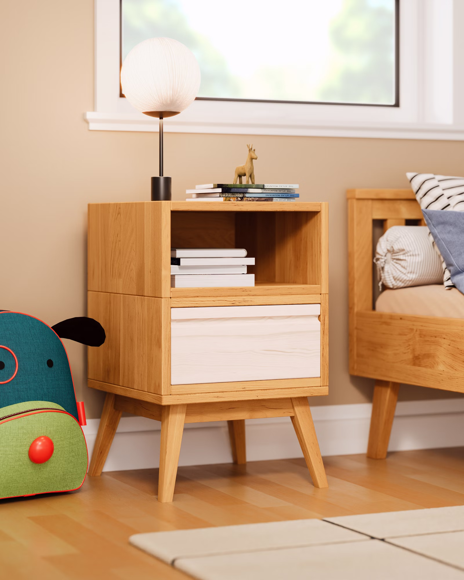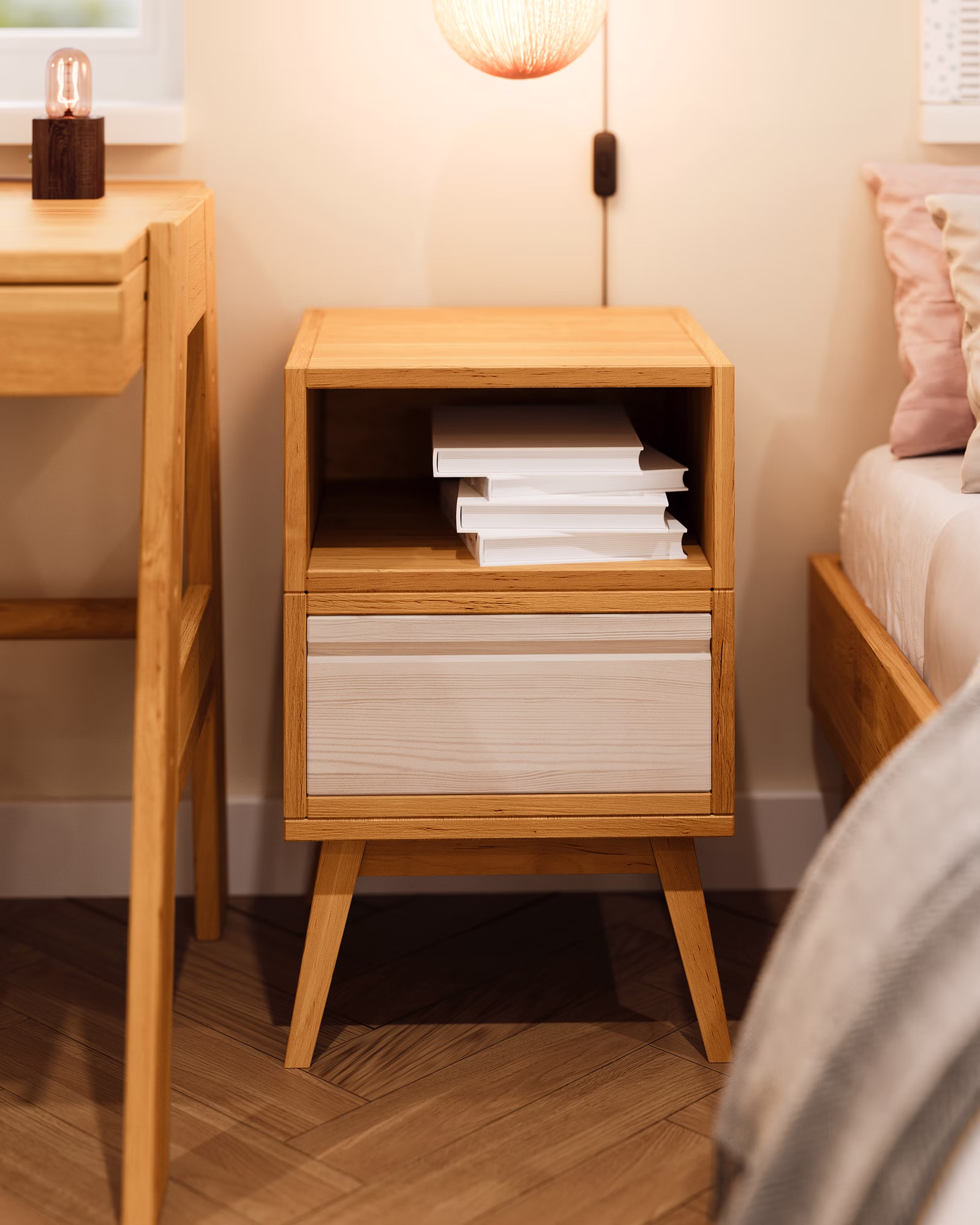 Unser Laura Retro Nachttisch wird aus Bio-Massivholz gefertigt und lässt sich vielseitig einsetzen. Die Kombination aus offenen und geschlossenen Laura Regalwürfeln und dem elegant niedrigen Retrosockel versprüht einen nostalgischen Charme und wirkt gleichzeitig modern und zeitlos. So fügt sich der Nachttisch harmonisch in jedes Zimmer ein und passt zu jedem Einrichtungsstil.