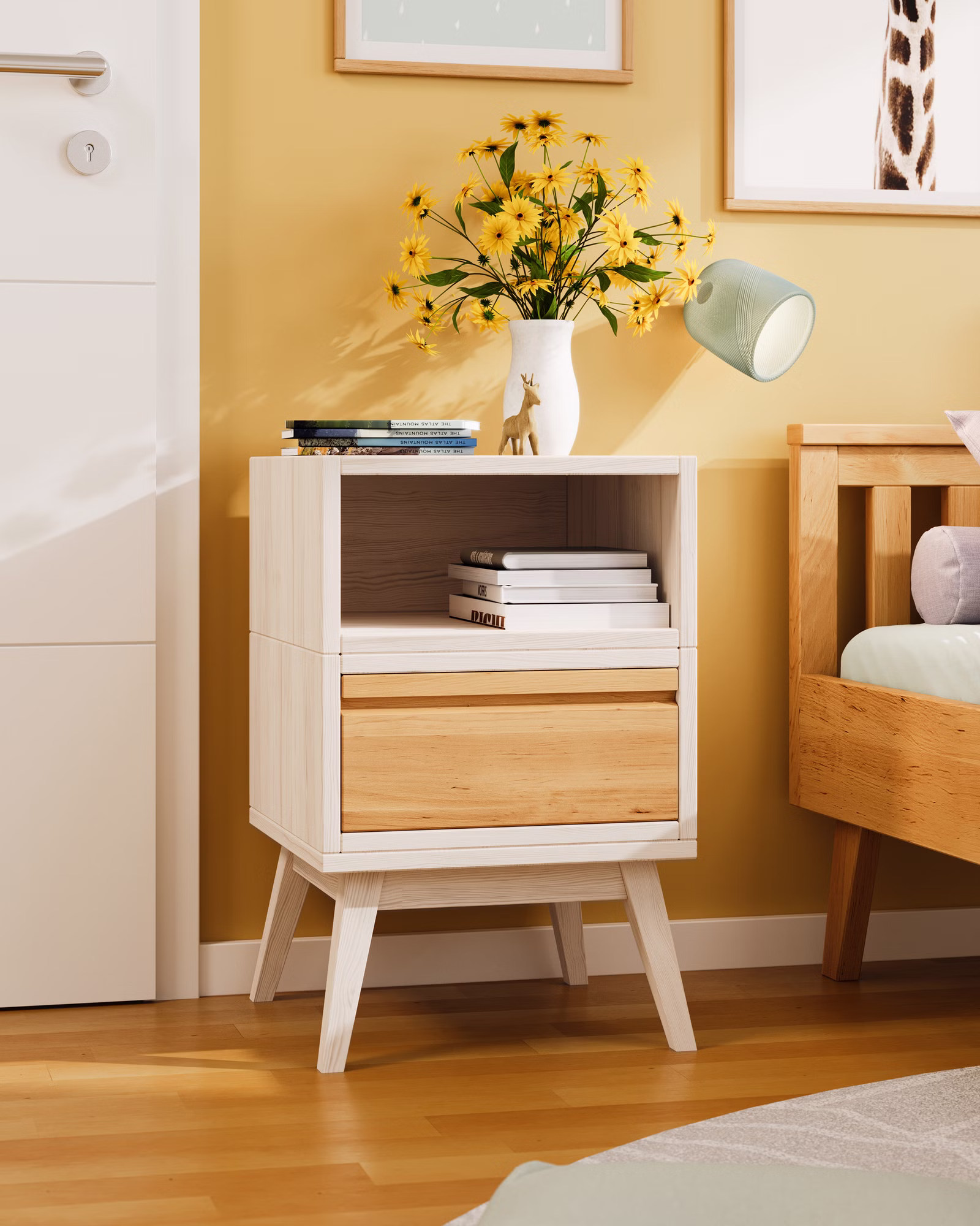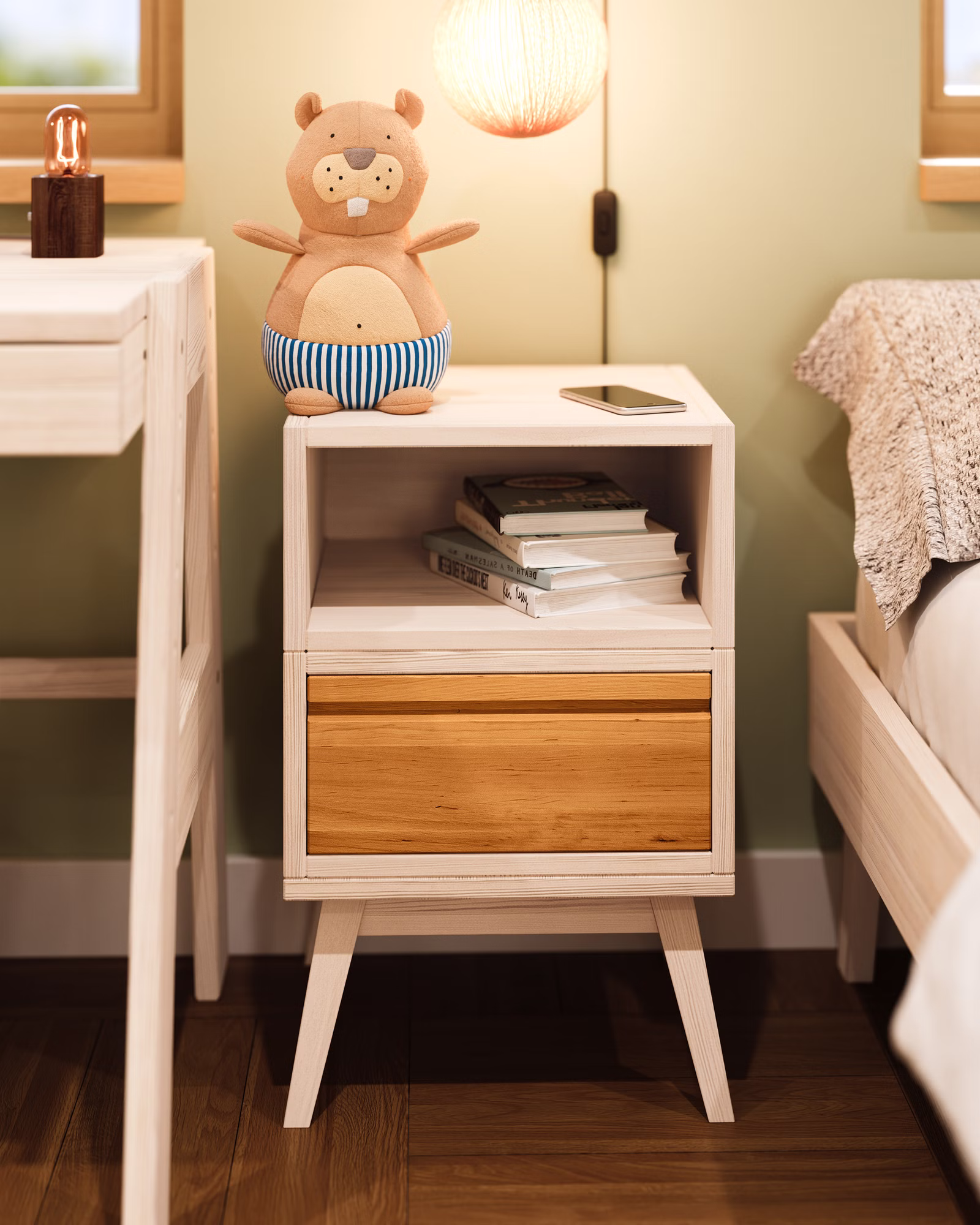 Unser Laura Retro Nachttisch wird aus Bio-Massivholz gefertigt und lässt sich vielseitig einsetzen. Die Kombination aus offenen und geschlossenen Laura Regalwürfeln und dem elegant niedrigen Retrosockel versprüht einen nostalgischen Charme und wirkt gleichzeitig modern und zeitlos. So fügt sich der Nachttisch harmonisch in jedes Zimmer ein und passt zu jedem Einrichtungsstil.