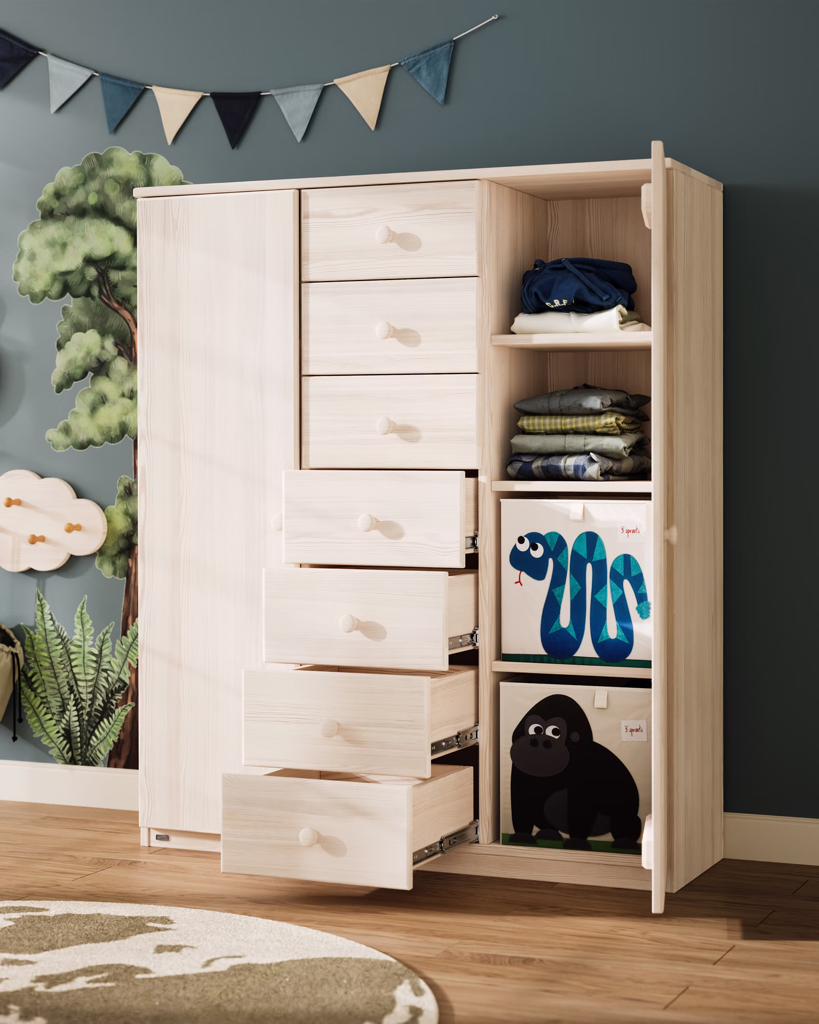 Formschöne Symbiose aus Schrank und Kommode für vielfältige Aufbewahrungsmöglichkeiten. David sieht auch im Flur als Garderobenmöbel oder Schuhschrank gut aus. Die intelligente Aufteilung in Schubladenelemente und Regalböden schafft übersichtlichen Platz für Spielsachen, Kleidungstücke, Bettwäsche. So bietet der David Kommoden- und Kinderschrank den Komfort eines Kleiderschrankes bei idealer Raumnutzung im kleineren Kinderzimmer.