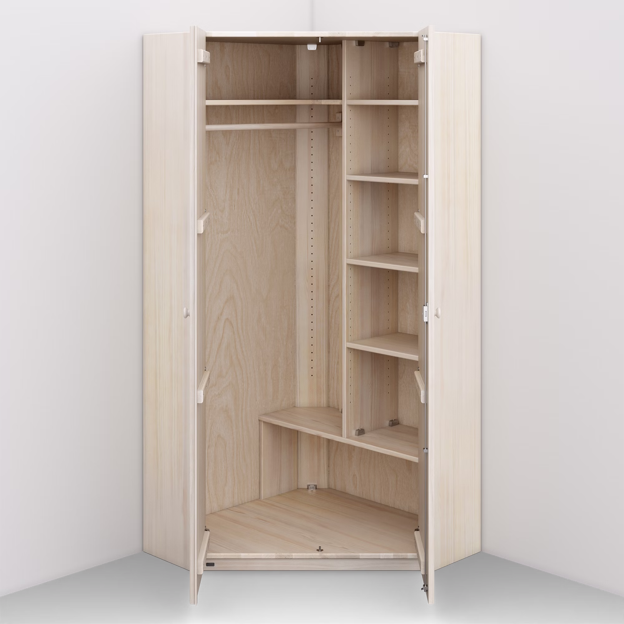 Die perfekte Lösung für Ecken. Der platzsparende 2türige Eckkleiderschrank aus ökologischem Vollholz fügt sich platzsparend und harmonisch ins Raumkonzept ein.