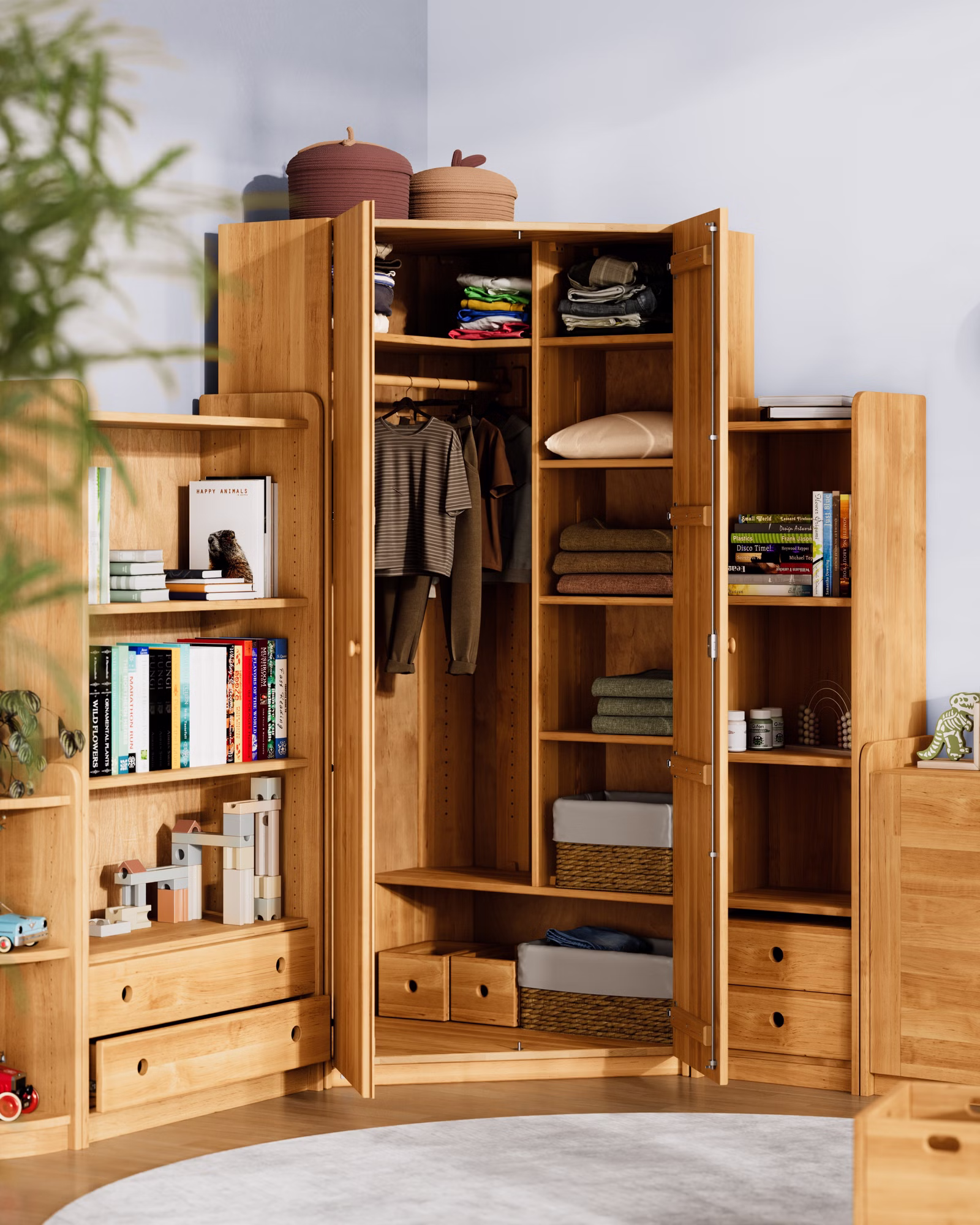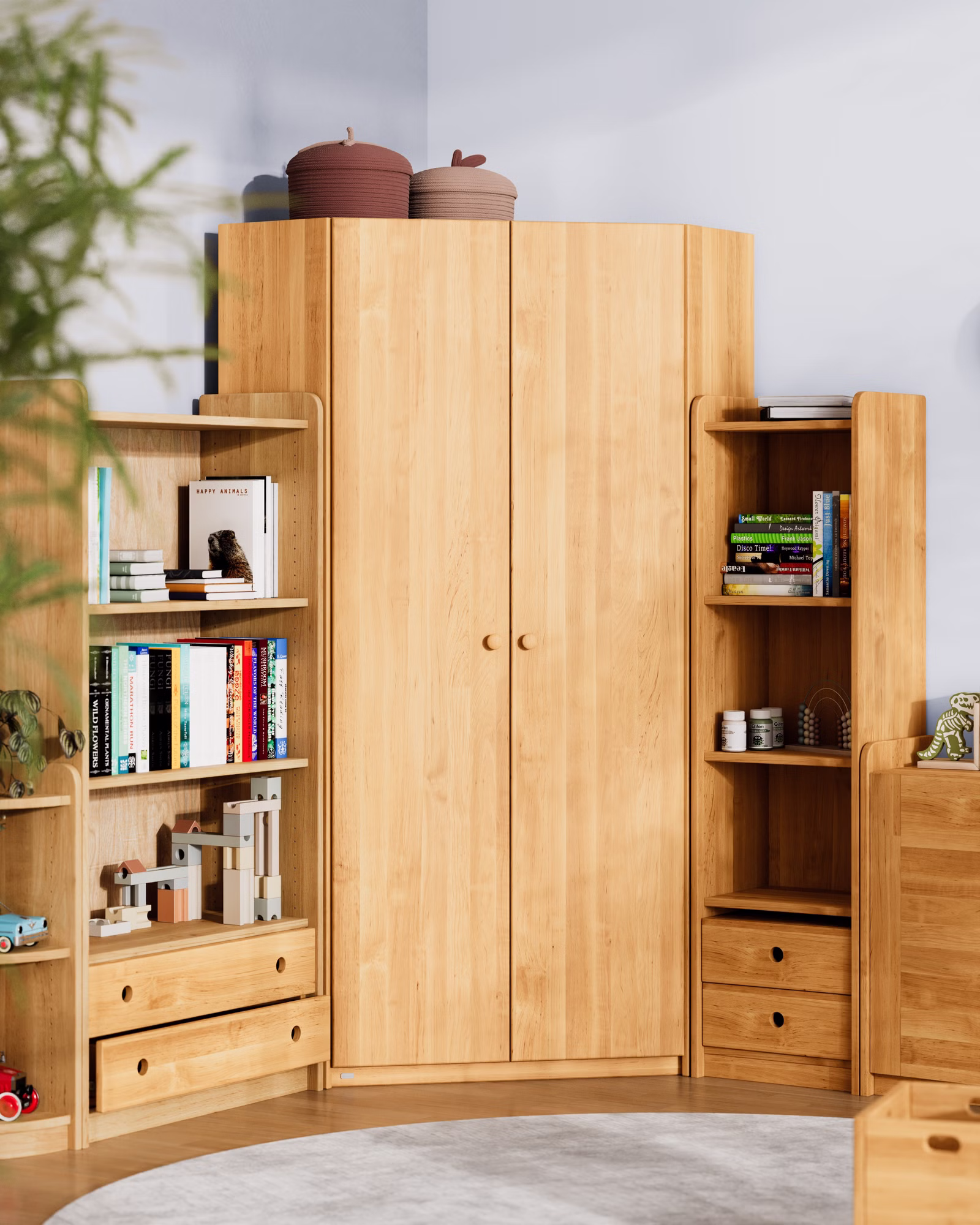 Die perfekte Lösung für Ecken. Der platzsparende 2türige Eckkleiderschrank aus ökologischem Vollholz fügt sich platzsparend und harmonisch ins Raumkonzept ein.