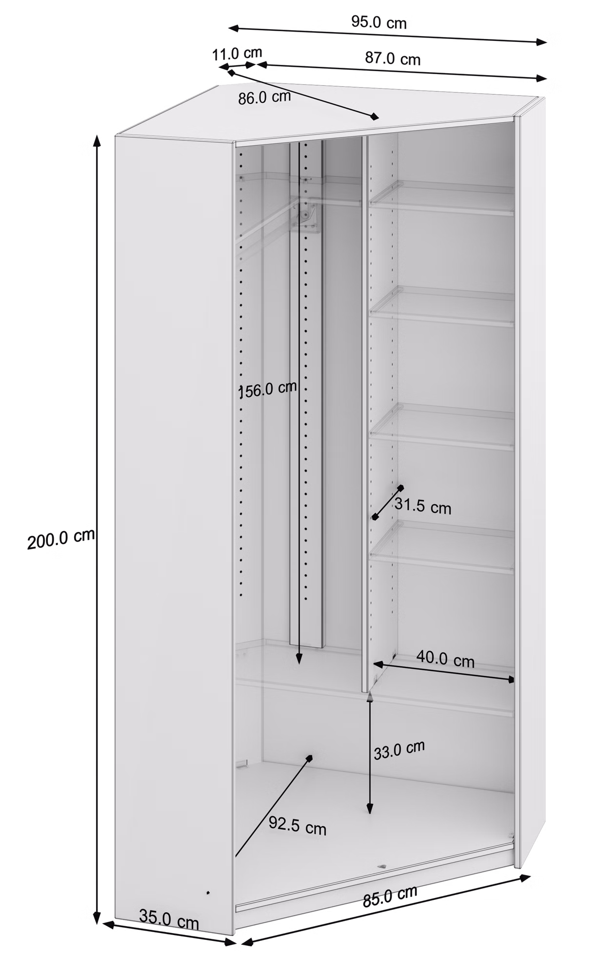 - Inkl. 1 festem Boden, 5 flexiblen Einlegeböden (4 kurze, 1 langer), 1 Kleiderstange.