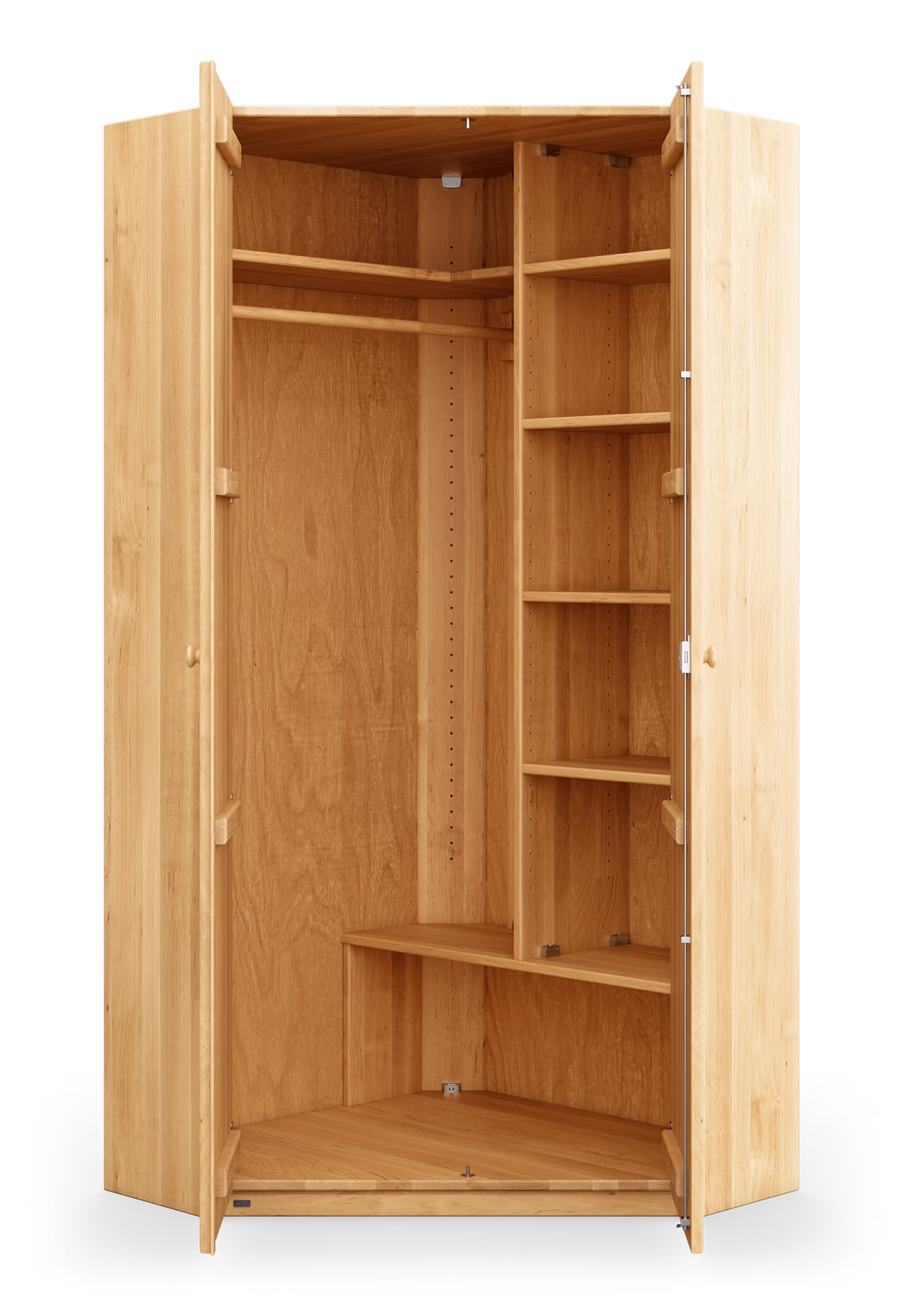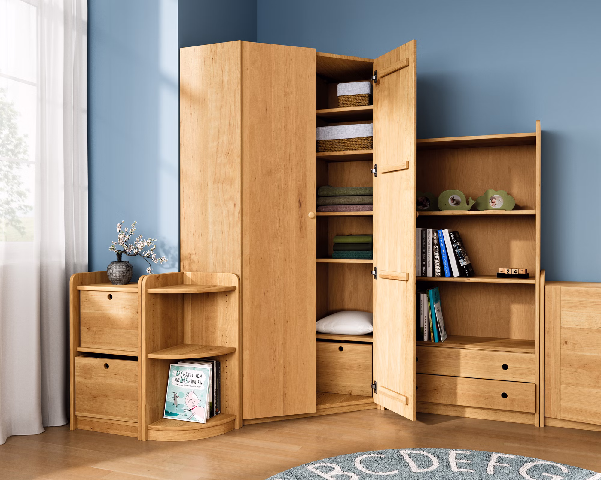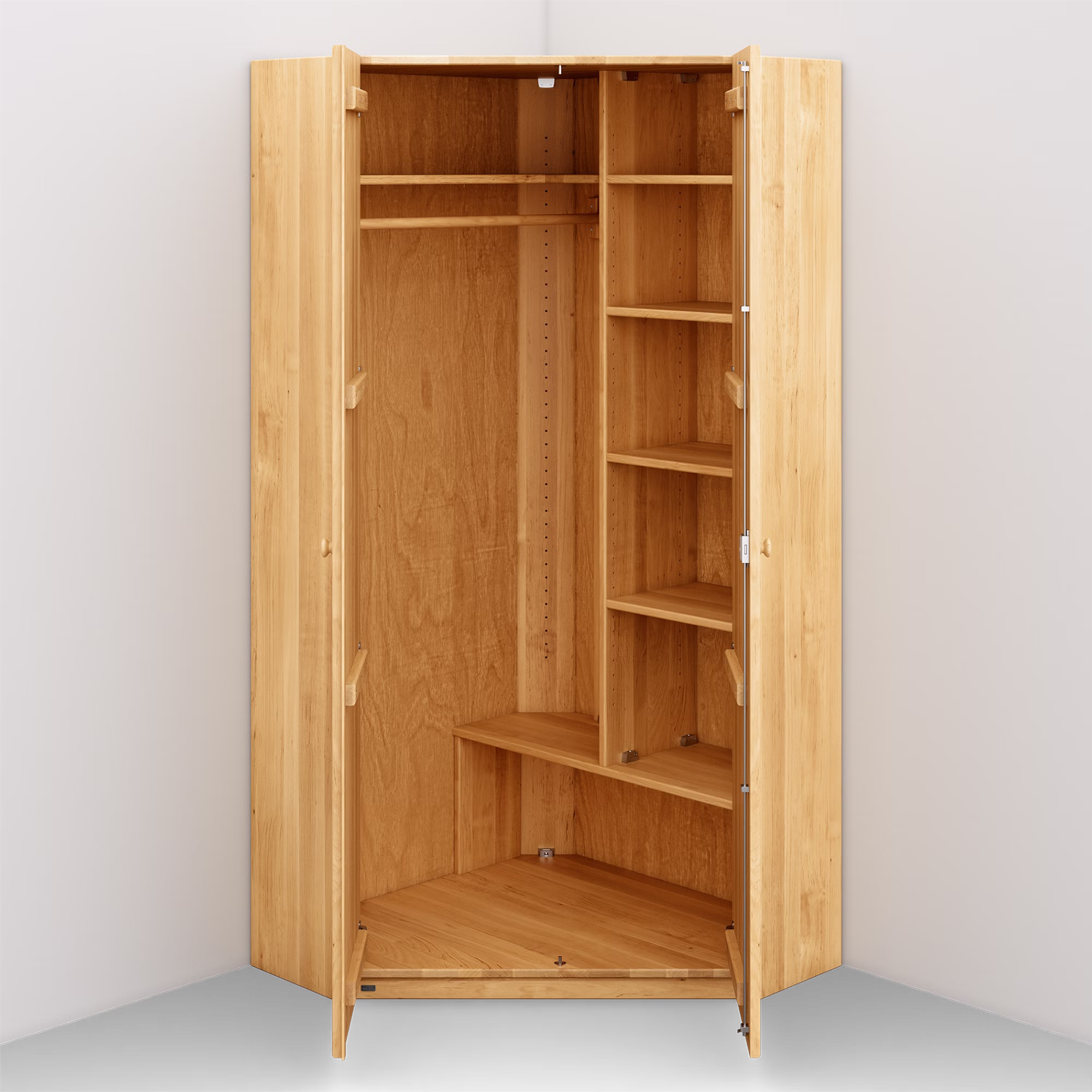Die perfekte Lösung für Ecken. Der platzsparende 2türige Eckkleiderschrank aus ökologischem Vollholz fügt sich platzsparend und harmonisch ins Raumkonzept ein.