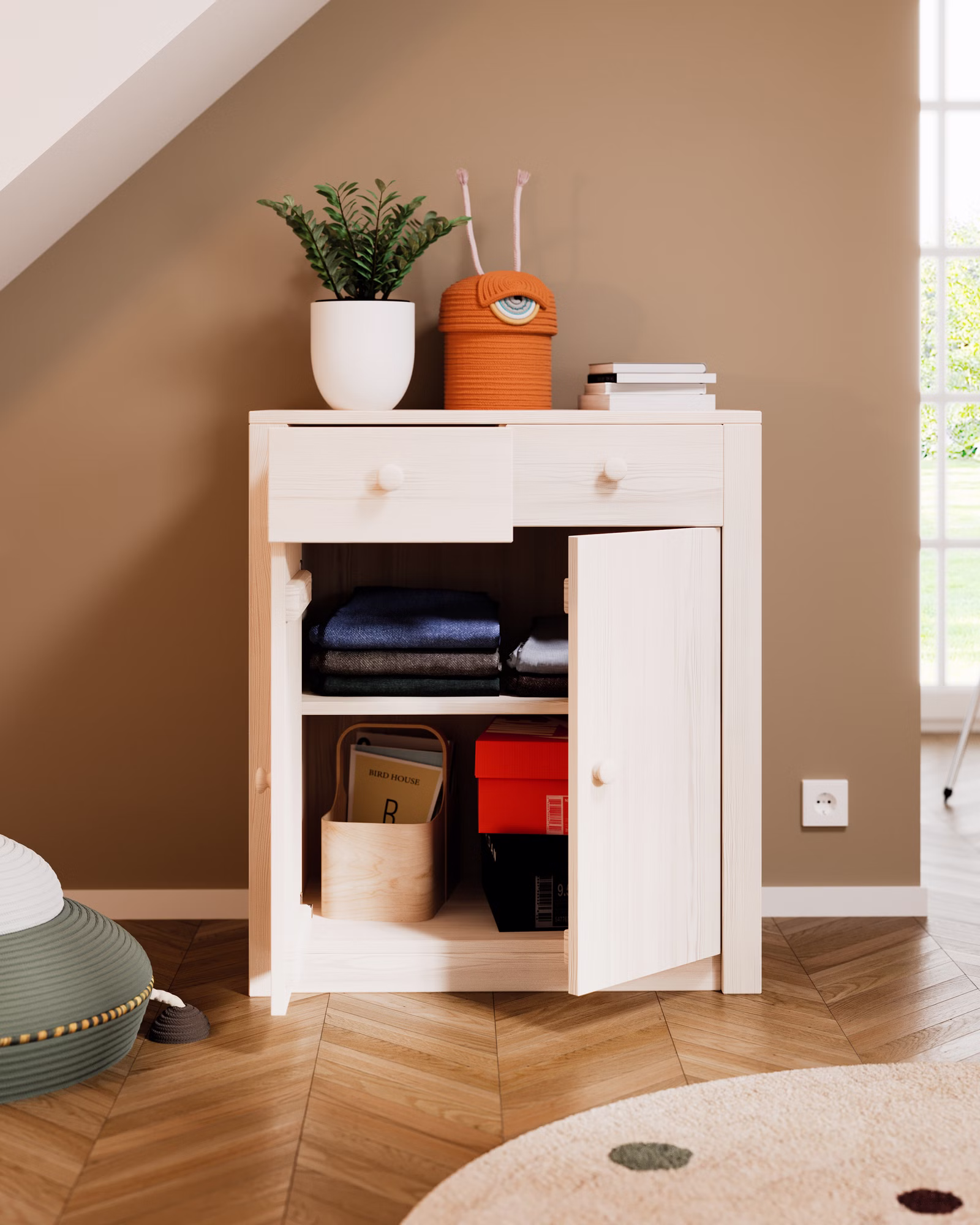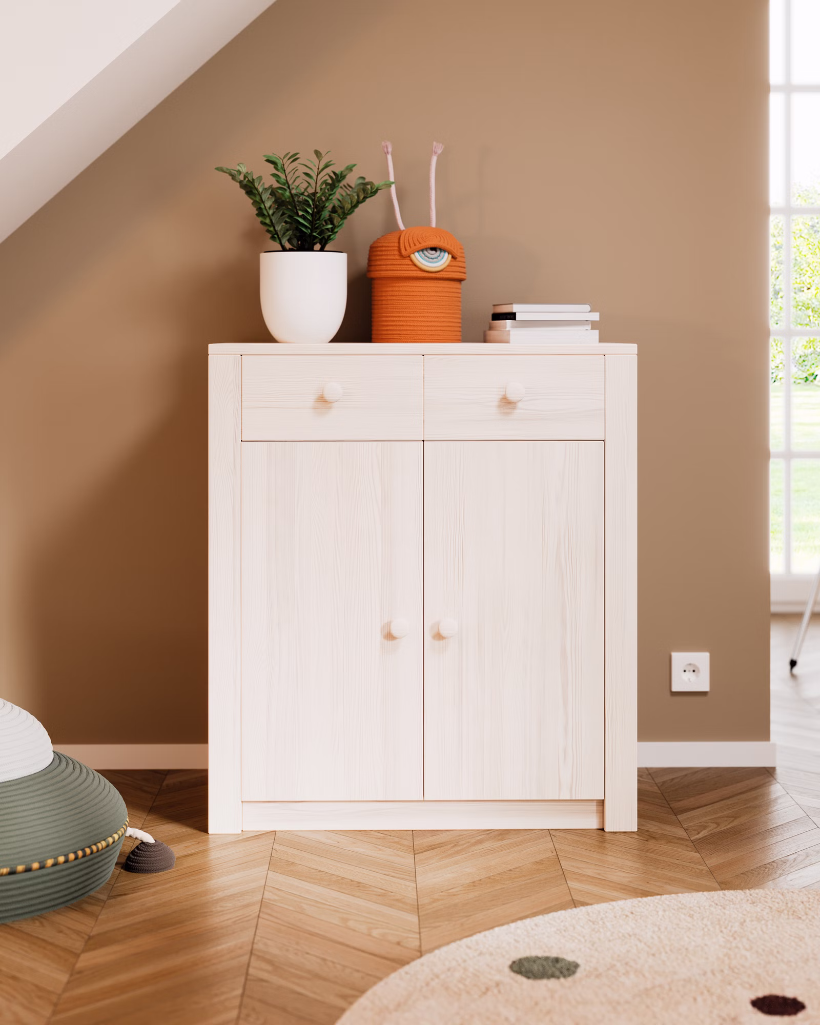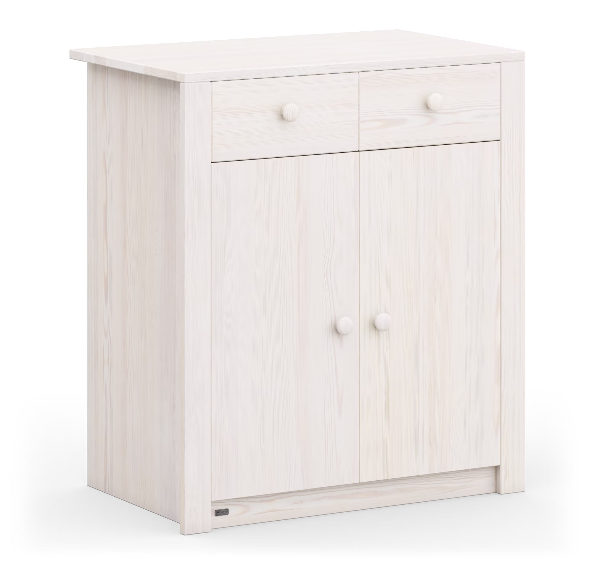Für alle wichtigen Dinge im Leben: Die 2-türige Kommode aus Bio-Massivholz verstaut in zwei Schubladen und zwei geräumigen Fächern Kleidung, Spielzeug und andere Lieblingssachen.