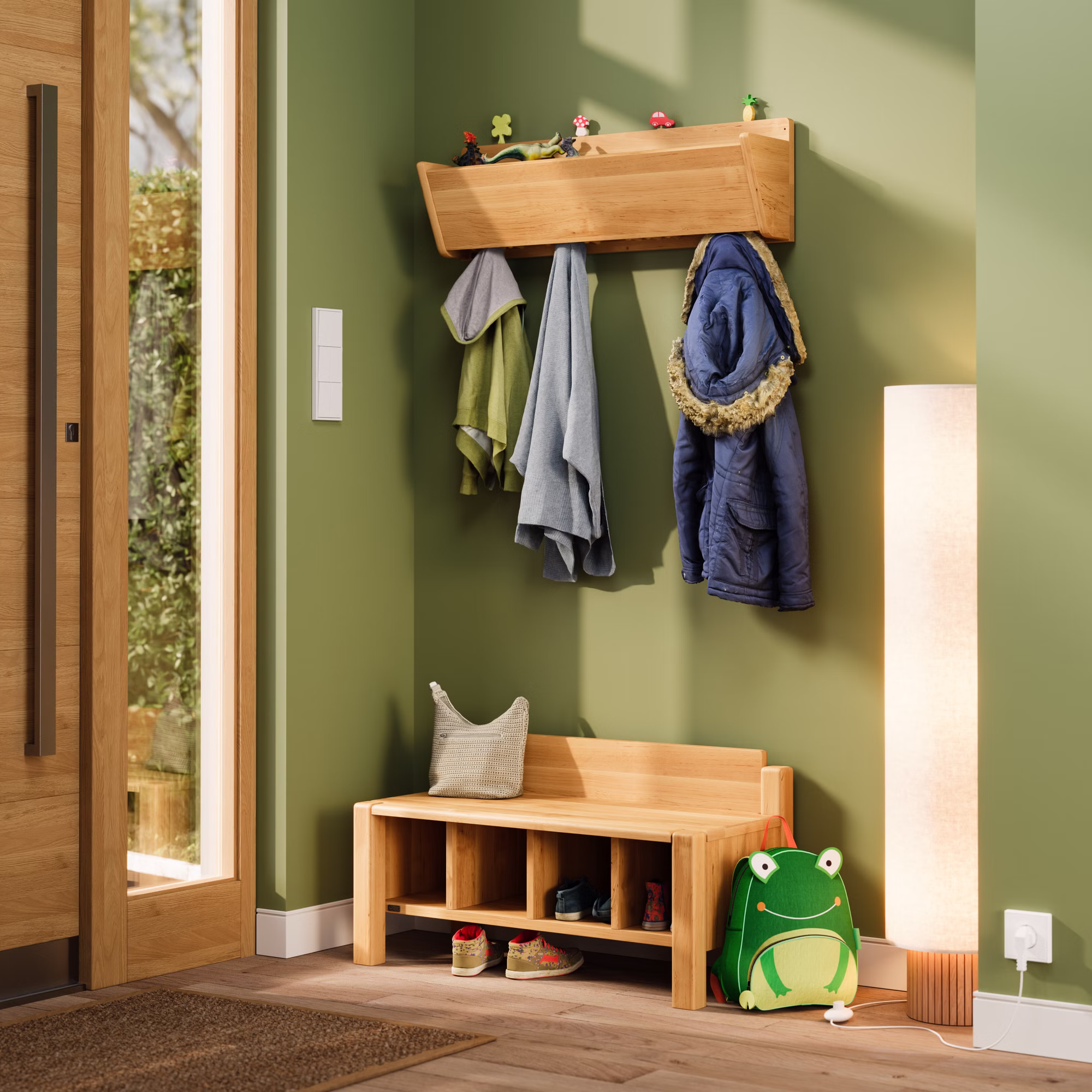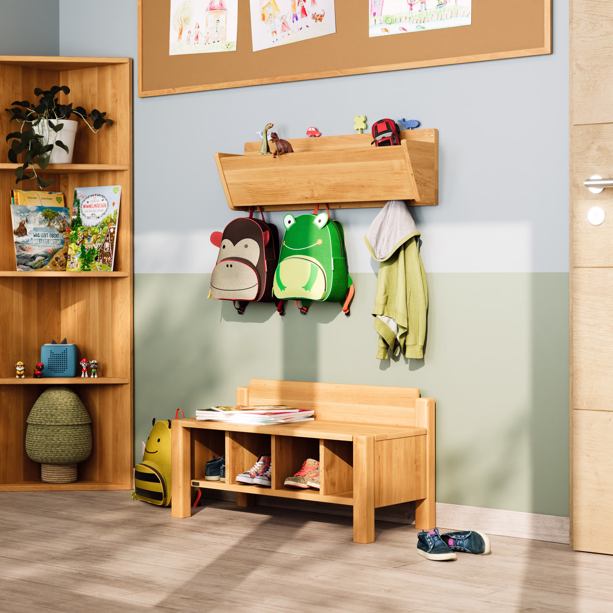 Die Robin Garderobenbank aus massivem Bio-Erlenholz schafft natürliche Ordnung und unterstützt Kinder im Flur, Kinderzimmer oder in der Kita beim selbstständigen An- und Ausziehen. Die stabile Garderobenbank bietet kindgerechte Funktionalität, robuste Qualität und eine warme, natürliche Ausstrahlung.