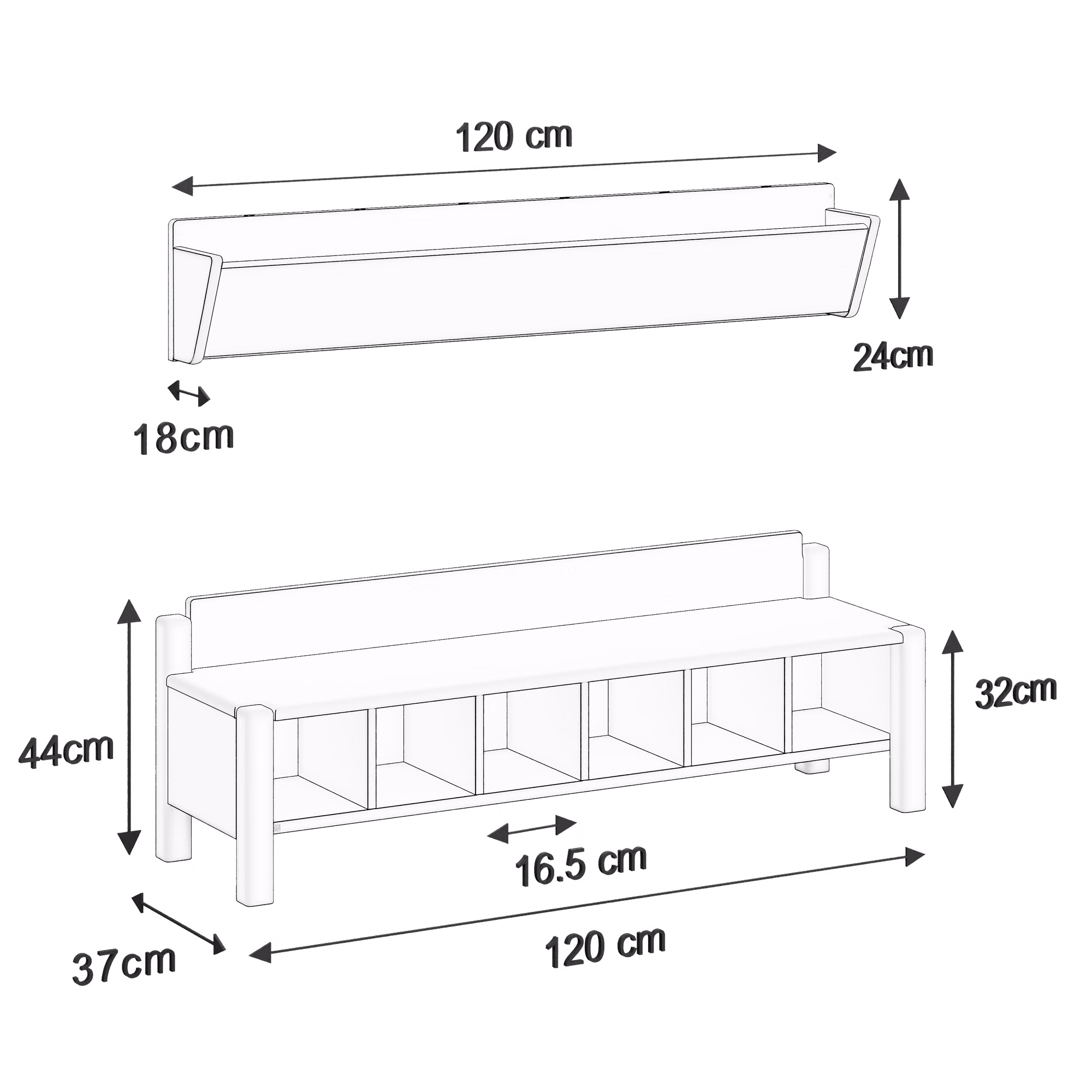 Maße Garderobenbank: L 60 cm, 80 cm, 100 cm, 120 cm; T 37 cm; H 44 cm; Sitzhöhe 32 cm
