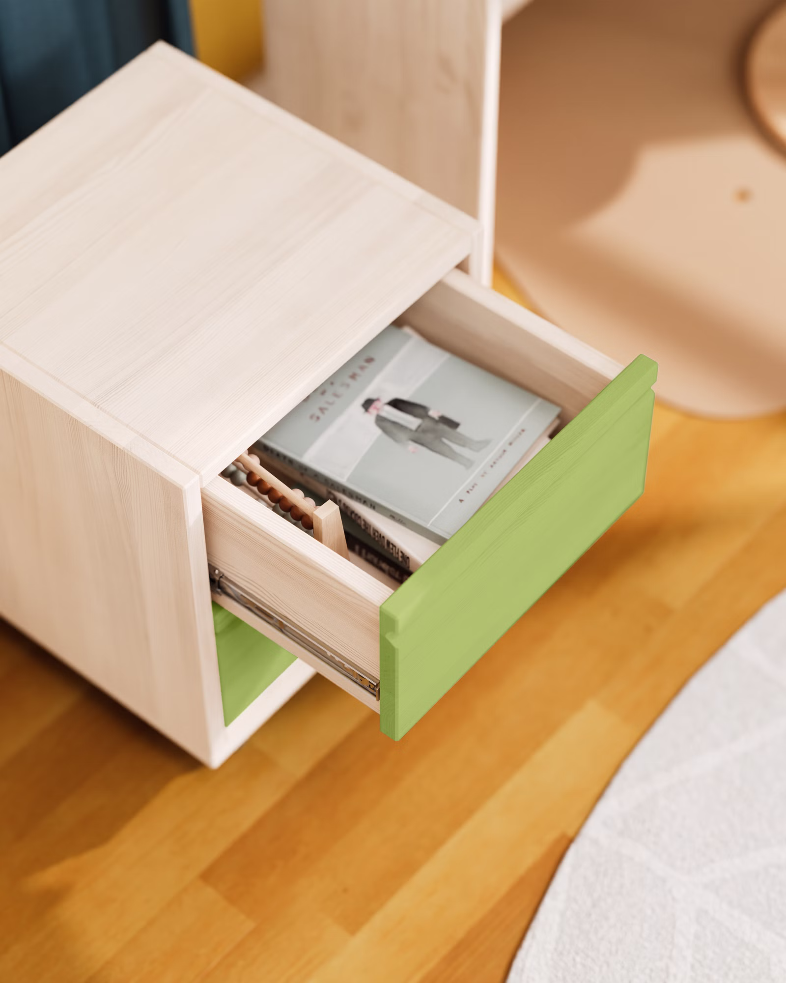 Die beiden Schubladen des Regalwürfels sind mit kugelgelagerten Leichtlaufschienen mit Selbsteinzug ausgestattet. Der integrierte Soft-Close-Mechanismus ermöglicht ein sicheres und geräuscharmes Schließen. Die Schubladen lassen sich voll ausziehen und bieten so Einblicke bis in den hintersten Bereich des Schubkastens.