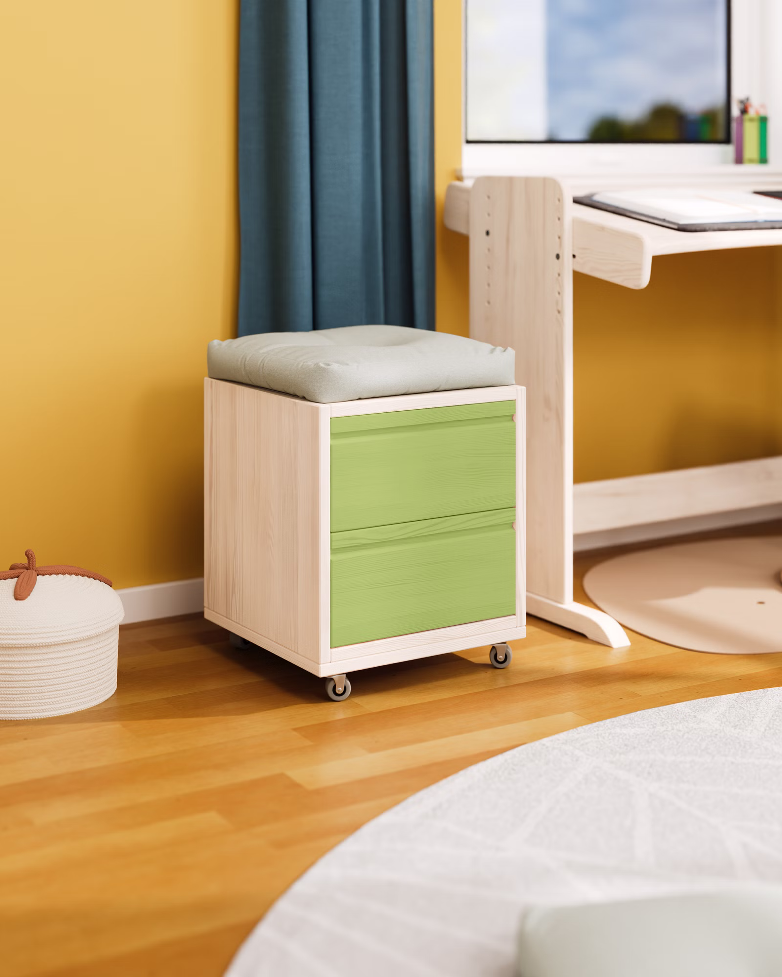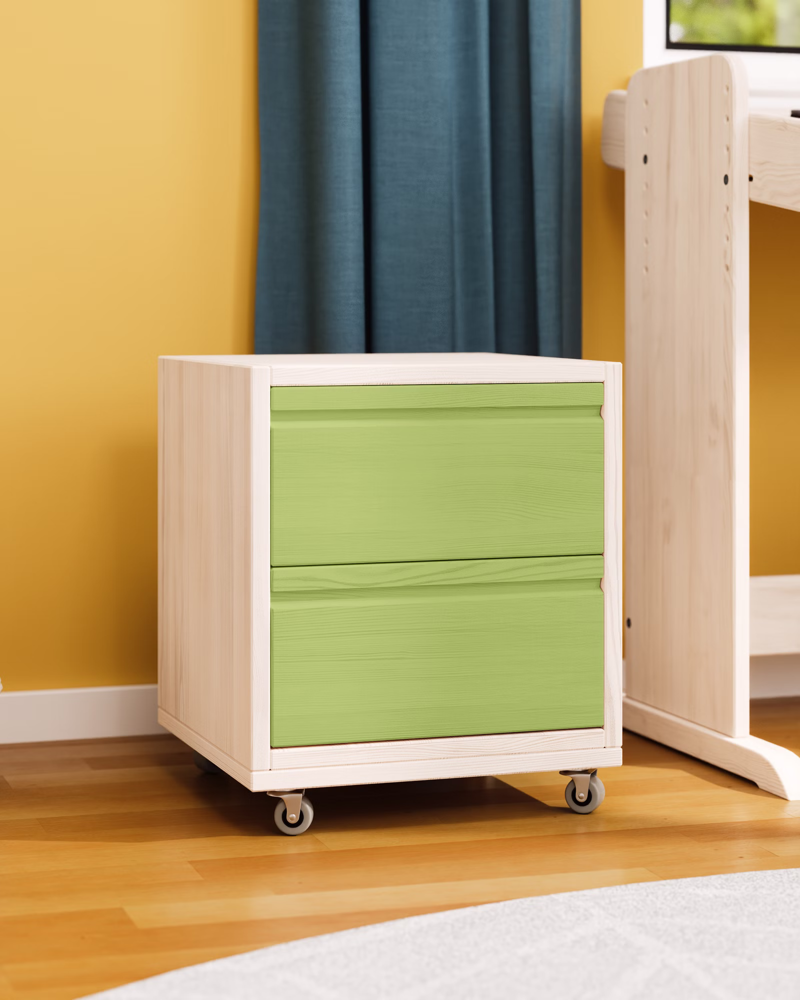 Unser Laura Rollcontainer mit zwei Schubladen wird aus Bio-Massivholz gefertigt und ist die praktische Ergänzung für jeden Schreibtisch im Kinderzimmer oder Büro. Die Schubladen können farblich auf die Einrichtung abgestimmt werden und setzen so fröhliche Farbakzente im Kinderzimmer.