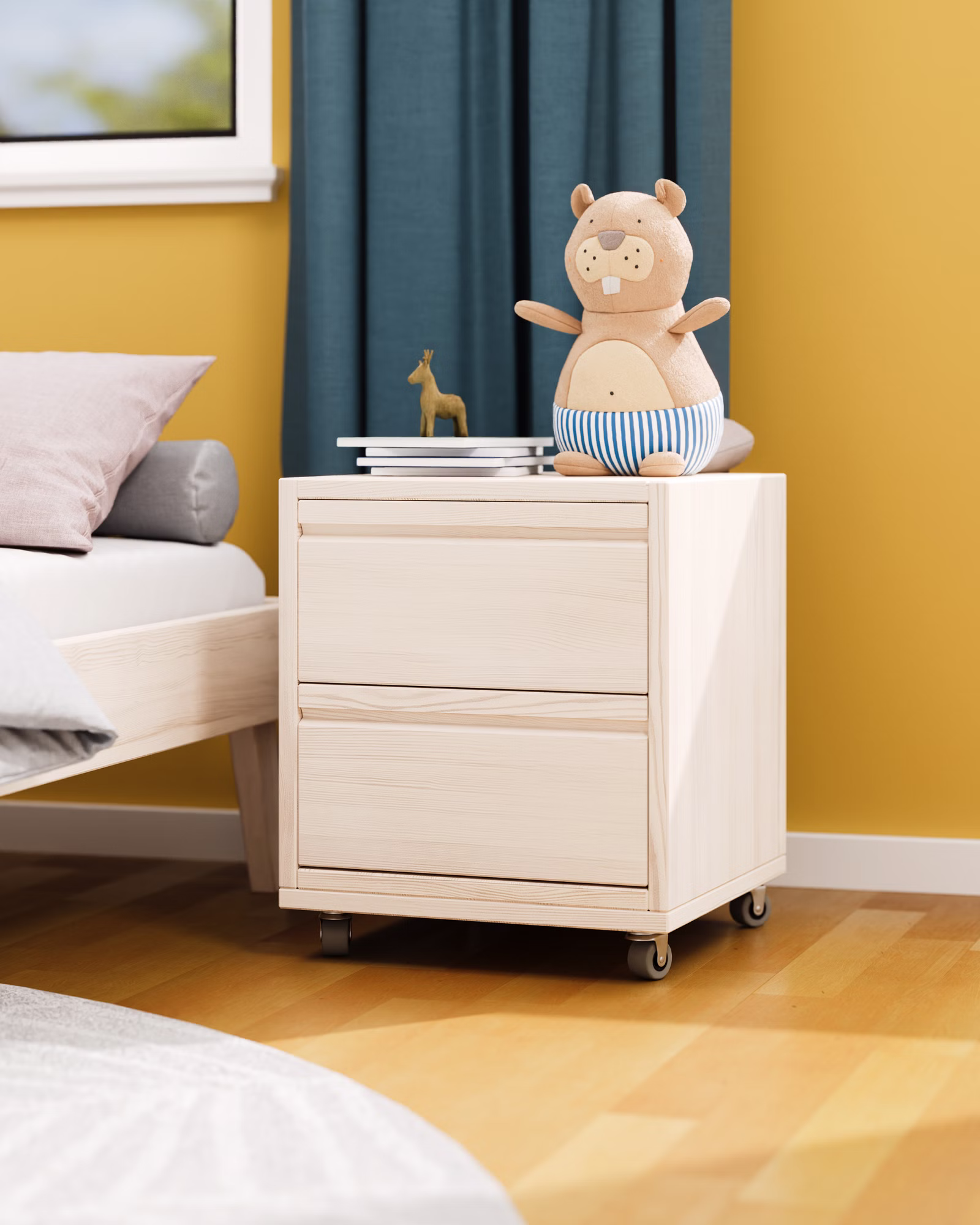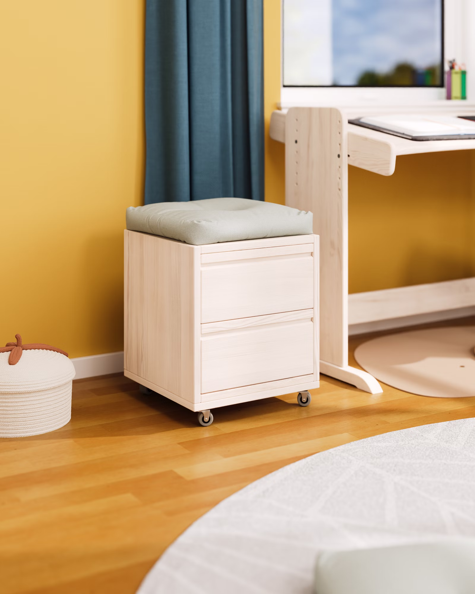 Unser Laura Rollcontainer mit zwei Schubladen wird aus Bio-Massivholz gefertigt und ist die praktische Ergänzung für jeden Schreibtisch im Kinderzimmer oder Büro. Die Schubladen können farblich auf die Einrichtung abgestimmt werden und setzen so fröhliche Farbakzente im Kinderzimmer.