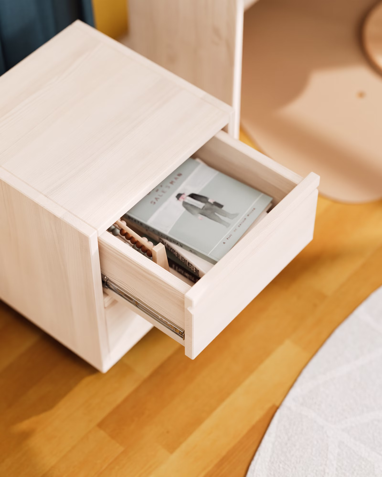 Die beiden Schubladen des Regalwürfels sind mit kugelgelagerten Leichtlaufschienen mit Selbsteinzug ausgestattet. Der integrierte Soft-Close-Mechanismus ermöglicht ein sicheres und geräuscharmes Schließen. Die Schubladen lassen sich voll ausziehen und bieten so Einblicke bis in den hintersten Bereich des Schubkastens.