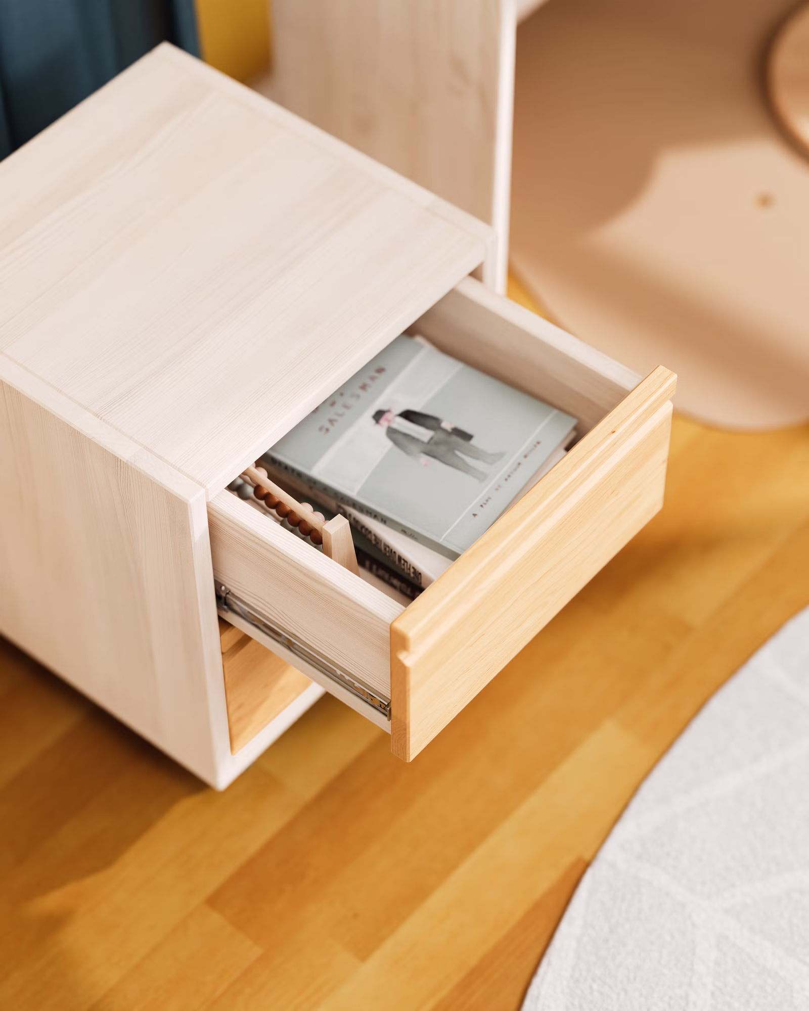 Die beiden Schubladen des Regalwürfels sind mit kugelgelagerten Leichtlaufschienen mit Selbsteinzug ausgestattet. Der integrierte Soft-Close-Mechanismus ermöglicht ein sicheres und geräuscharmes Schließen. Die Schubladen lassen sich voll ausziehen und bieten so Einblicke bis in den hintersten Bereich des Schubkastens.