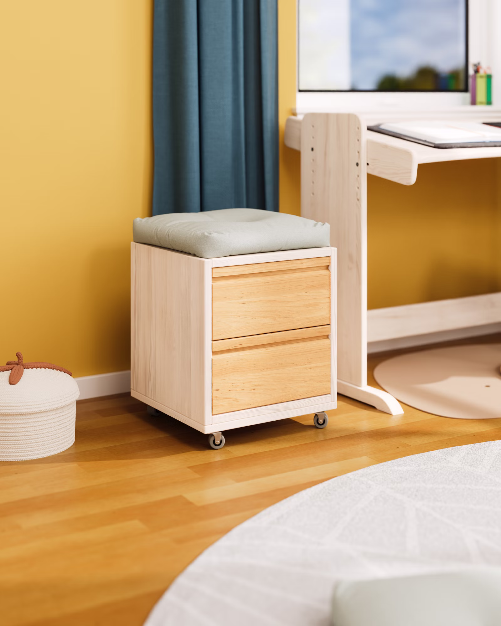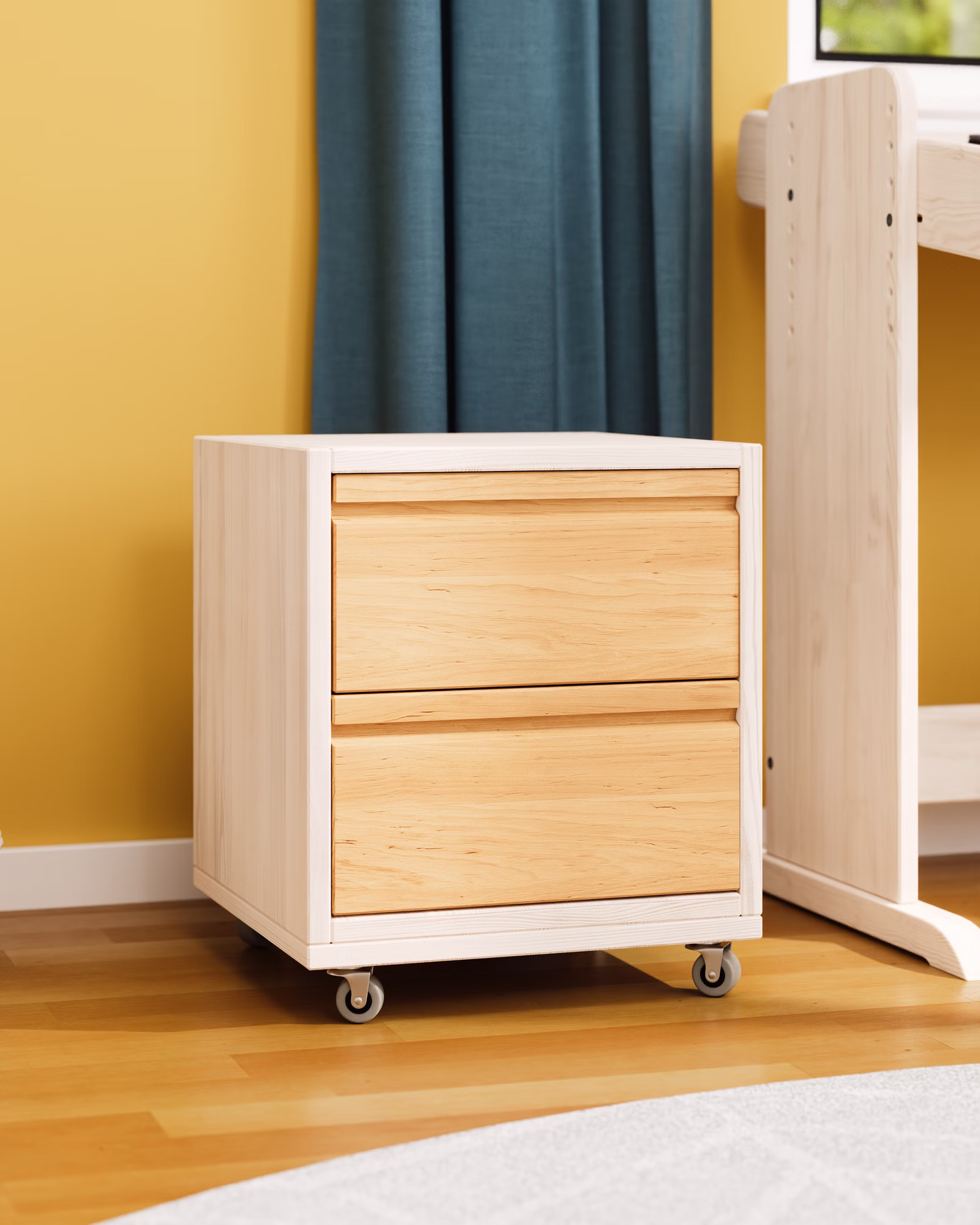Unser Laura Rollcontainer mit zwei Schubladen wird aus Bio-Massivholz gefertigt und ist die praktische Ergänzung für jeden Schreibtisch im Kinderzimmer oder Büro. Die Schubladen können farblich auf die Einrichtung abgestimmt werden und setzen so fröhliche Farbakzente im Kinderzimmer.