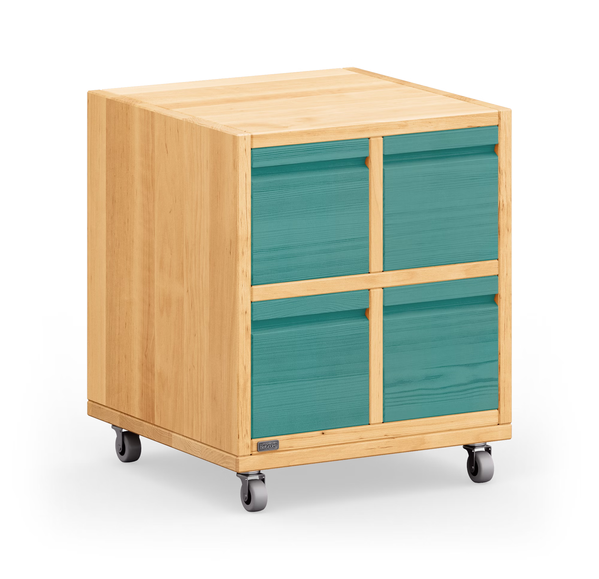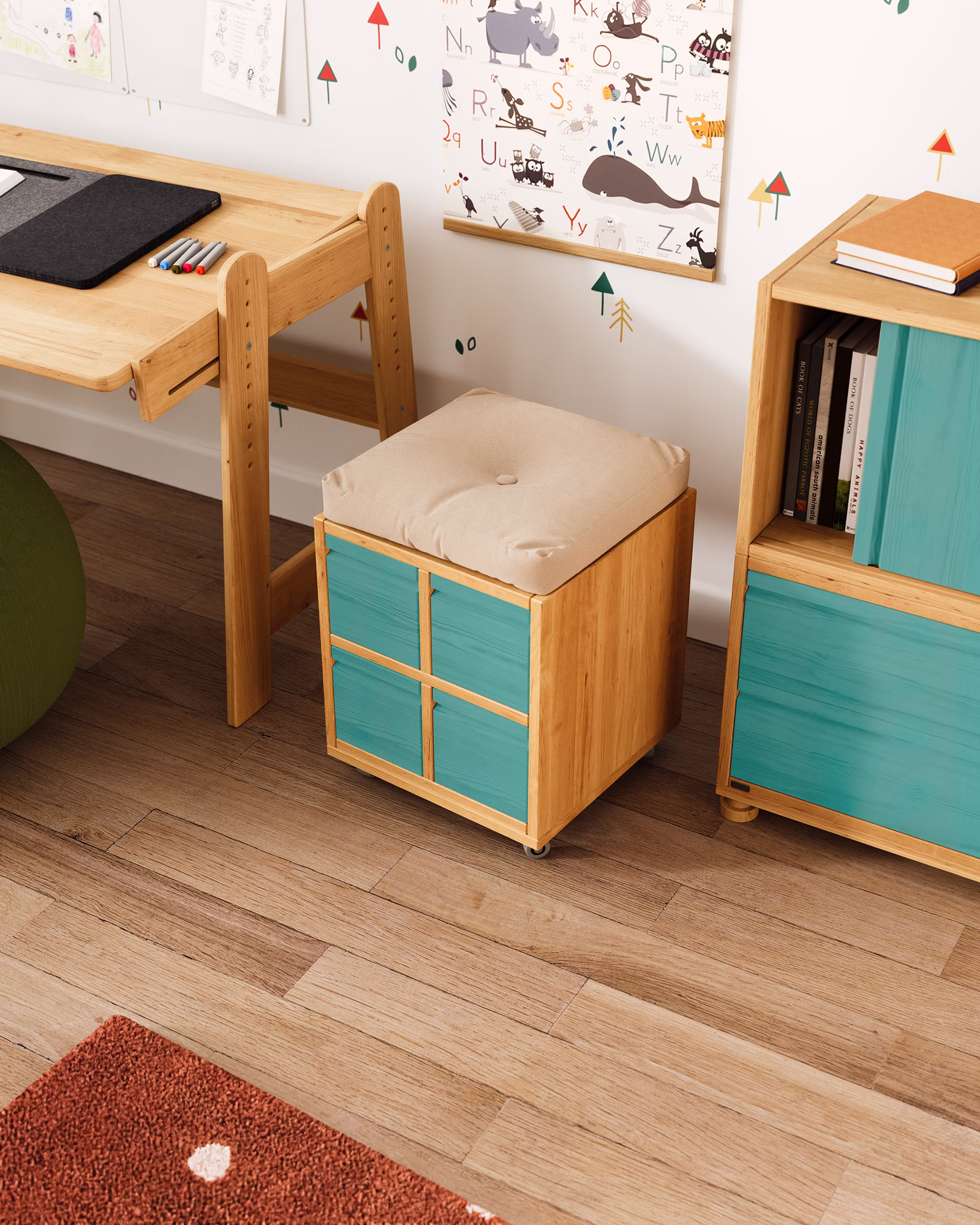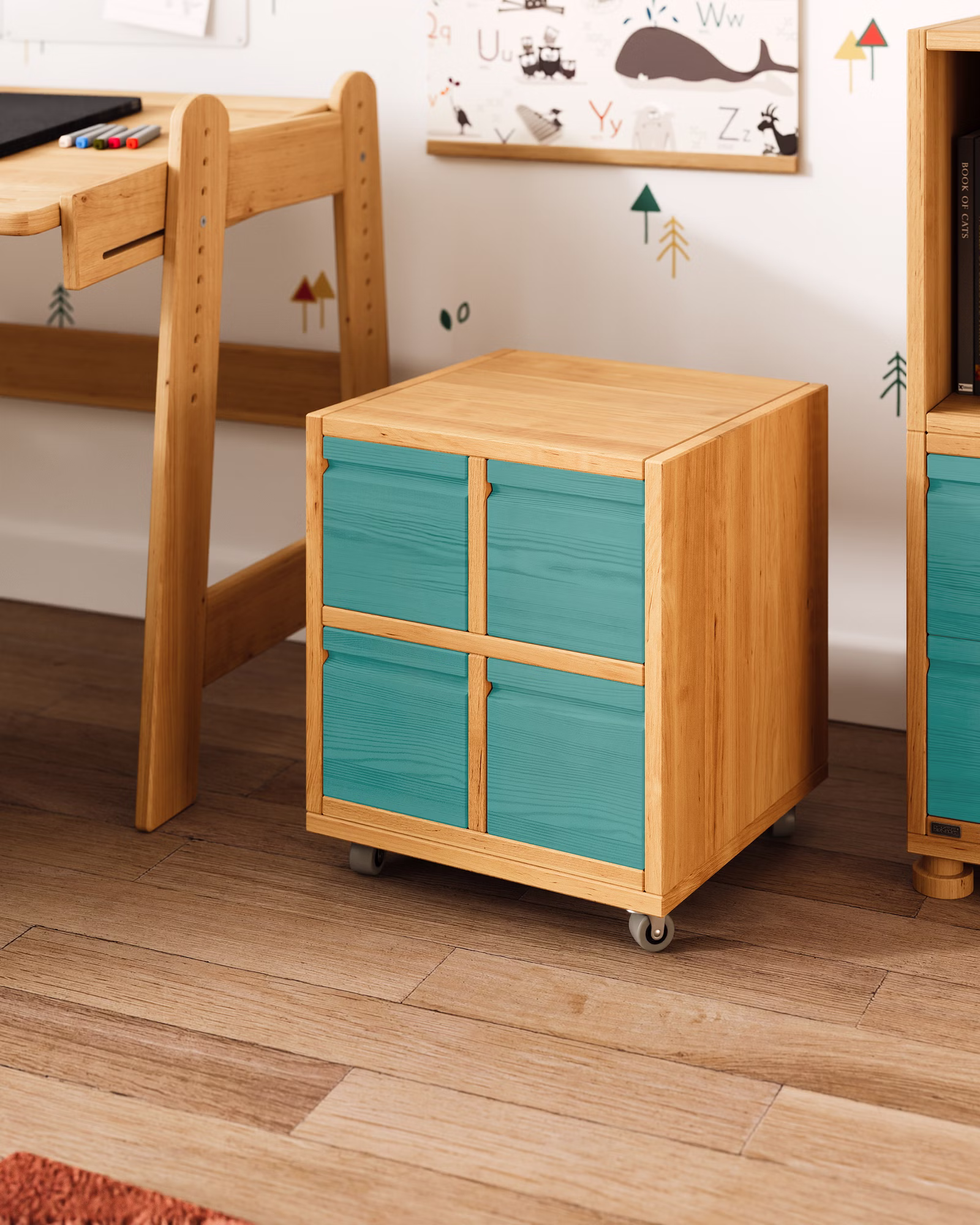 Unser Laura Rollcontainer mit vier Office-Boxen wird aus Bio-Massivholz gefertigt und ist die praktische Ergänzung für jeden Schreibtisch im Kinderzimmer oder Büro. Die Schubladen können farblich auf die Einrichtung abgestimmt werden und setzen so fröhliche Farbakzente im Kinderzimmer.