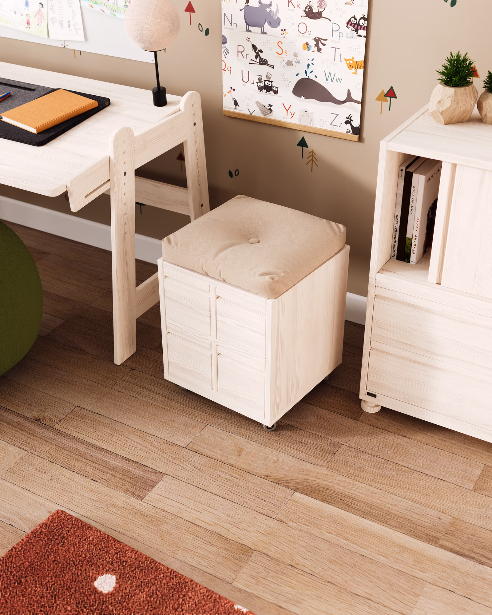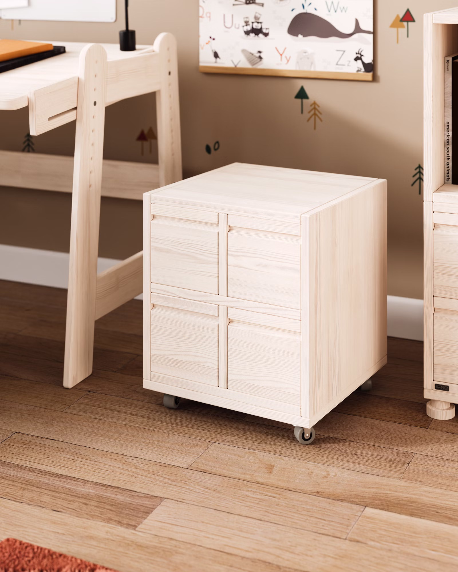 Unser Laura Rollcontainer mit vier Office-Boxen wird aus Bio-Massivholz gefertigt und ist die praktische Ergänzung für jeden Schreibtisch im Kinderzimmer oder Büro. Die Schubladen können farblich auf die Einrichtung abgestimmt werden und setzen so fröhliche Farbakzente im Kinderzimmer.
