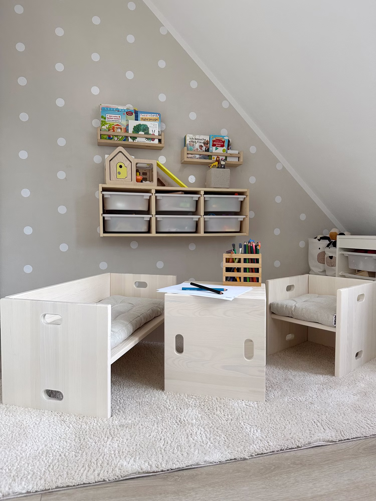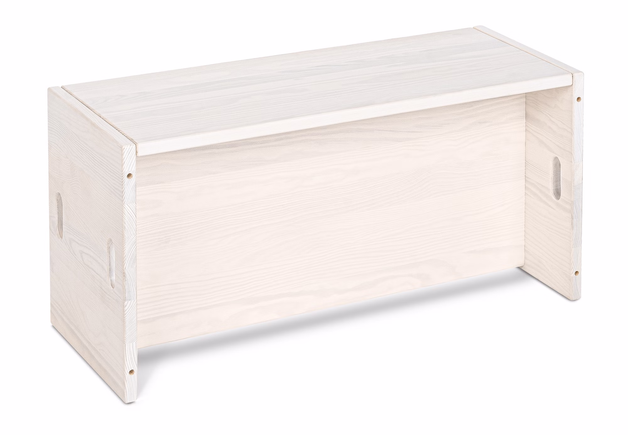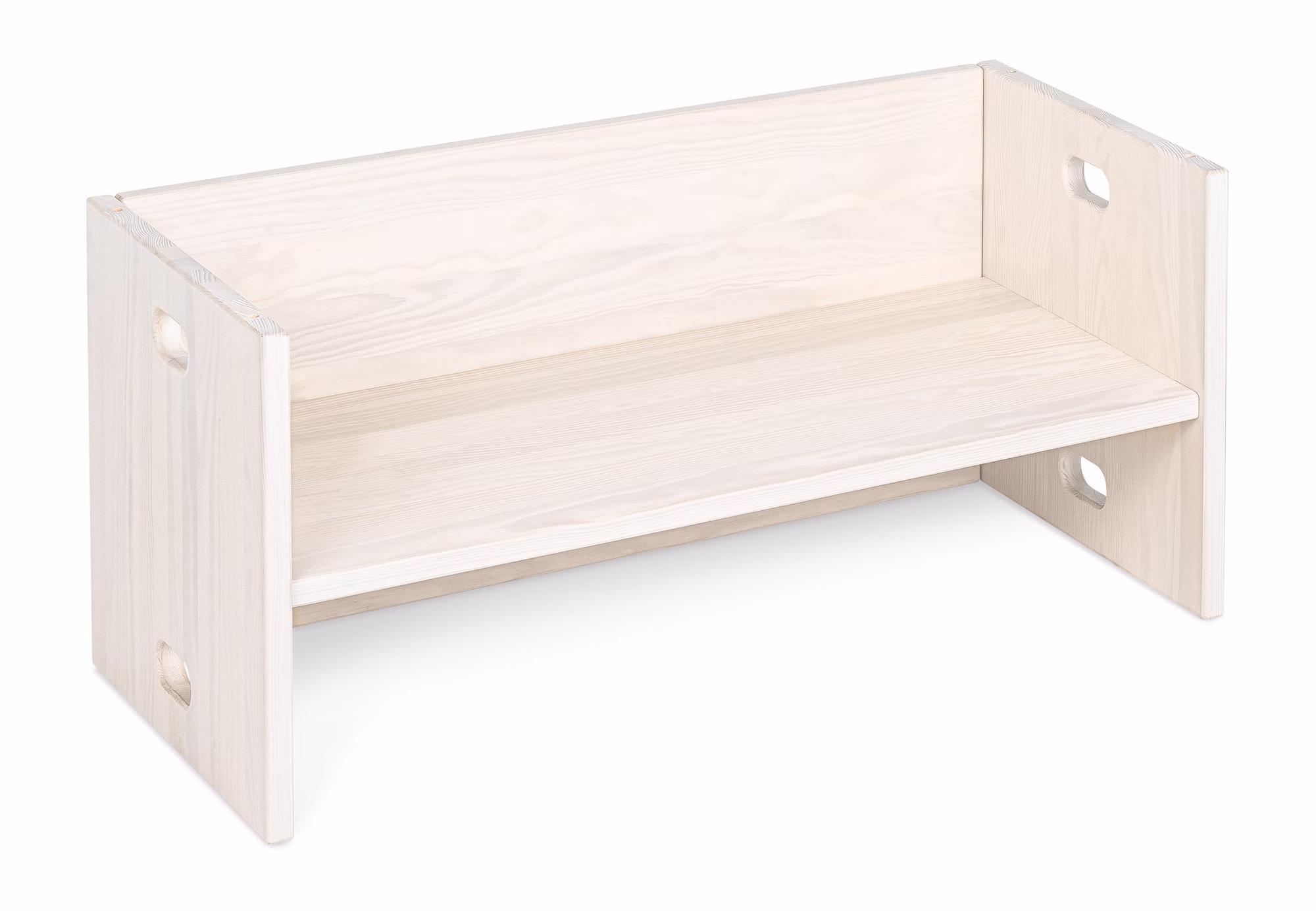 Mit einer Sitzhöhe von 17 cm dient sie bereits für kleine Kinder als bequeme Sitzgelegenheit, dreht man Sie um bietet sie eine zweite Sitzhöhe von 19 cm. Auf die Seite gelegt wird sie zu einem Tischchen oder einer Bank ohne Lehne mit 38 cm Sitzhöhe. Mehrere Bänke übereinander gestapelt ergeben ein funktionales Regal. Spielsachen einsammeln, aufeinander stapeln, und schon ist Ordnung. An den formschönen Griffmulden lässt sich Elena gut halten und tragen.