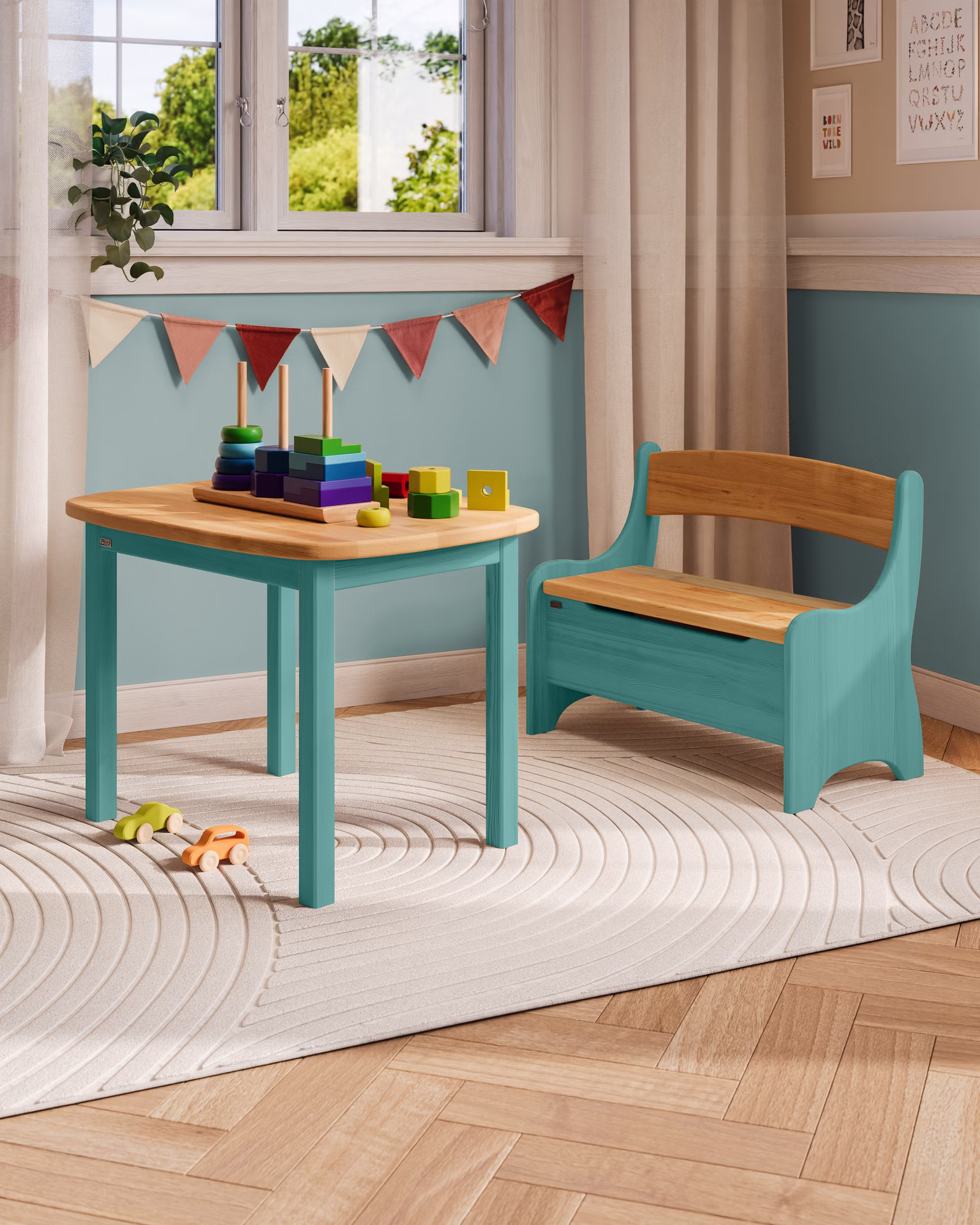 Auf der Levin Kindersitzbank sitzen, malen und spielen zwei Kinder. Auch hier haben wir besonders auf eine stabile Konstruktion mit Kippsicherheit und schöne Formgebung geachtet. Und die Levin Kindersitzbank kann noch mehr: Die Sitzfläche zurückklappen, und darunter kommt eine Spieltruhe zum Verstauen von Spielsachen und anderem zum Vorschein. Diese praktische Zwei-in-einem-Funktion macht die Levin Kindersitzbank zu einem richtig nachhaltigen Kinderzimmermöbel. In die Sitzfläche ist eine Aussparung für einfaches und sicheres Öffnen und Schließen eingearbeitet.