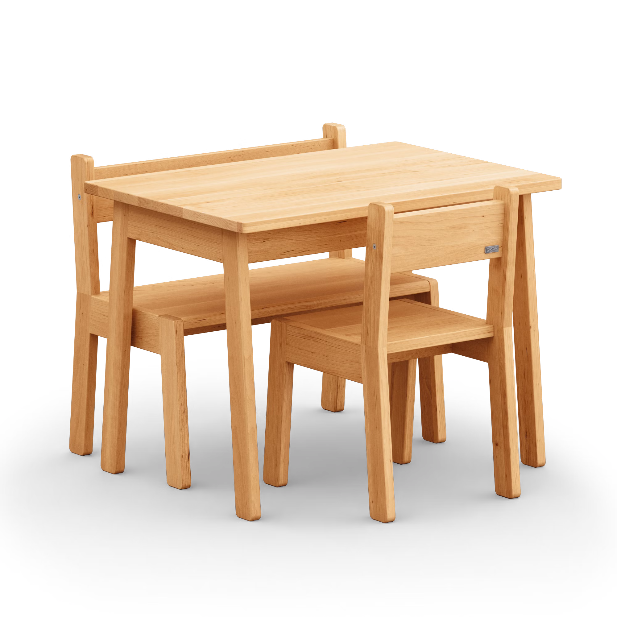 Die Sitzgruppe wird aus 100% Bio-Massivholz gefertigt und ist dadurch äußerst robust, alltagstauglich und für viele Jahre gemacht. Flache Sitzflächen, klare Linien und eine durchdachte Konstruktion machen Mogli zu einem verlässlichen Begleiter im Kinderzimmer wie auch im Kita-Alltag. Praktisch und aufgeräumt: Bank und Stühle lassen sich platzsparend unter den Tisch schieben oder einfach umgedreht auf dem Tisch verstauen.