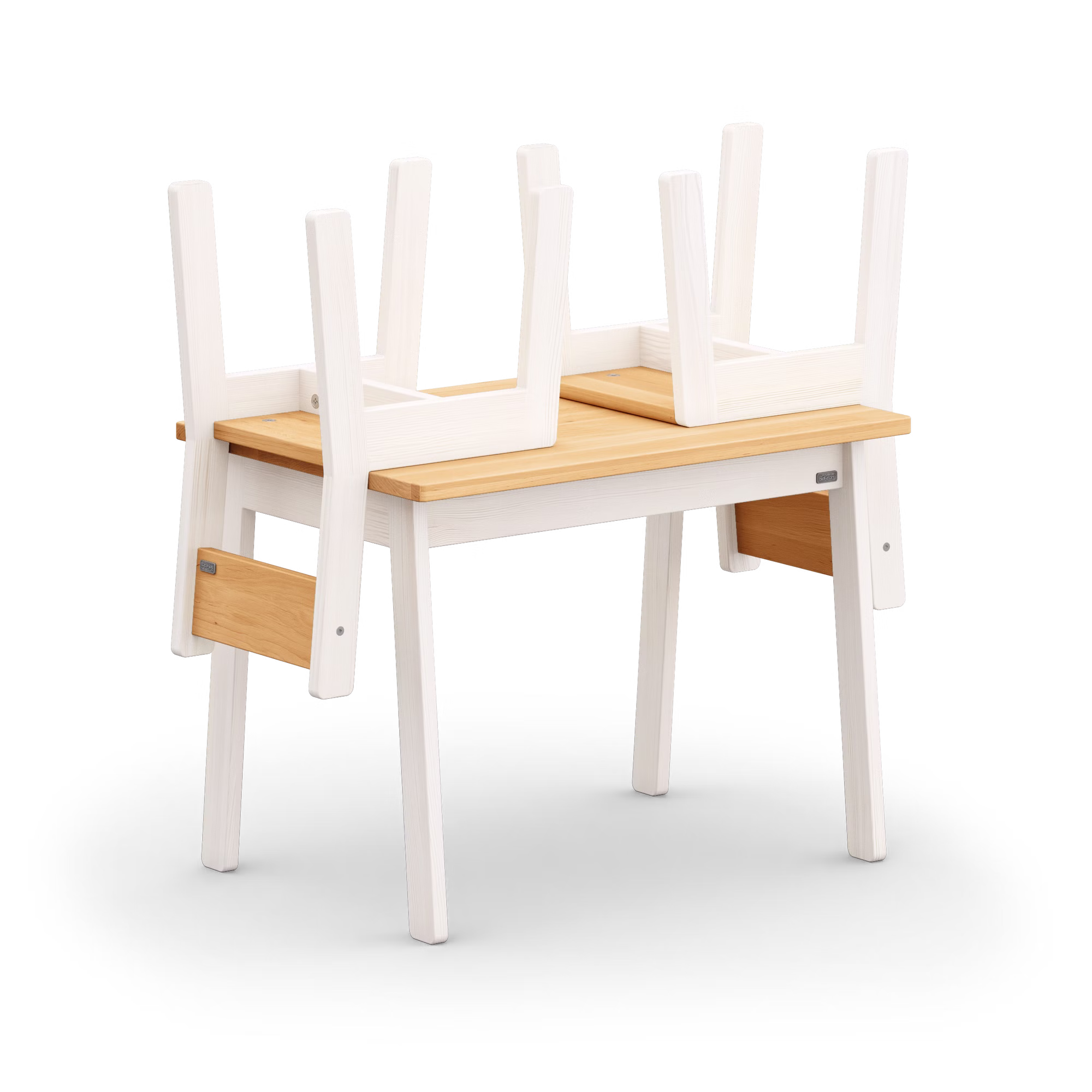 Die Sitzbank bietet Platz für zwei Kinder und lädt zum gemeinsamen Spielen, Malen oder Lernen ein. Klare Linien, ausgewogene Proportionen und die stabile Massivholz-Konstruktion sorgen für Komfort und ein angenehmes Sitzgefühl.