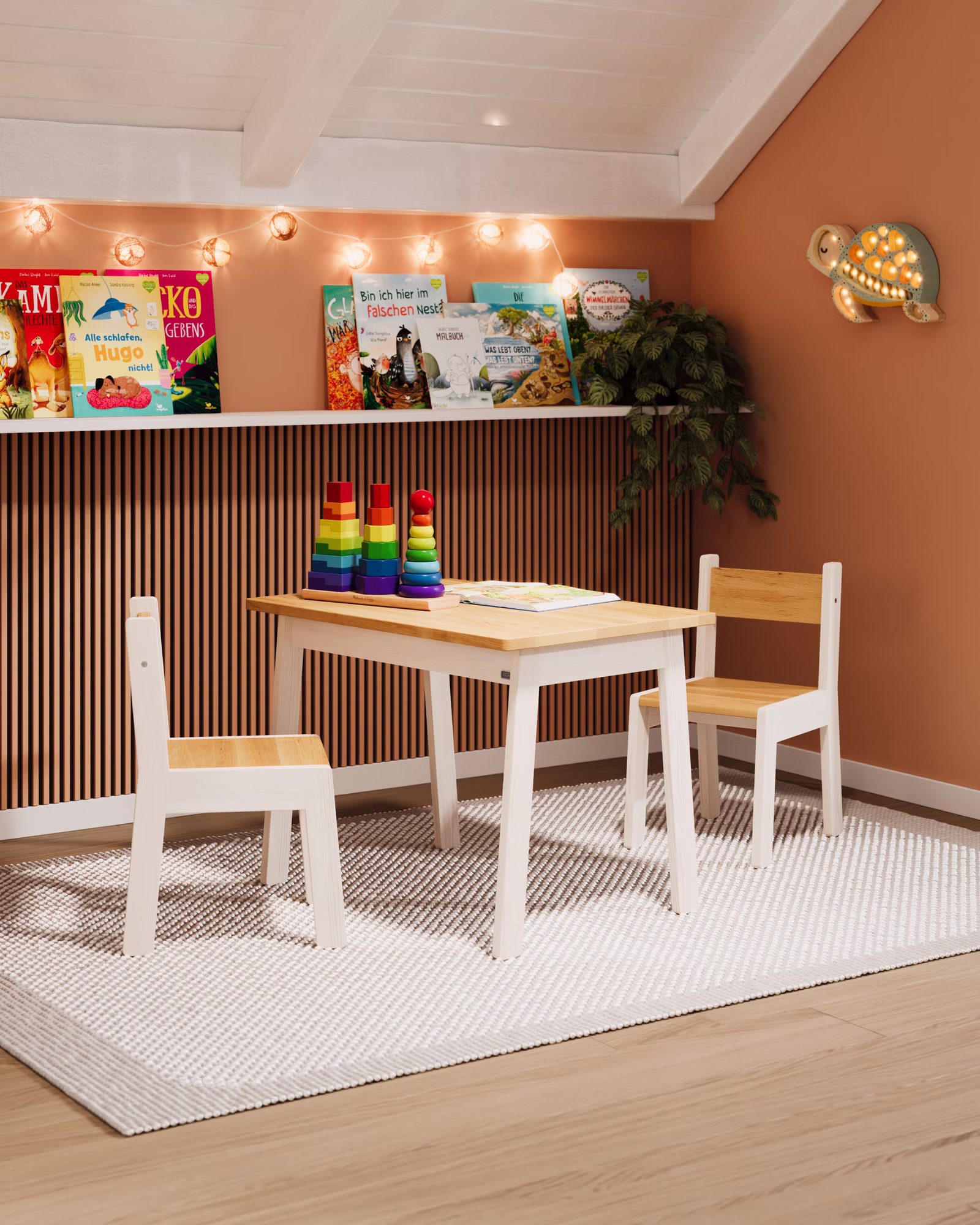 Die Sitzgruppe wird aus 100% Bio-Massivholz gefertigt und ist dadurch äußerst robust, alltagstauglich und für viele Jahre gemacht. Flache Sitzflächen, klare Linien und eine durchdachte Konstruktion machen Mogli zu einem verlässlichen Begleiter im Kinderzimmer wie auch im Kita-Alltag. Praktisch und aufgeräumt: Bank und Stühle lassen sich platzsparend unter den Tisch schieben oder einfach umgedreht auf dem Tisch verstauen.