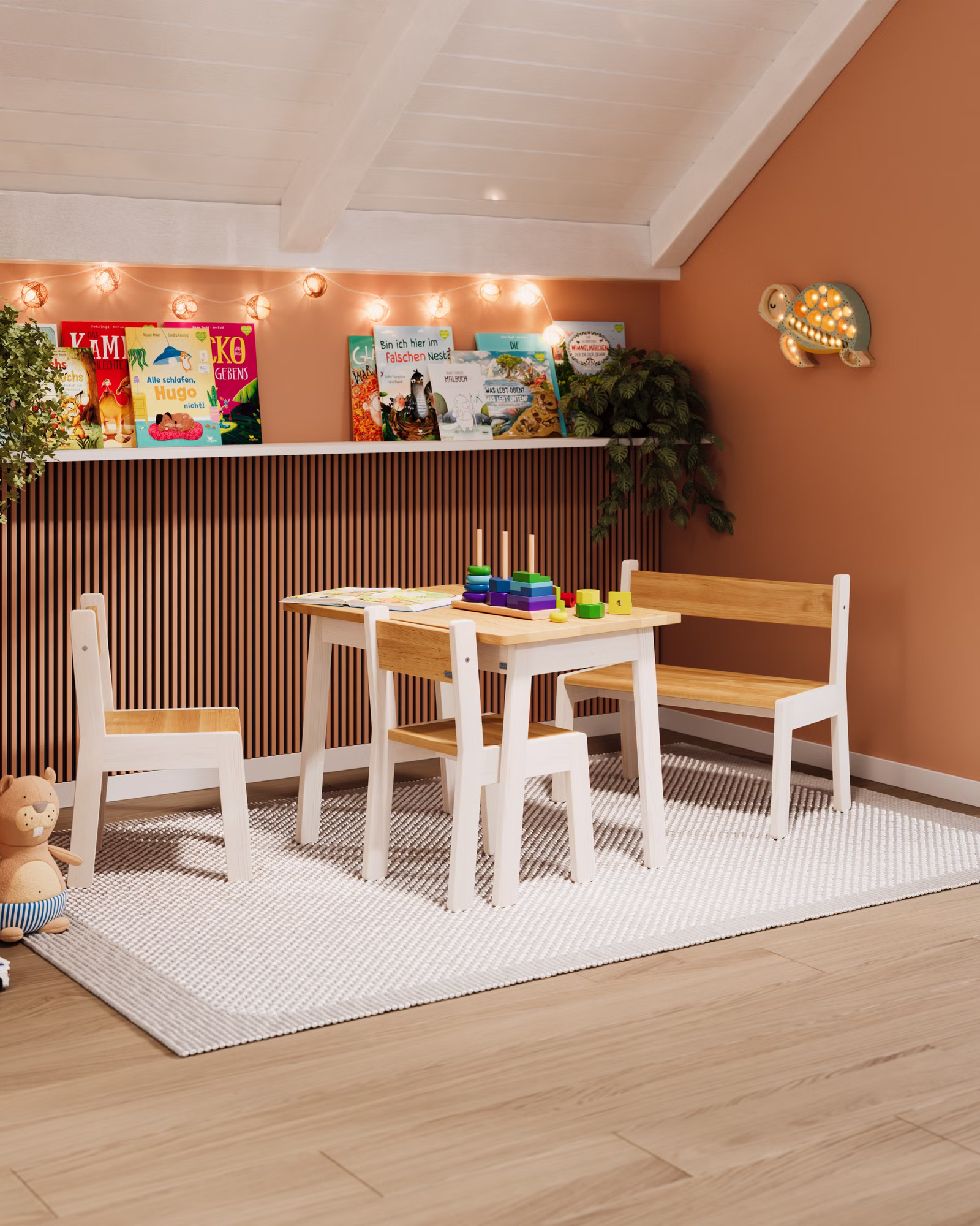 Die Mogli Sitzgruppe ist ein Ort für Ideen und große Fantasie. Ein Ort, an dem gemalt, gebastelt, gebaut, gelesen und gespielt wird. Hier entstehen Ideen, kleine Kunstwerke und große Geschichten – ganz nebenbei und ohne Vorgaben.