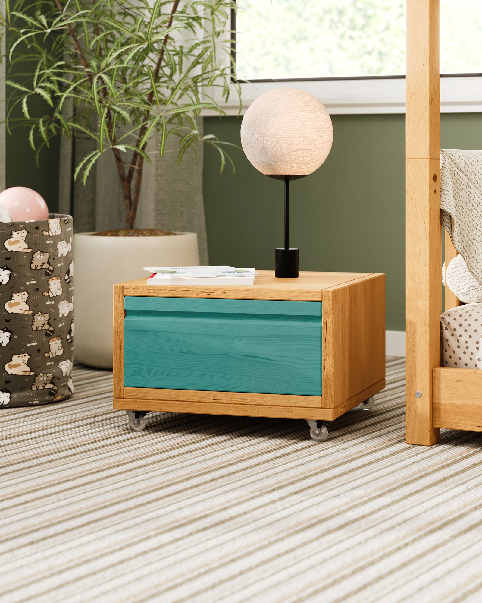 Unser Laura Nachttisch mit Schublade wird aus Bio-Massivholz gefertigt und begeistert mit seinem modernen, schlichten Design. Die Kombination aus praktischem Laura Regalwürfel und flachem Regalsockel bietet vielseitige Nutzungsmöglichkeiten. So eignet sich das Set ideal als flacher Nachttisch, mit dem wichtige Gegenstände auch nachts stets griffbereit aufbewahrt werden können. Ein passendes Sitzkissen macht den Nachttisch schnell zu einem gemütlichen Hocker und die mitgelieferten Rollen für den Regalsockel verwandeln das Set leicht in ein praktisches Rolltischchen.