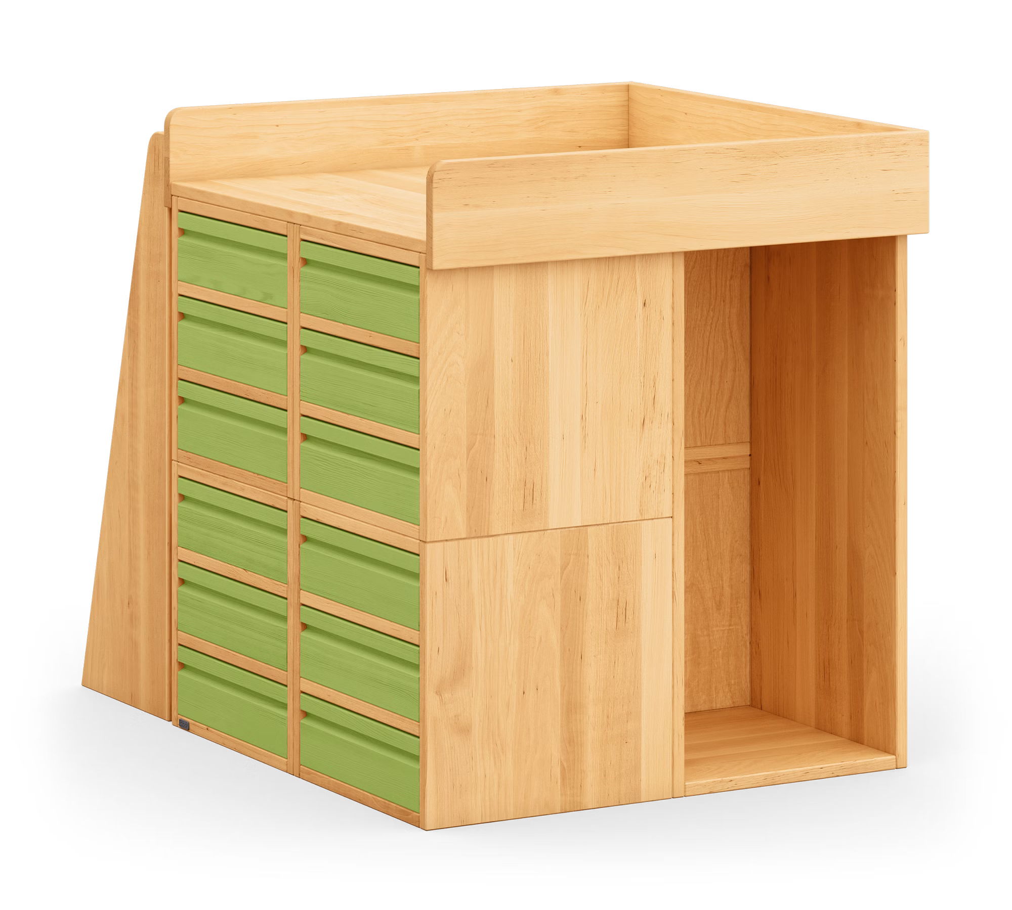 Dank zwölf geräumigen Schubladen können Wickelutensilien, Kleidung und Spielzeug speziell für jedes Kind separat und geordnet verstaut werden. Die elegant gefrästen Griffmulden an der Vorderseite der Schubladen und das schöne Griffloch hinten ermöglichen eine individuelle Gestaltung der Front und ein leichtes Öffnen und Schließen.