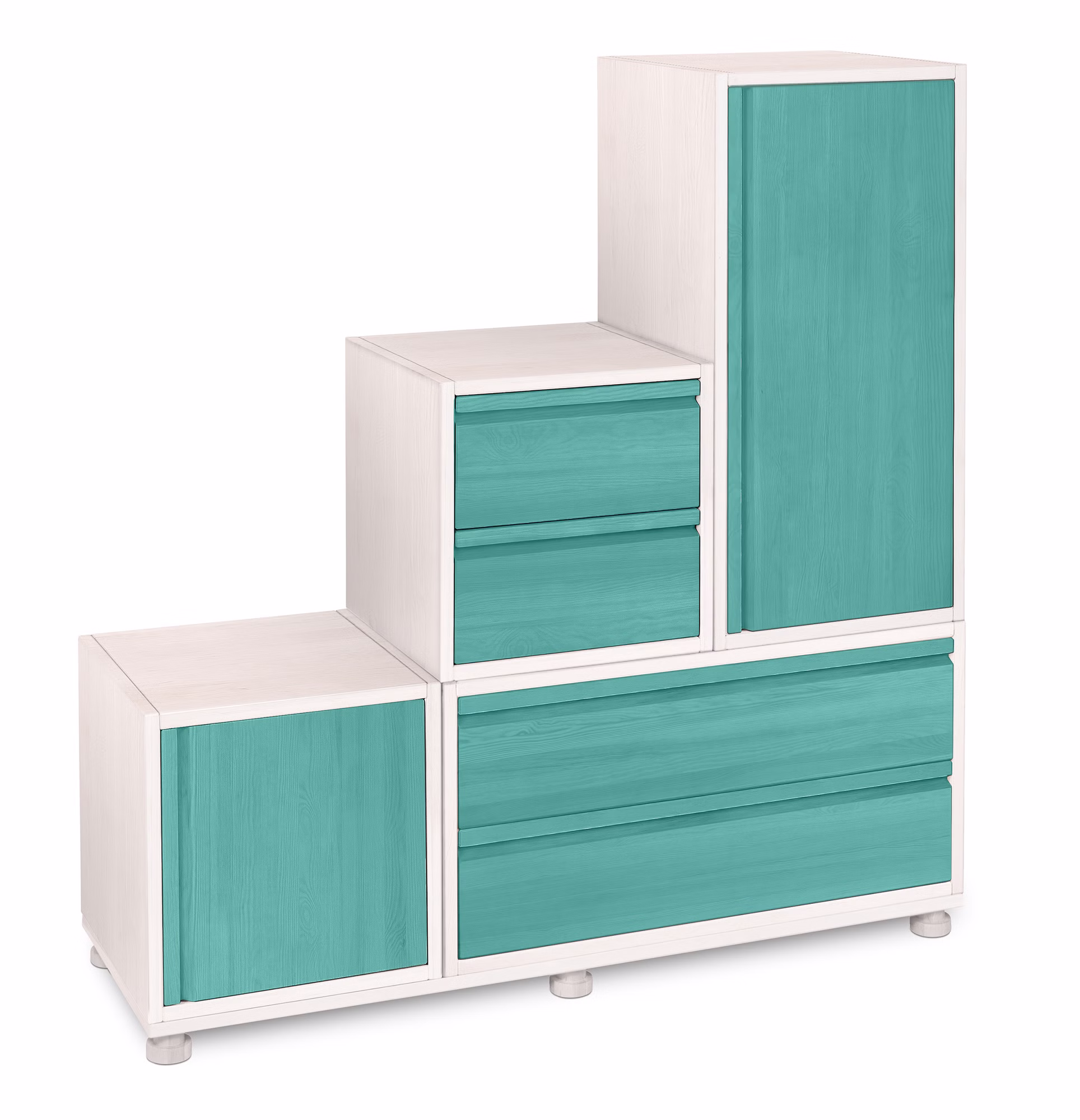 Unser Laura Sideboard wird aus Bio-Massivholz gefertigt und ergänzt jedes Zimmer dank ihrer flexiblen Einsatzmöglichkeiten ideal. Die stufig angeordnete Kommode passt in jeden Raum und findet dabei auch unterhalb von Dachschrägen Platz. Die Kombination aus Regalwürfeln mit Türen und Schubladen sorgt schnell für eine verbesserte Übersichtlichkeit und Ordnung, sodass kleinere und größere Gegenstände bequem verstaut werden können.