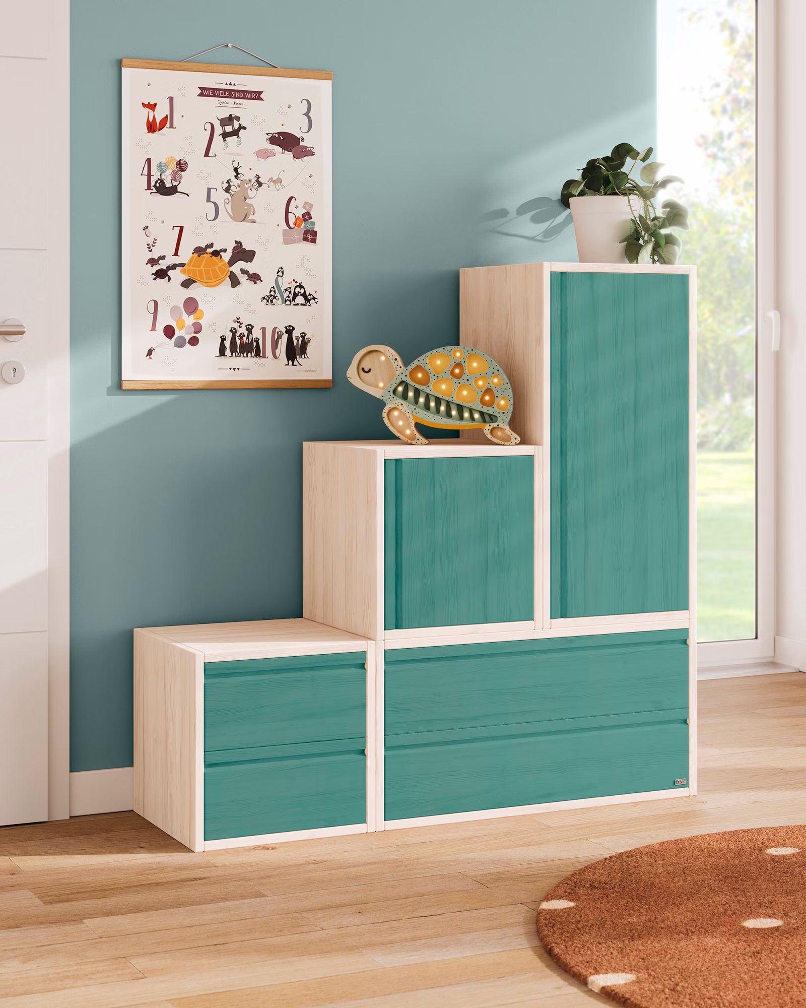 Die einzelnen Laura Regalwürfel können flexibel kombiniert und immer wieder neu zusammengefügt werden, sodass sie individuelle Kommoden, Regale und Raumteiler ergeben. Dank dieser vielseitigen und individuellen Einsatzmöglichkeiten ist die Laura Stufenkommode ein mitwachsendes Möbelstück, das lange Freude bereitet.