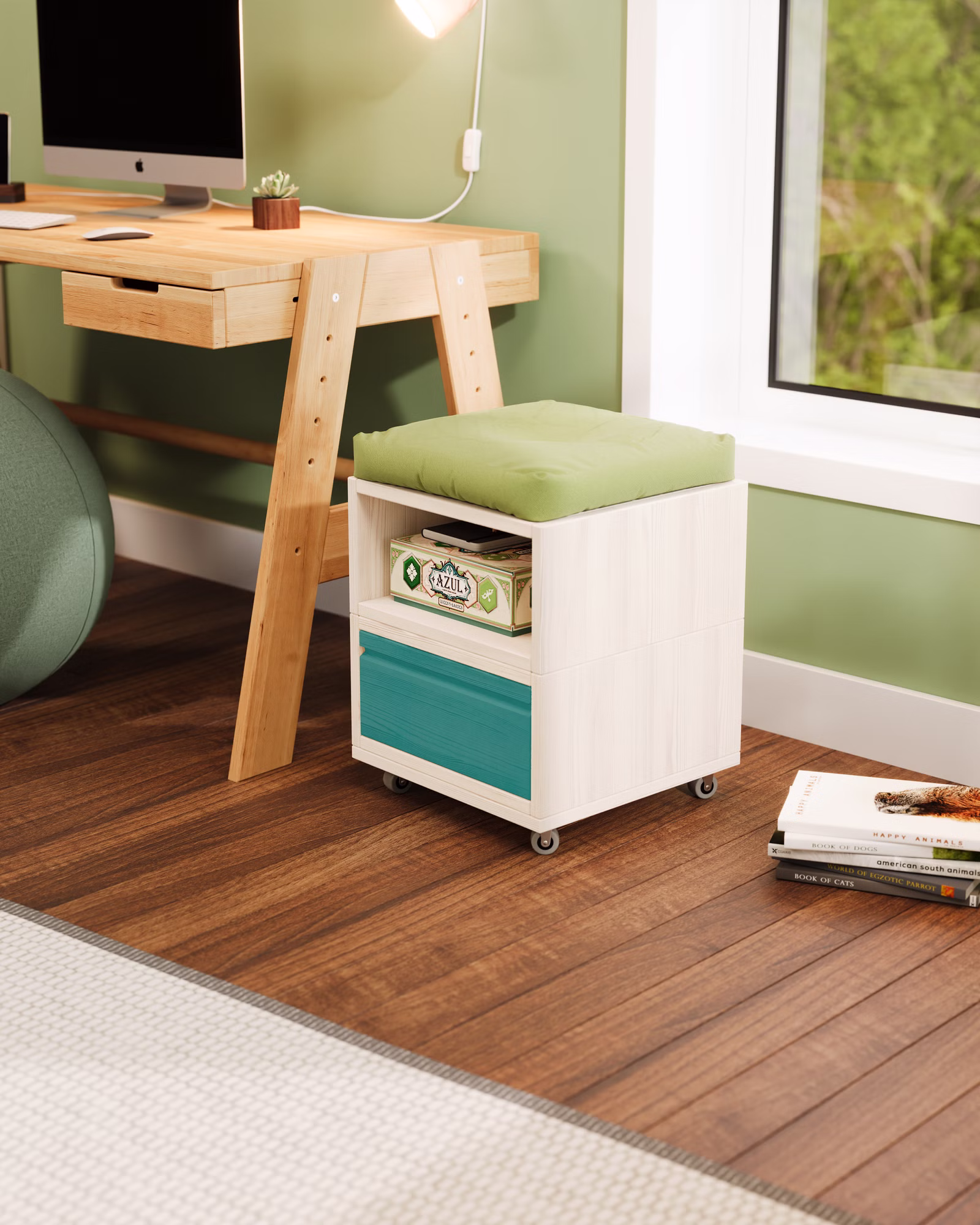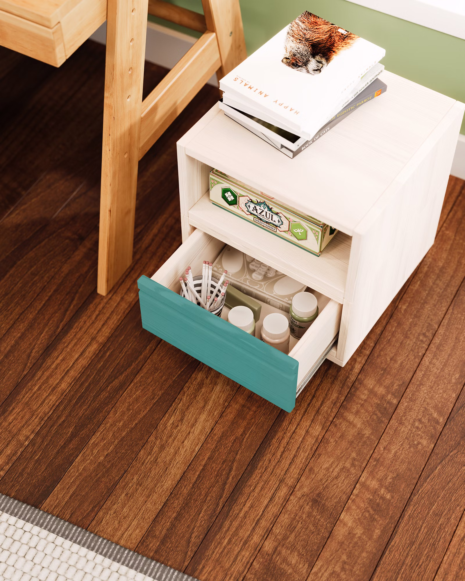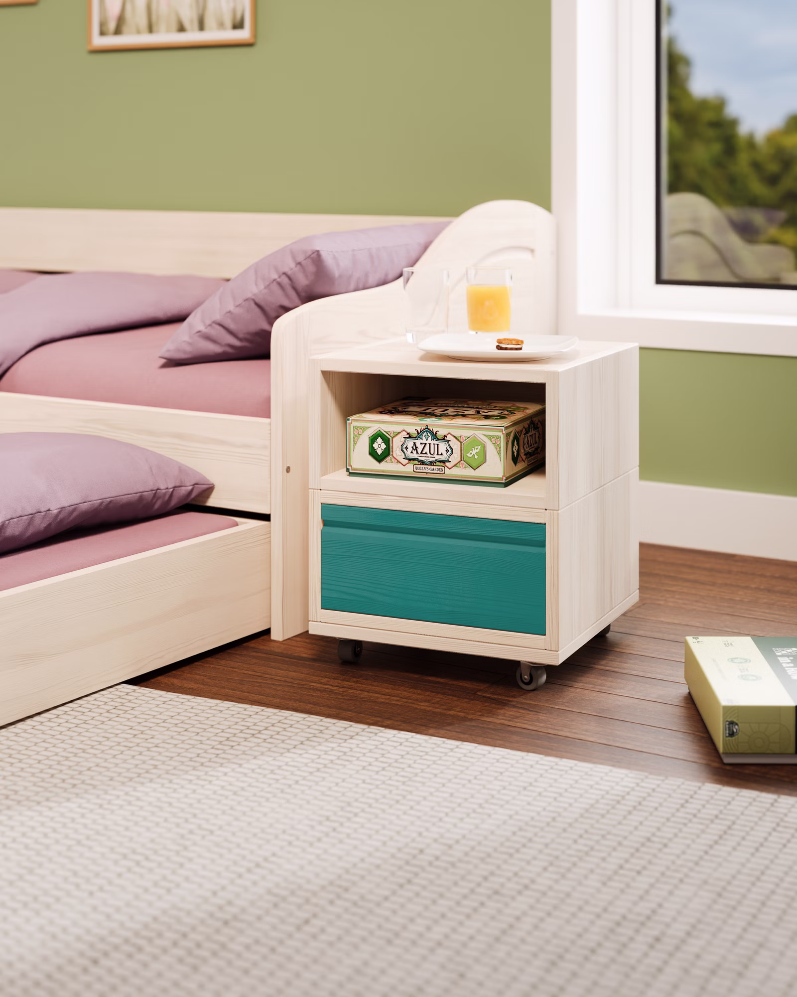 Unser Laura Rollcontainer mit einer Schublade und einem offenen Element wird aus Bio-Massivholz gefertigt und ist die praktische Ergänzung für jeden Schreibtisch im Kinderzimmer oder Büro. Die Schublade kann farblich auf die Einrichtung abgestimmt werden und setzt so fröhliche Farbakzente im Kinderzimmer.
