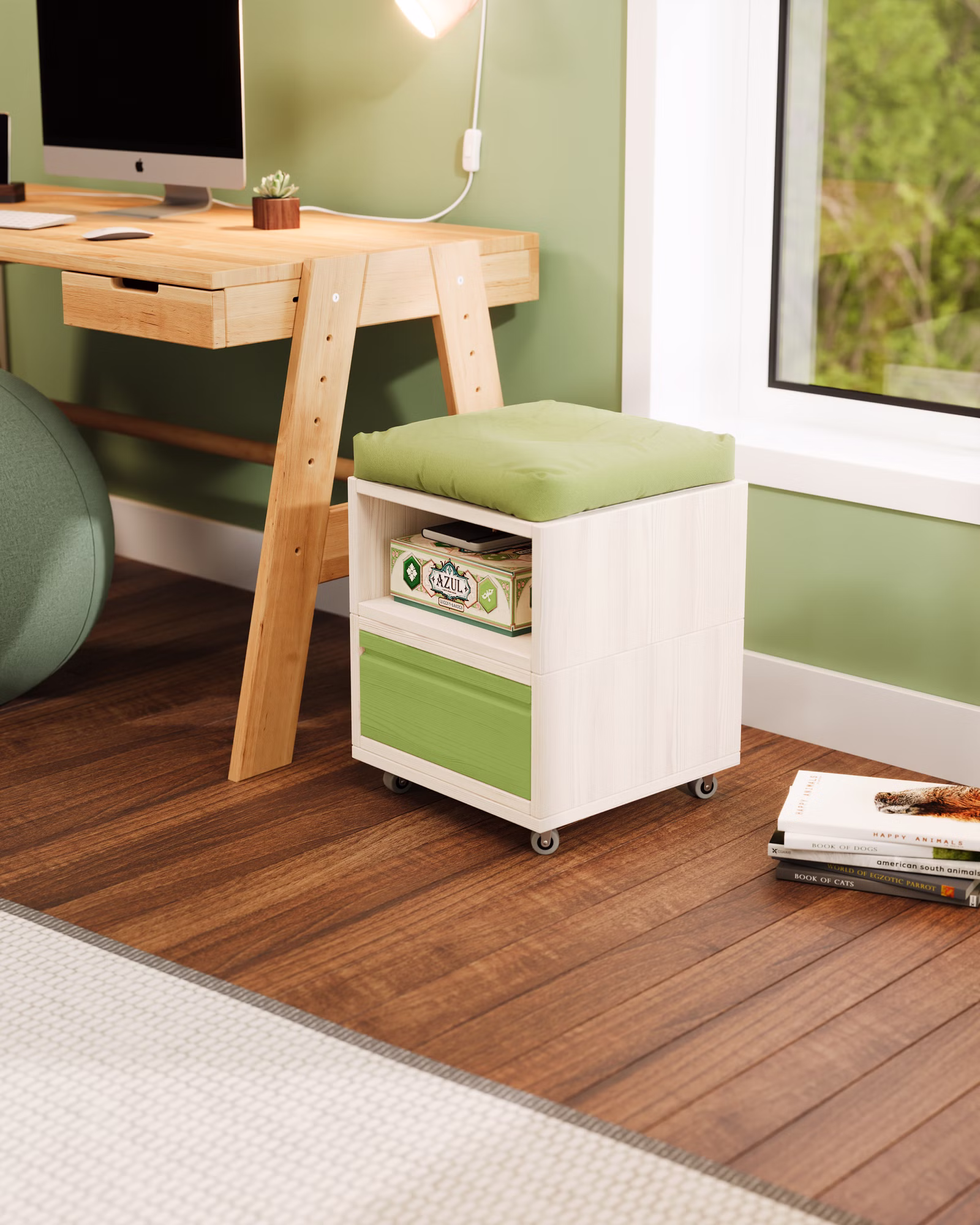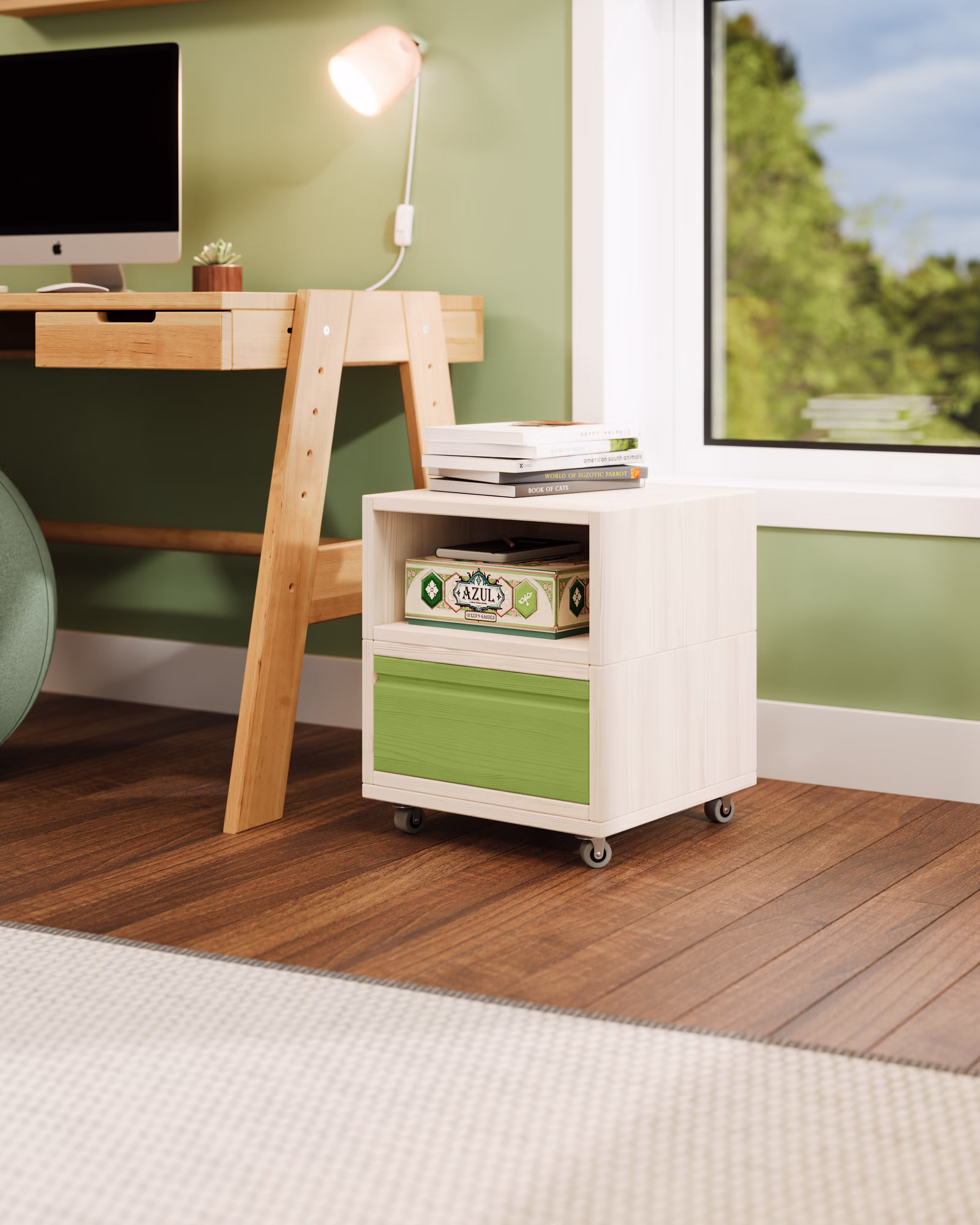 Unser Laura Rollcontainer mit einer Schublade und einem offenen Element wird aus Bio-Massivholz gefertigt und ist die praktische Ergänzung für jeden Schreibtisch im Kinderzimmer oder Büro. Die Schublade kann farblich auf die Einrichtung abgestimmt werden und setzt so fröhliche Farbakzente im Kinderzimmer.