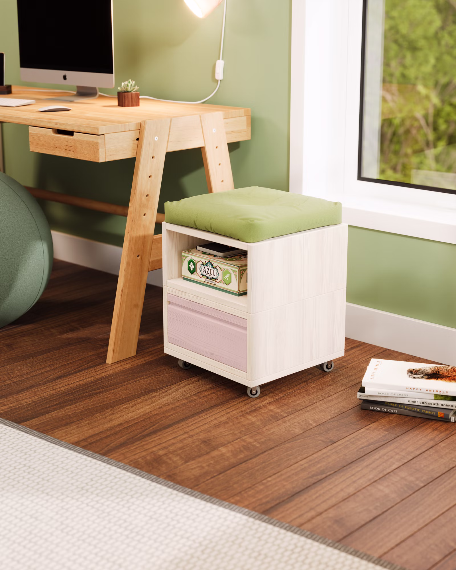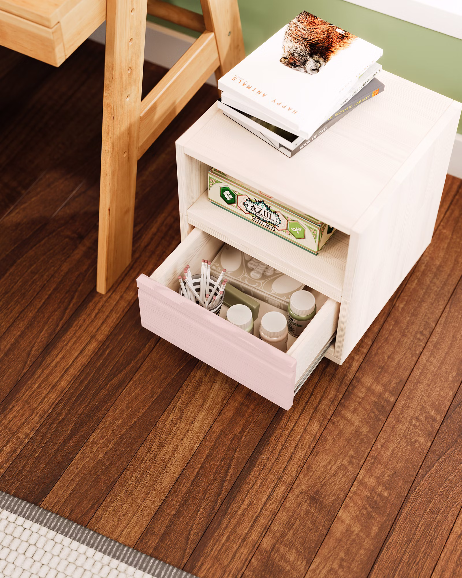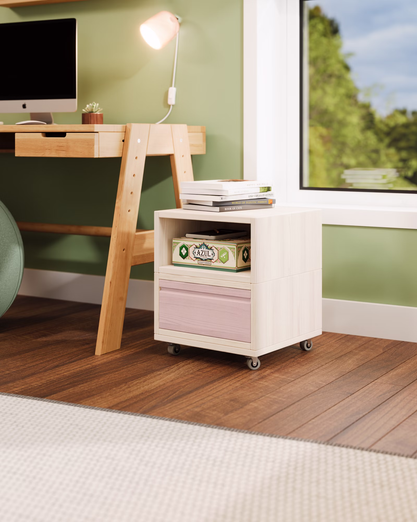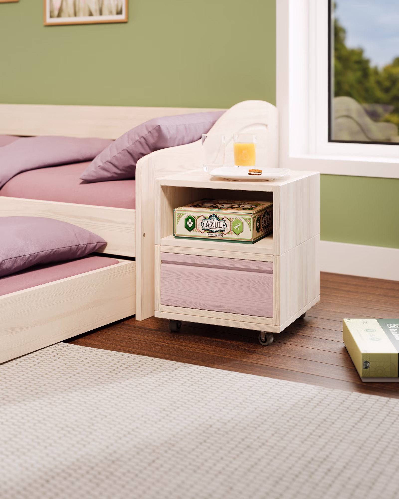 Unser Laura Rollcontainer mit einer Schublade und einem offenen Element wird aus Bio-Massivholz gefertigt und ist die praktische Ergänzung für jeden Schreibtisch im Kinderzimmer oder Büro. Die Schublade kann farblich auf die Einrichtung abgestimmt werden und setzt so fröhliche Farbakzente im Kinderzimmer.