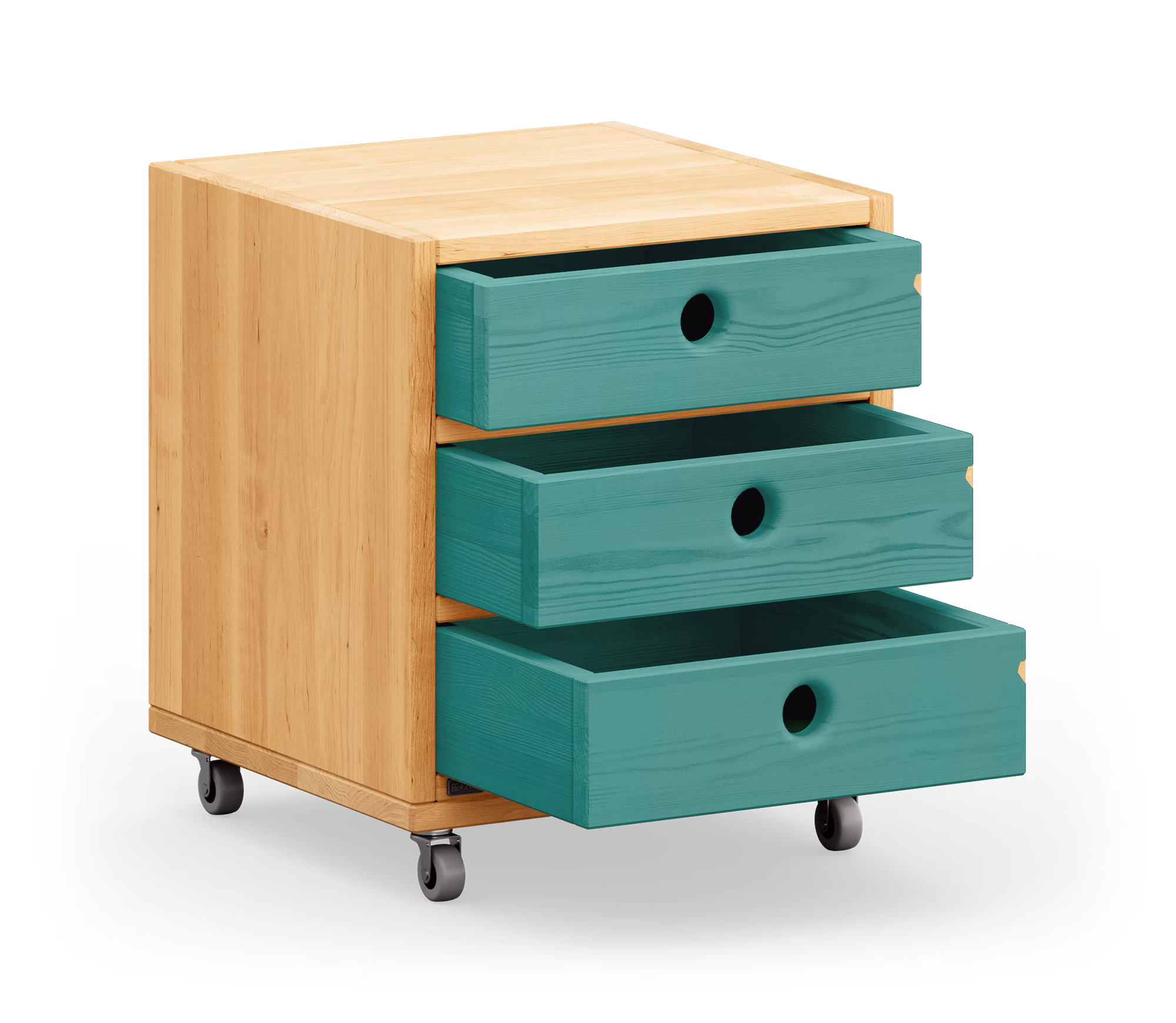Unser Laura Rollcontainer mit drei Schubladen wird aus Bio-Massivholz gefertigt und ist die praktische Ergänzung für jeden Schreibtisch im Kinderzimmer oder Büro. Die Schubladen können farblich auf die Einrichtung abgestimmt werden und setzen so fröhliche Farbakzente im Kinderzimmer.