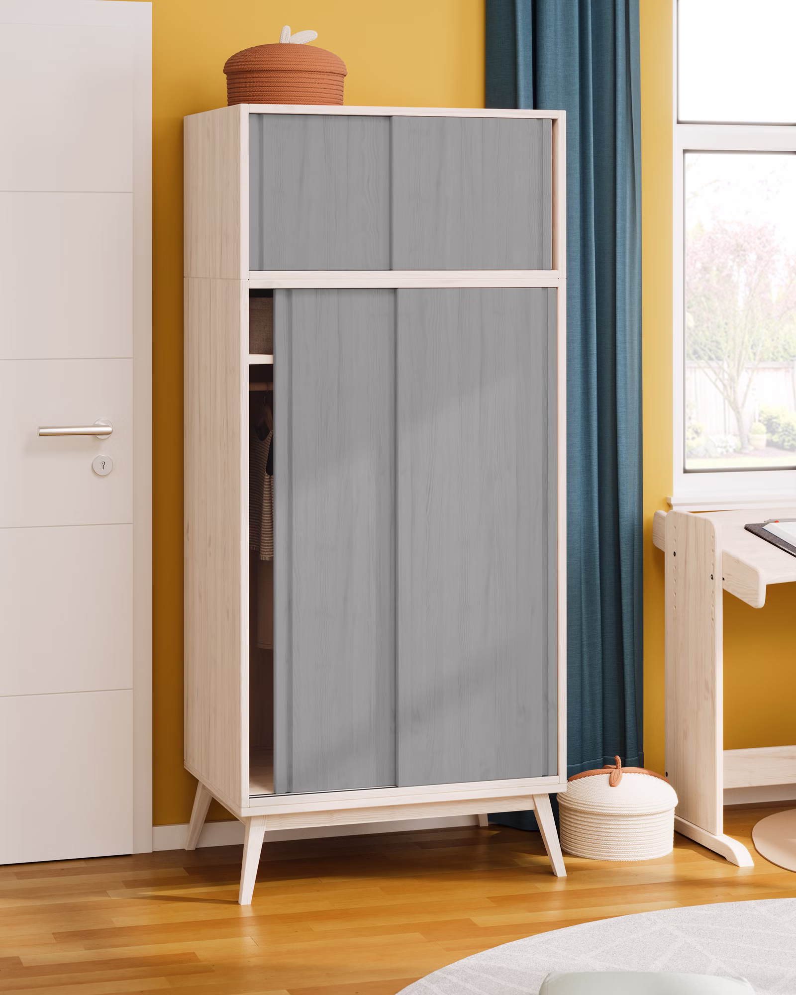 Der praktische Einlegeboden des Schranks schafft zwei geräumige Ordnungsfächer, um Kleidung, Spielsachen und vieles mehr bequem und übersichtlich zu verstauen.
