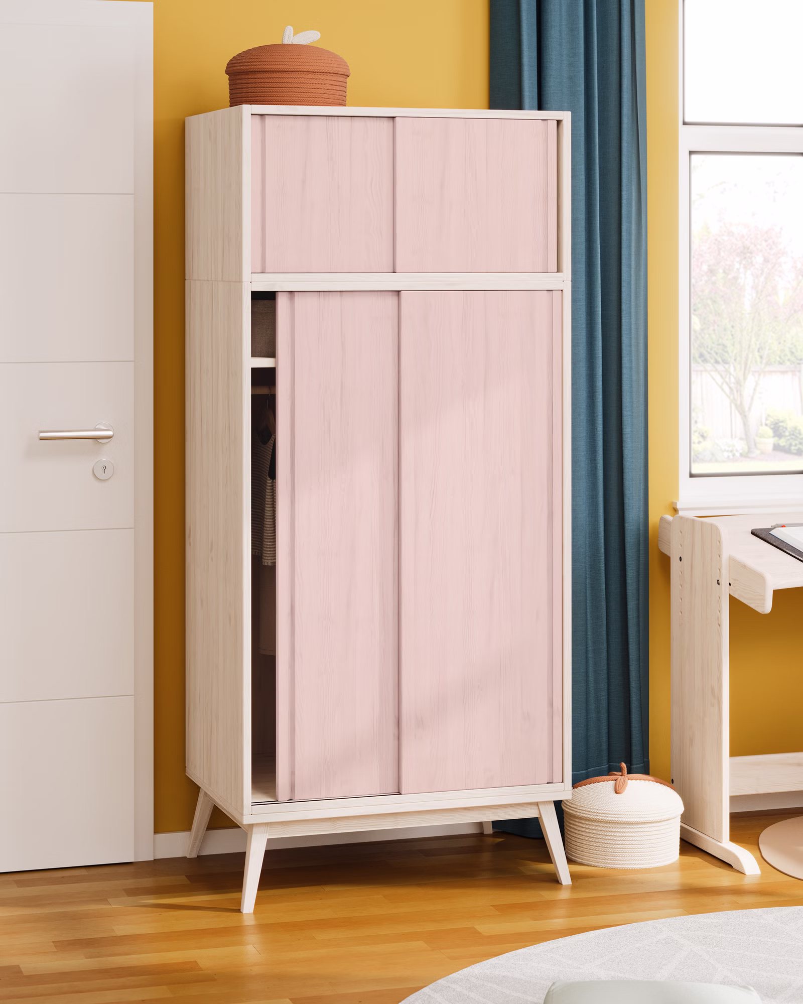 Der praktische Einlegeboden des Schranks schafft zwei geräumige Ordnungsfächer, um Kleidung, Spielsachen und vieles mehr bequem und übersichtlich zu verstauen.