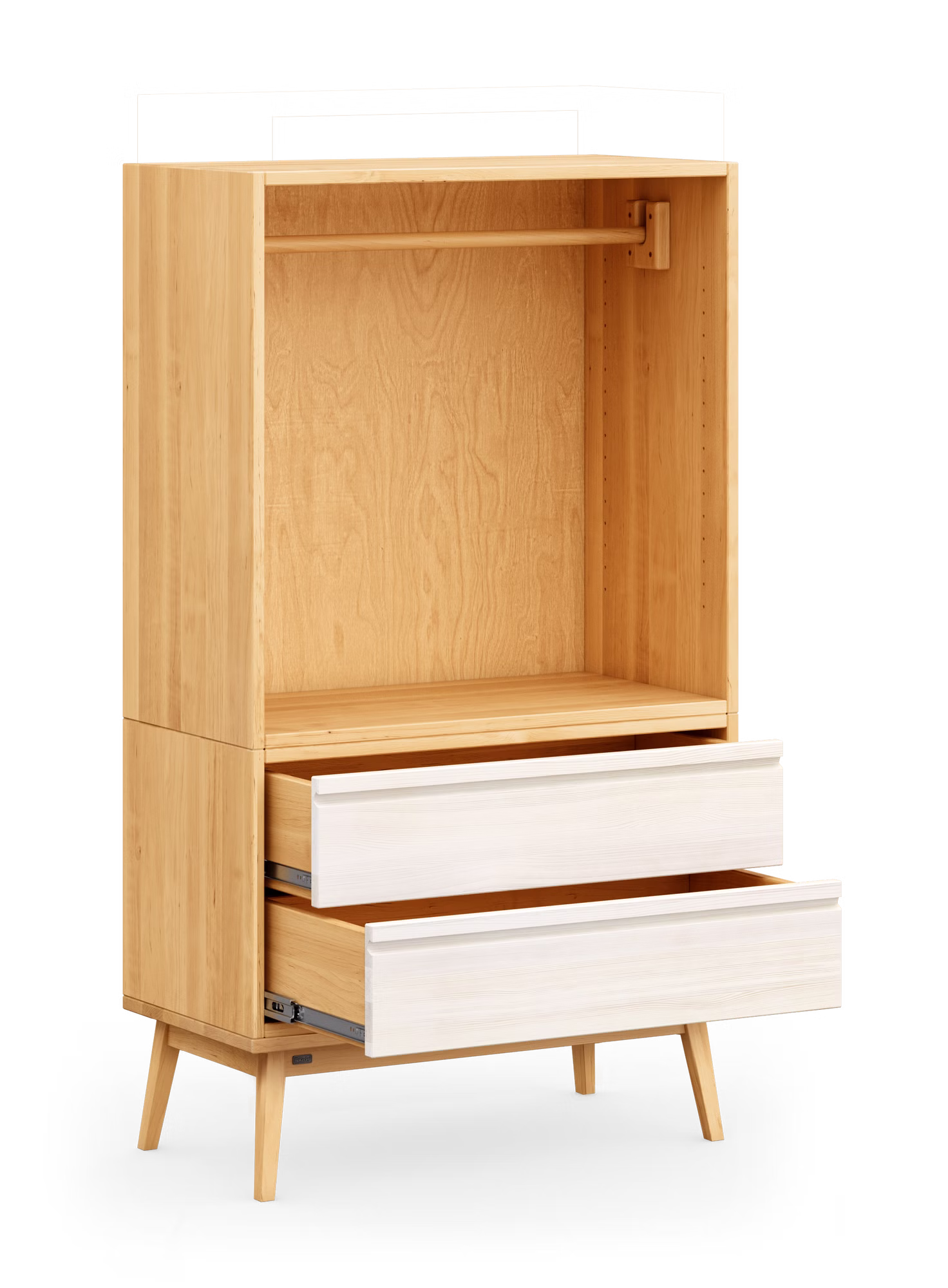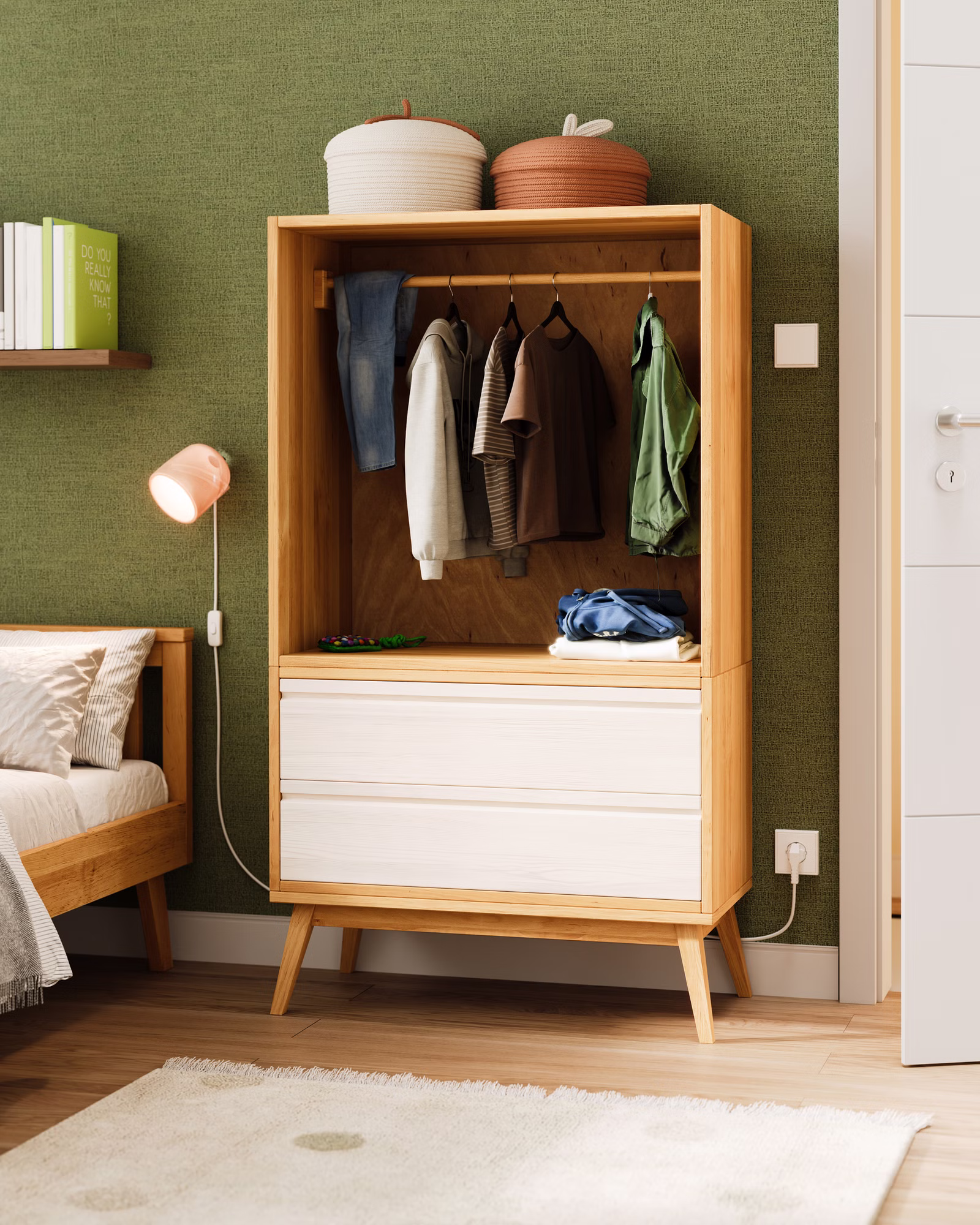 Dieses stilvolle Set vereint den beliebten Retro-Charme mit funktionalem Stauraum. Zwei geräumige Schubladen bieten Platz für Kleidung, Accessoires oder Spielzeug. Die offene Kleiderstange sorgt für eine gute Übersicht und ermöglicht schnellen Zugriff. Die Schubladen sind mit kugelgelagerten Leichtlaufschienen und praktischem Vollauszug ausgestattet. Die offene Bauweise fördert die Selbstständigkeit und stärkt das Selbstvertrauen Ihres Kindes. Die Kleidung kann eigenständig ausgewählt und geordnet werden – für einen bewussten, selbstbestimmten Alltag.