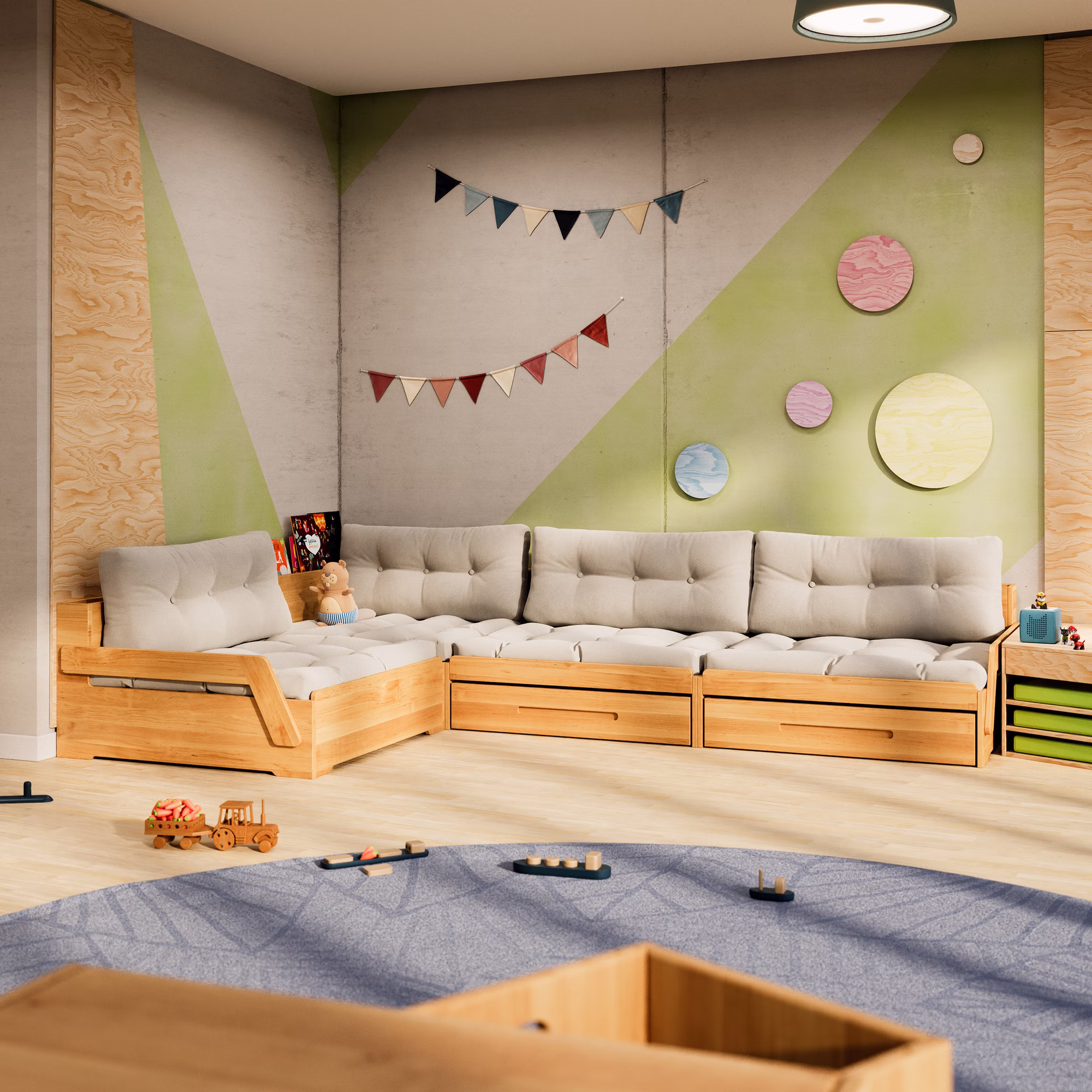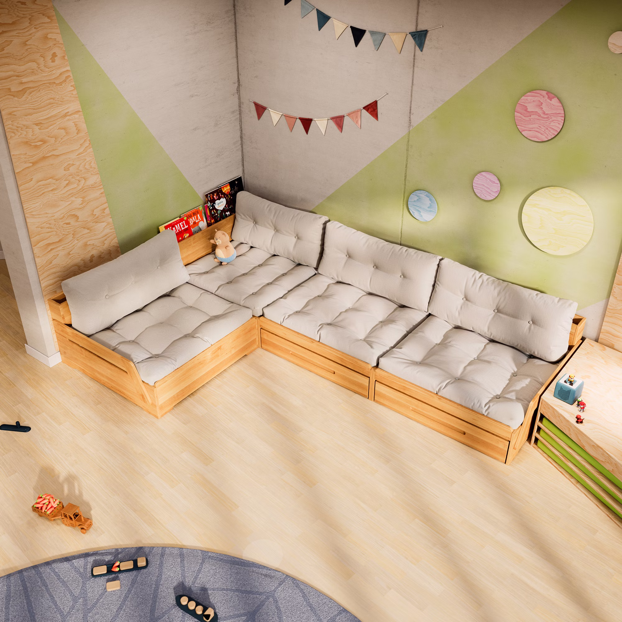 Das Lina Sofamodul vereint durchdachte Funktionalität, flexible Gestaltungsmöglichkeiten und ein nachhaltiges Design in einem zeitlos schönen Möbelstück. Ob als gemütliche Leseecke, kreativer Spielbereich oder bequemer Rückzugsort – Lina passt sich mühelos dem Alltag von Kindern an, sowohl zu Hause als auch in der Kita.