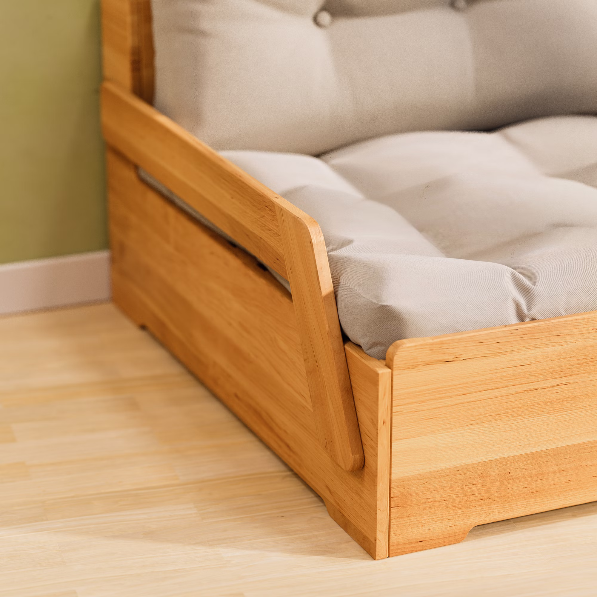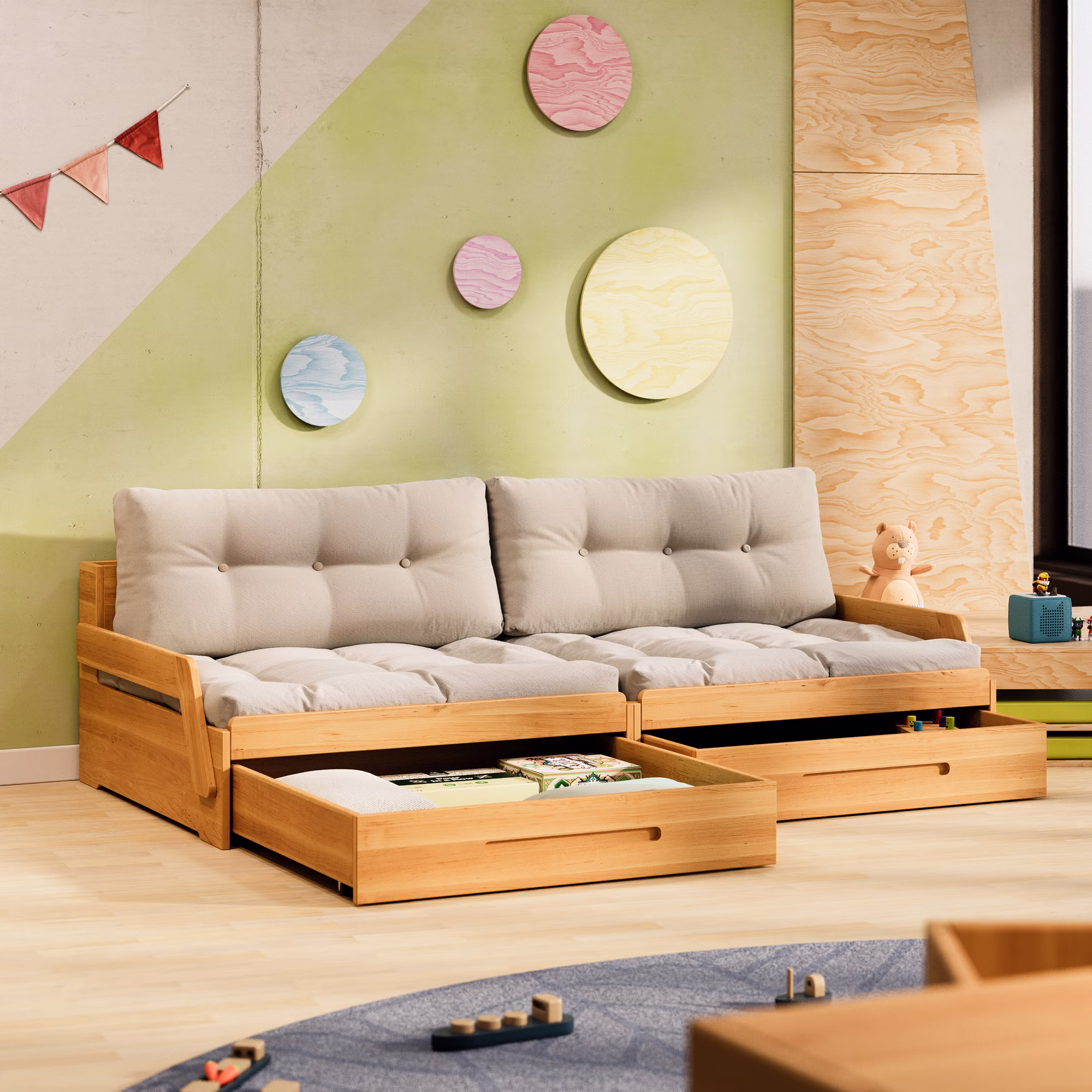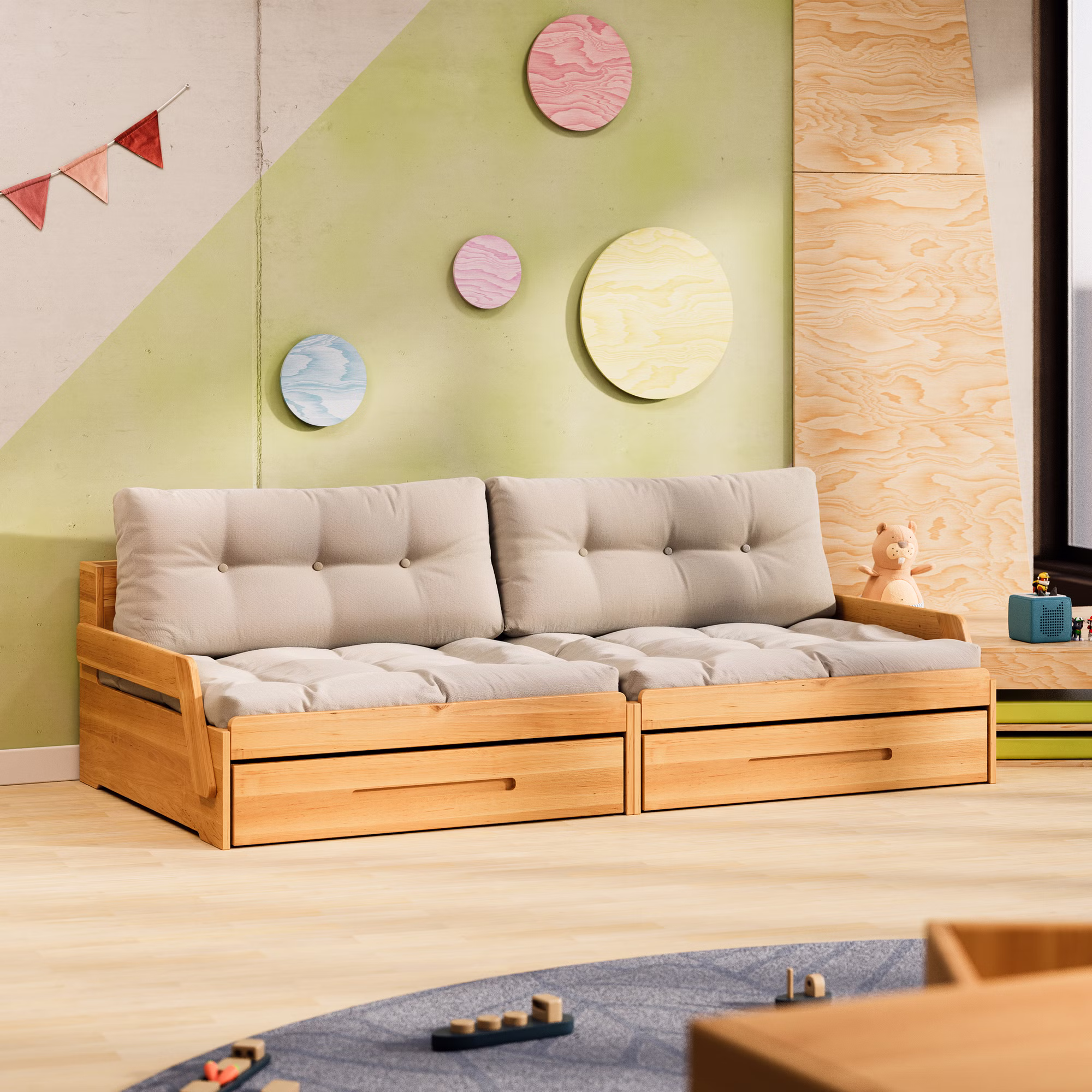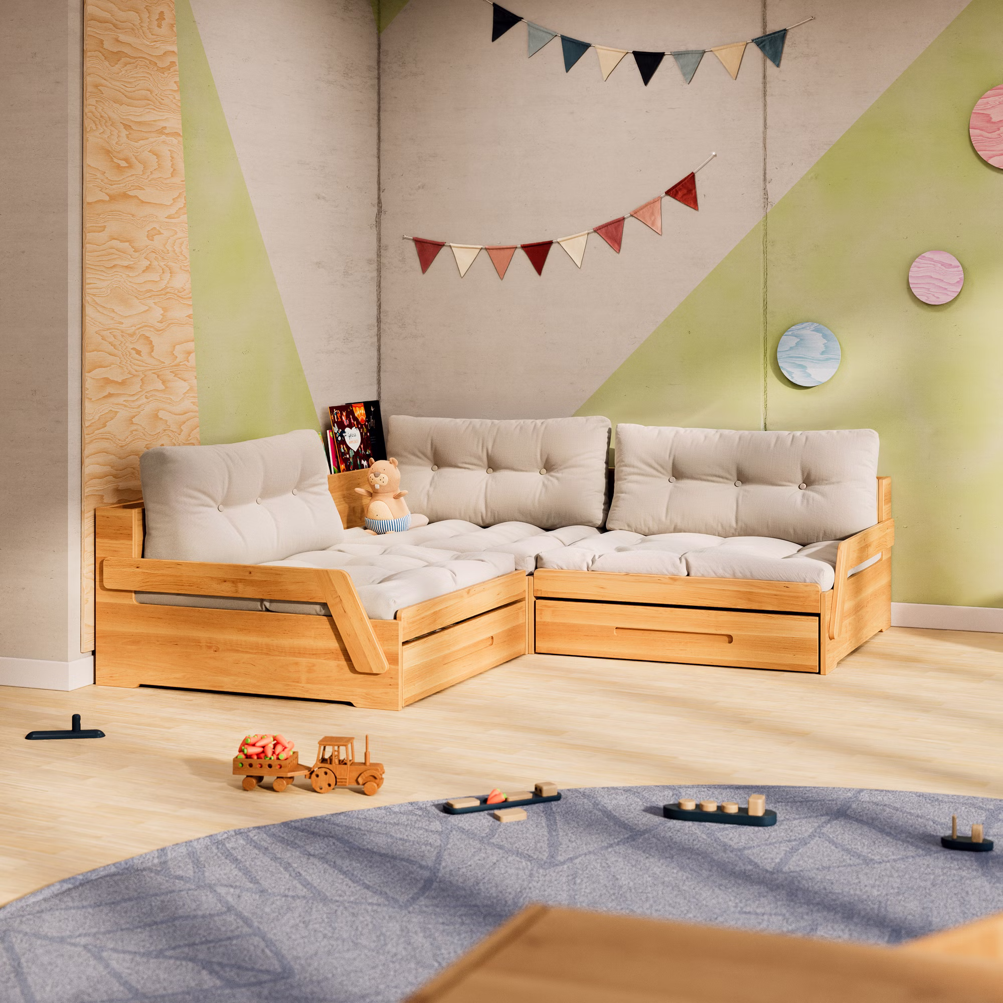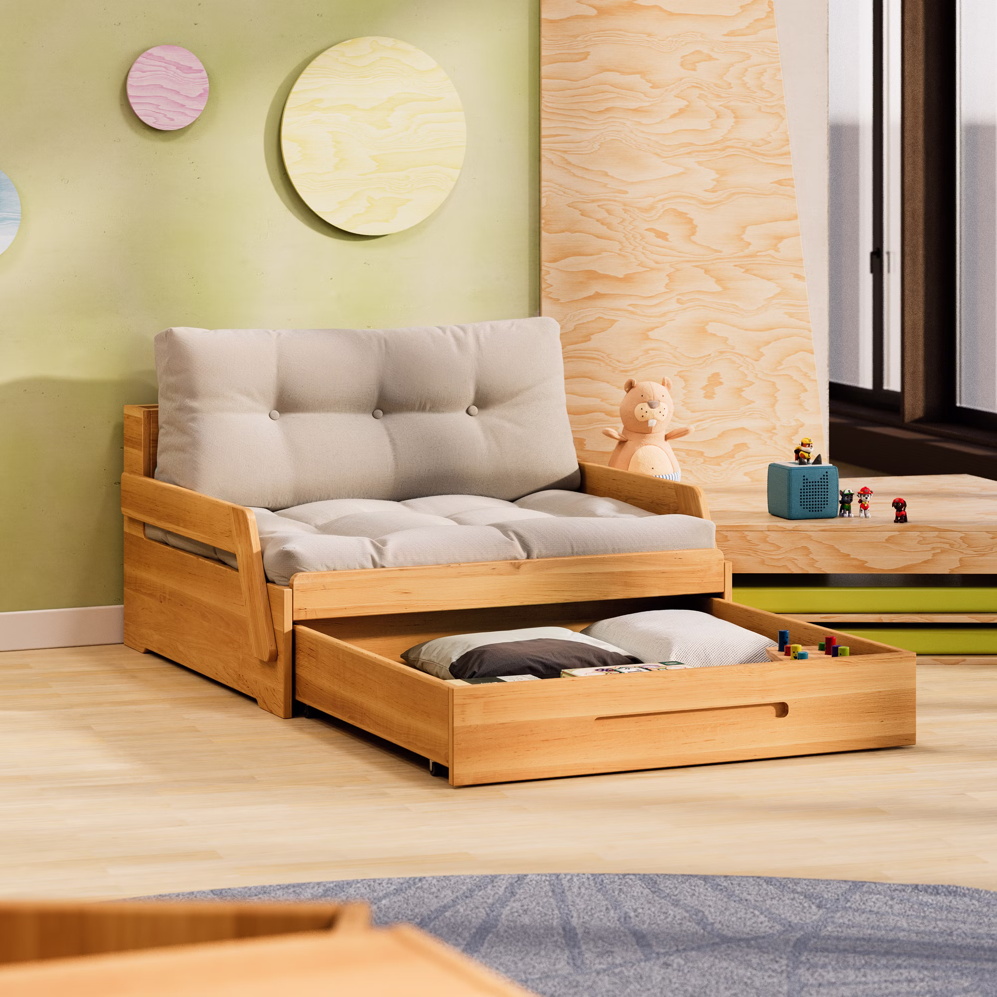 Ein praktischer Bettkasten auf Rollen verschwindet platzsparend unter dem Sofamodul und bietet reichlich Stauraum für Bettwäsche, Kissen, Spielzeug oder andere Utensilien – ideal für mehr Ordnung im Kinderzimmer.