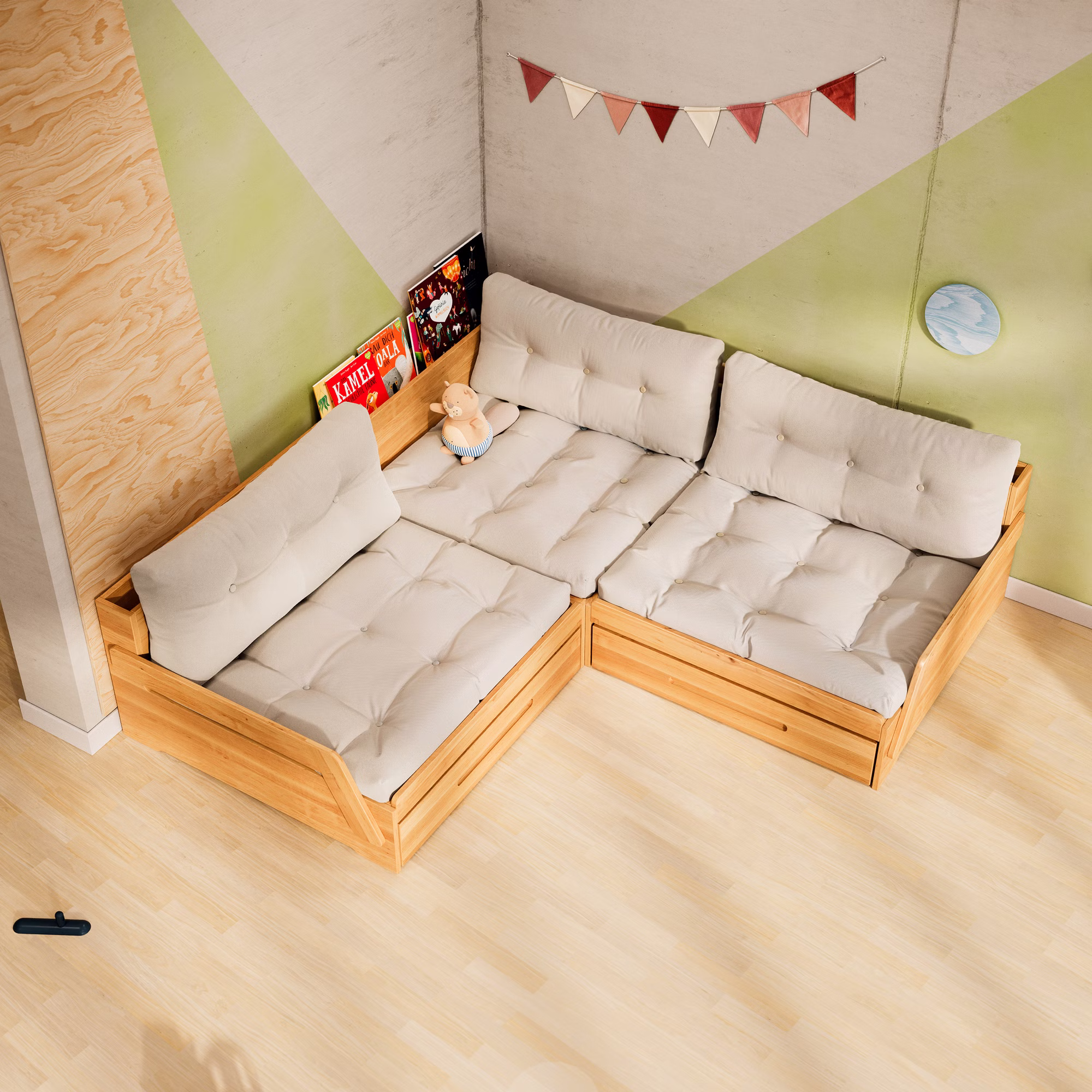 Hier finden Bücher, Lieblingsspielzeug oder andere Schätze ihren Platz – ordentlich verstaut und jederzeit griffbereit. Das Sofaelement ist zudem mit einem stabilen Lattenrost ausgestattet, der für ergonomischen Liegekomfort sorgt – ideal für kleine Ruhepausen oder das tägliche Mittagsschläfchen.