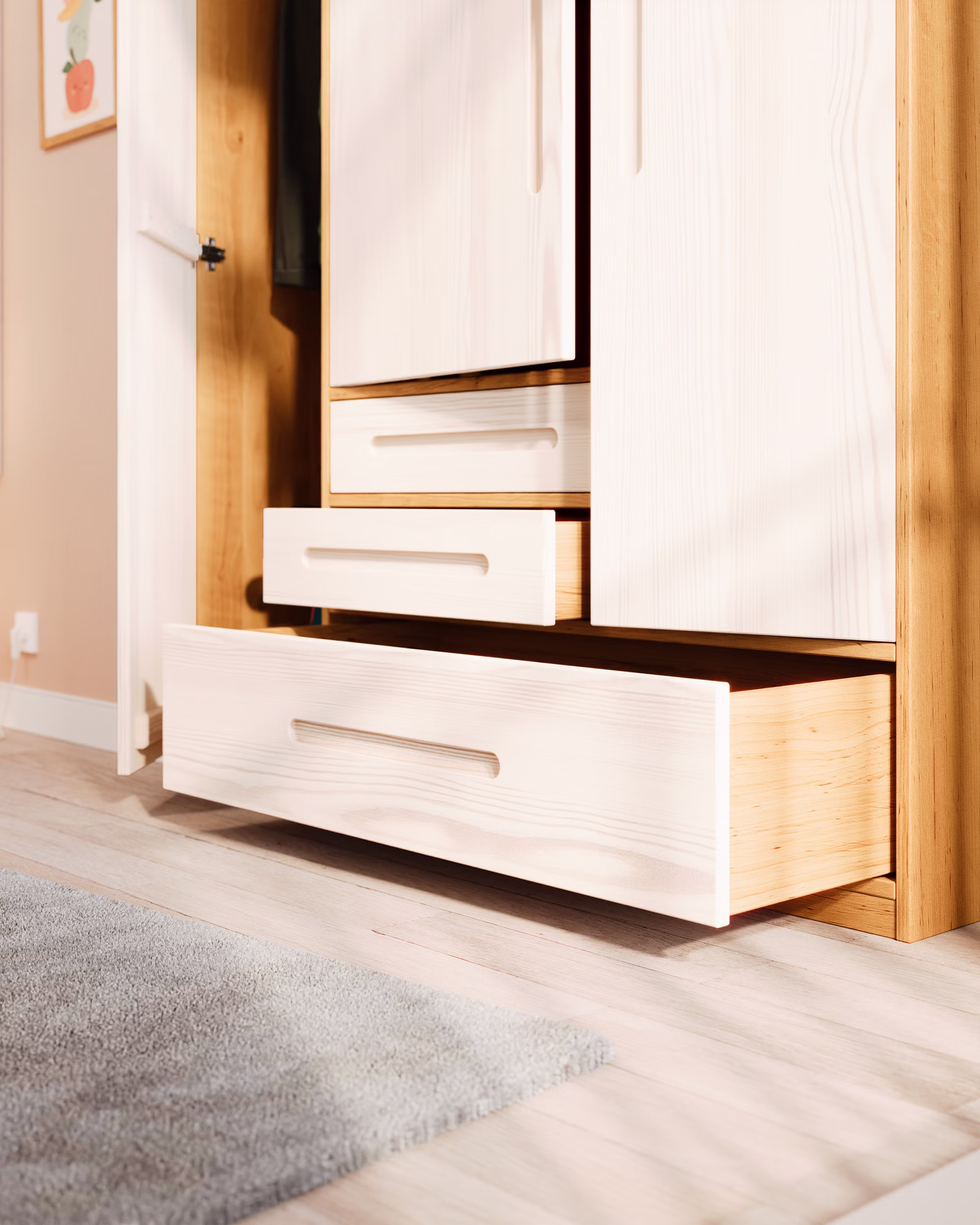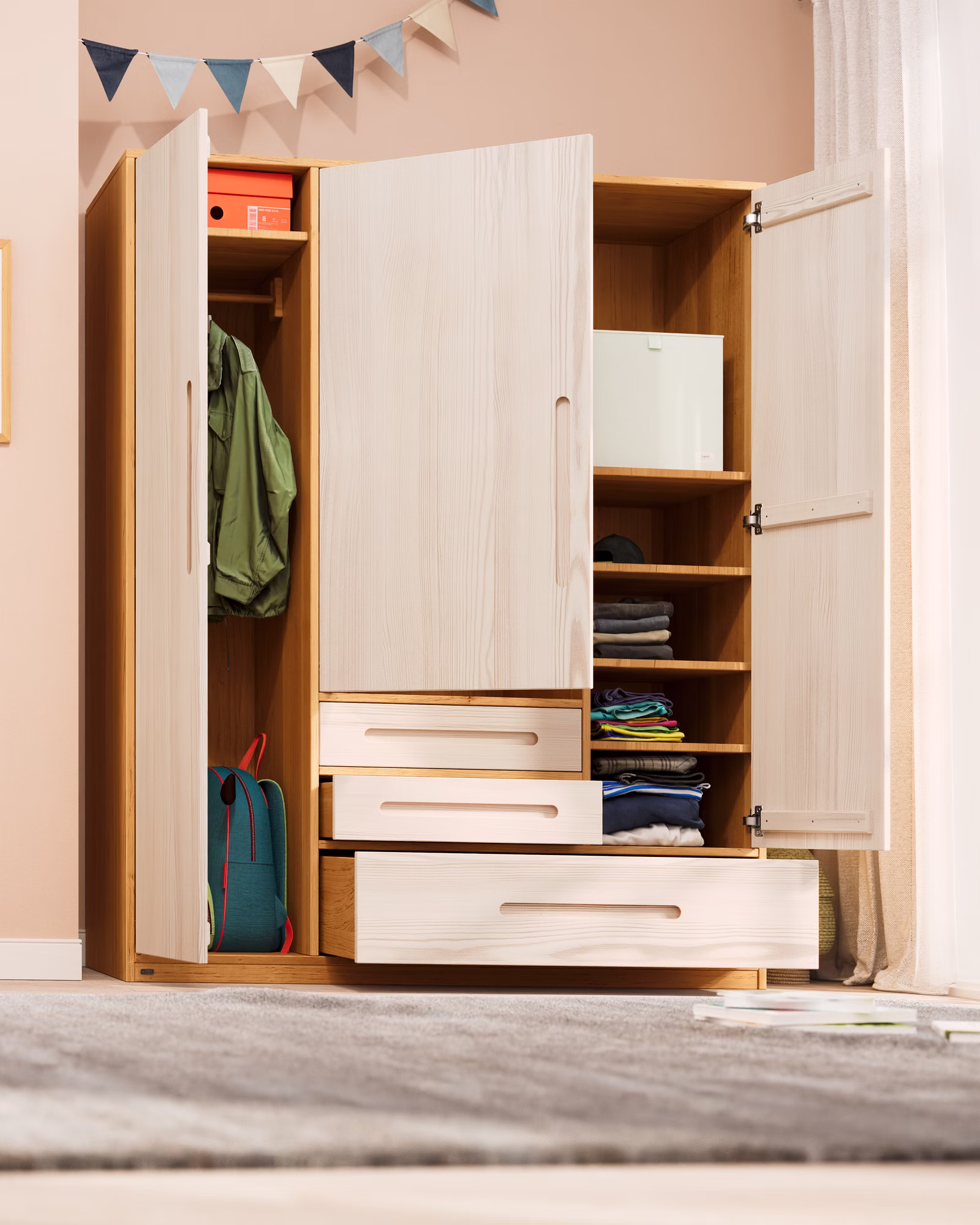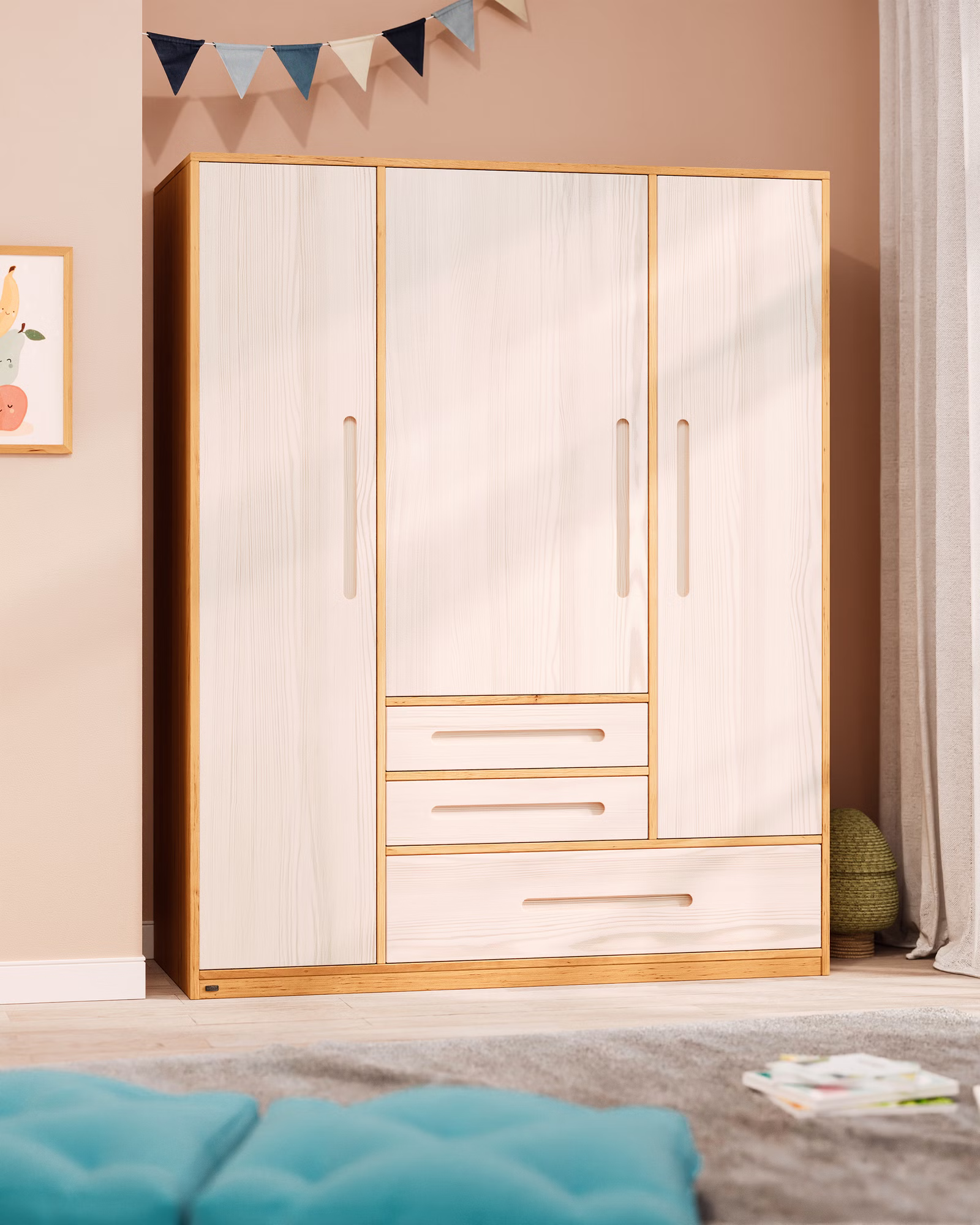 Unser 3-türiger Lina Kleiderschrank wird aus ökologischem Massivholz gefertigt und sorgt dank ausreichendem Platz und einer flexiblen Innenaufteilung schnell für Ordnung und Übersichtlichkeit. Der Kleiderschrank fällt durch sein modernes geometrisches Design und die elegant gefrästen Griffmulden auf. Als Teil unserer zeitlosen Lina Möbelserie fügt sich der Schrank harmonisch in jedes Kinder- und Jugendzimmer ein.