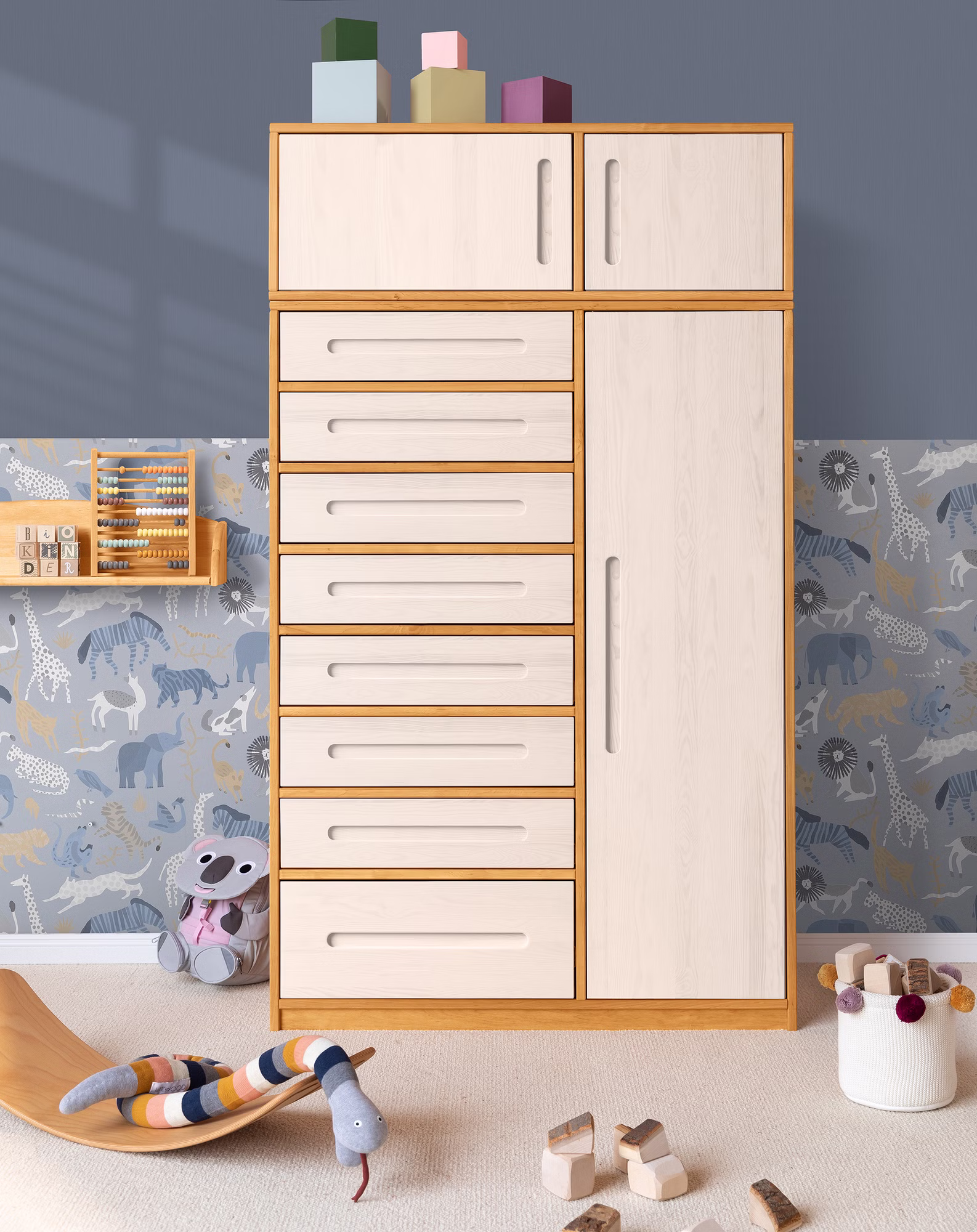 Unser Lina Kommodenschrank mit Aufsatz findet in jedem Kinder- und Schlafzimmer, aber auch im Flur als Garderobenschrank Platz. Die acht leichtlaufenden Schubladen des Kommodenschranks sind mit Selbsteinzug und Soft-Close-Mechanismus für sicheres und geräuscharmes Schließen ausgestattet. Zudem lassen sie sich voll ausziehen und bieten so einen einfachen Einblick bis in den hintersten Bereich der Schubkästen.